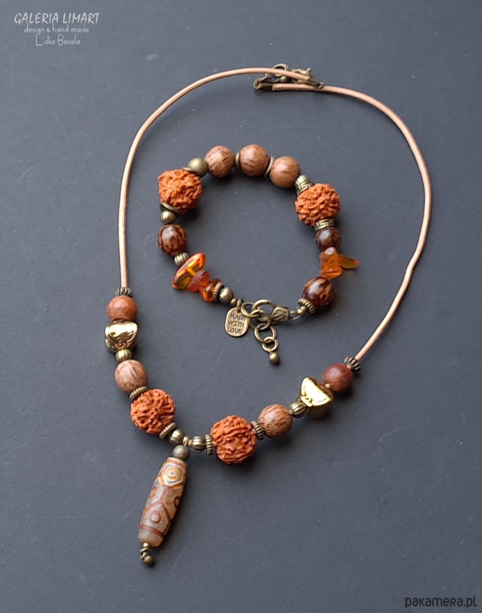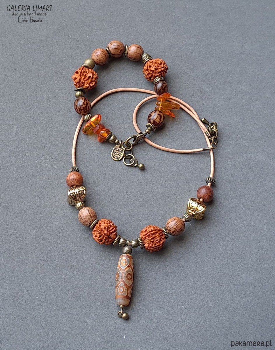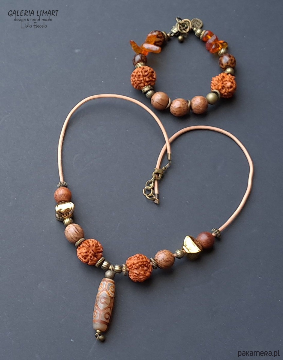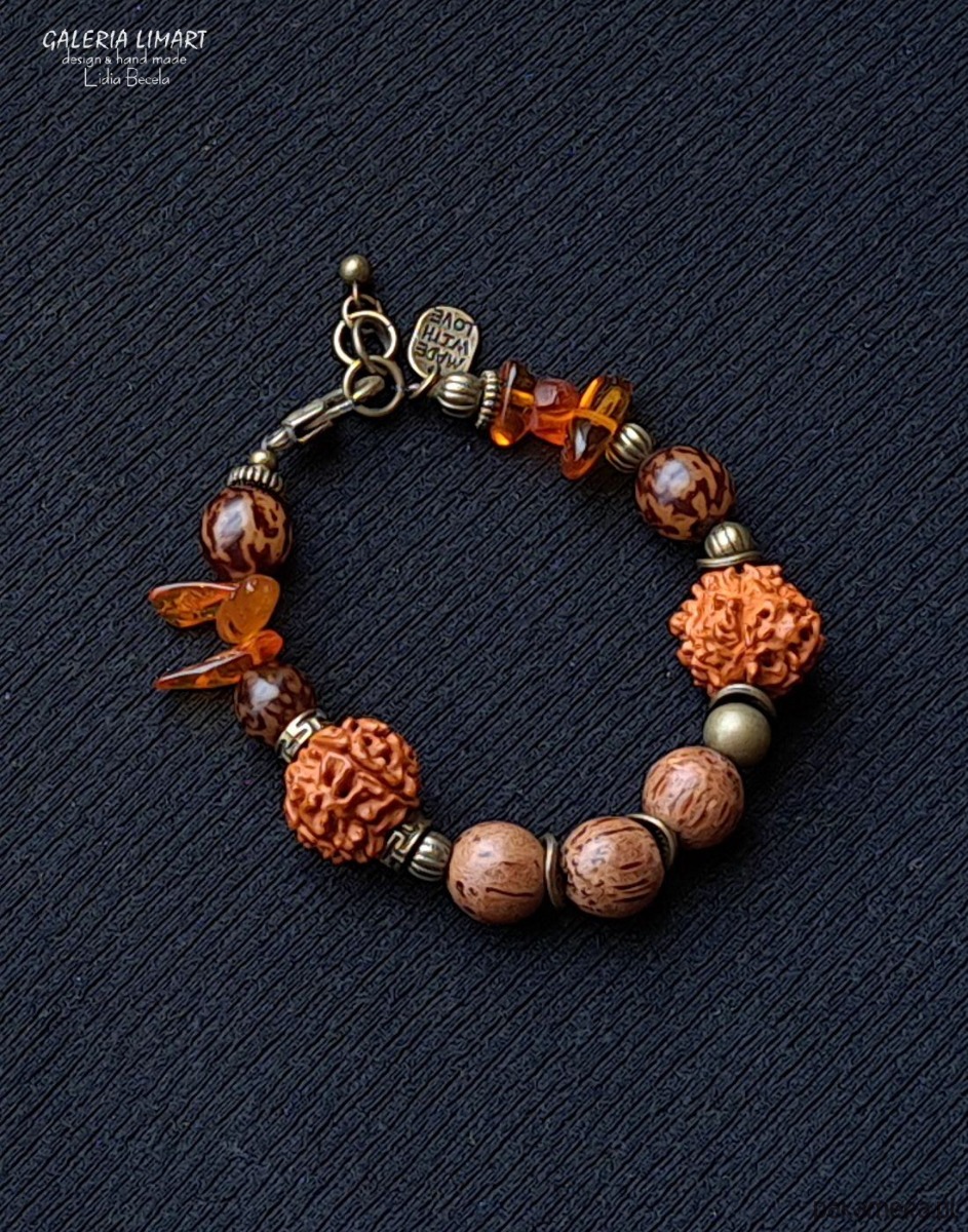 Rudraksha i bursztyn w niezwykłej etnicznej bransoletce unikat handmade UNISEX