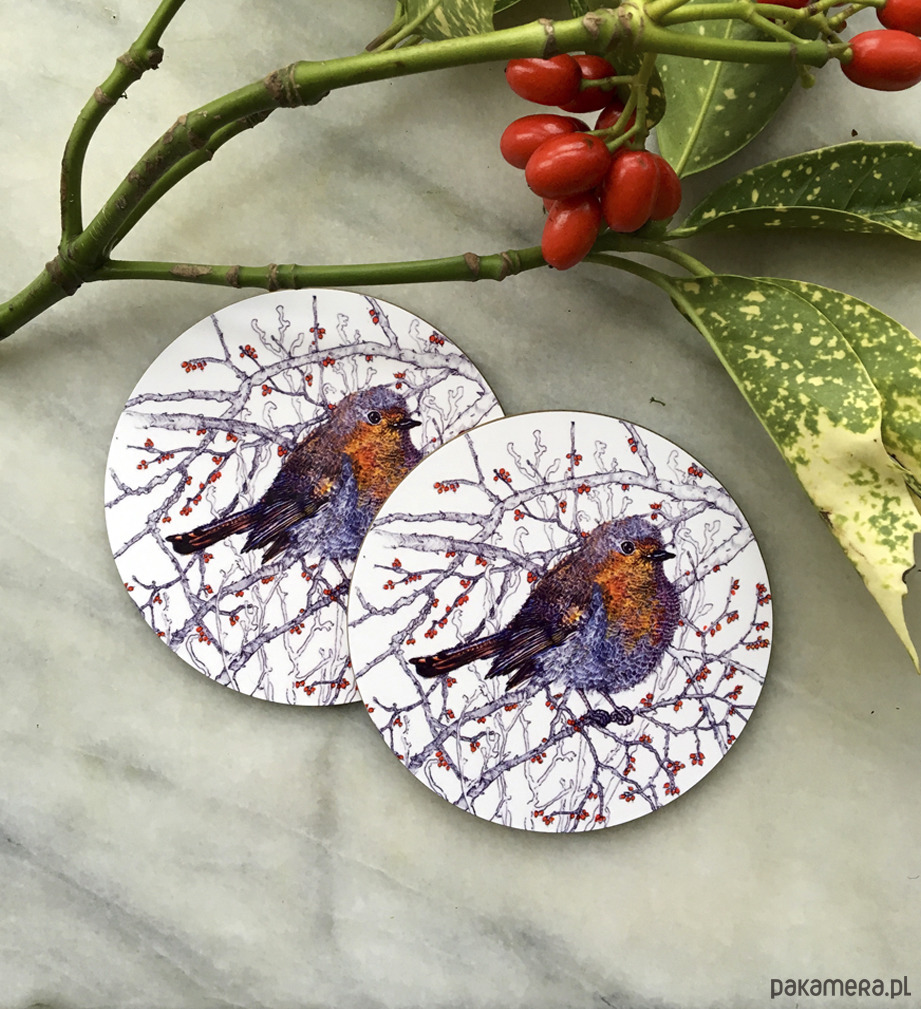 Komplet dwóch błyszczących podkładek pod kubek z autorską ilustracją.