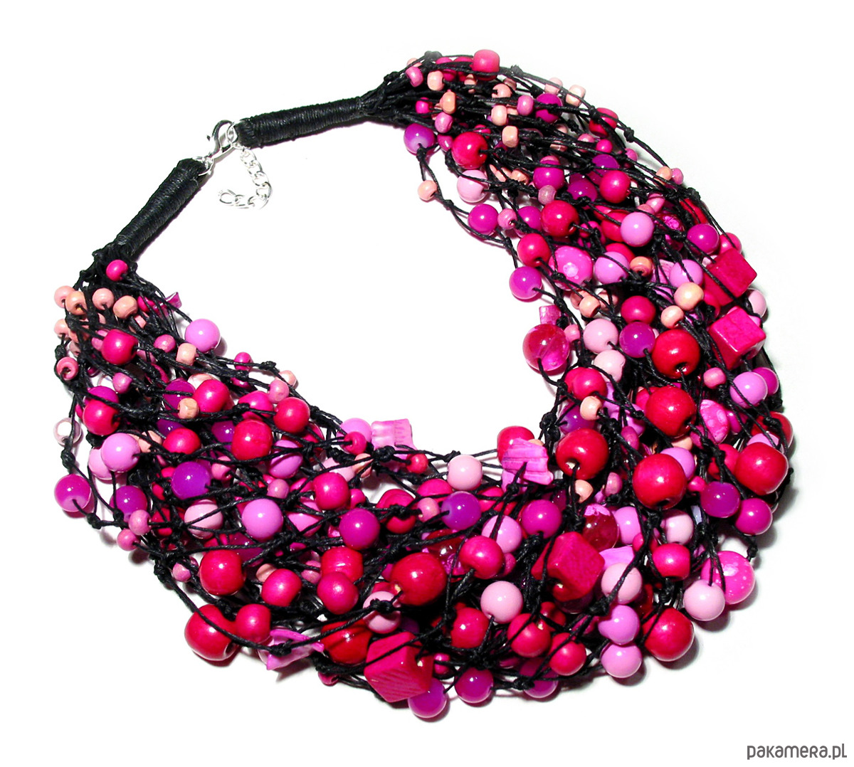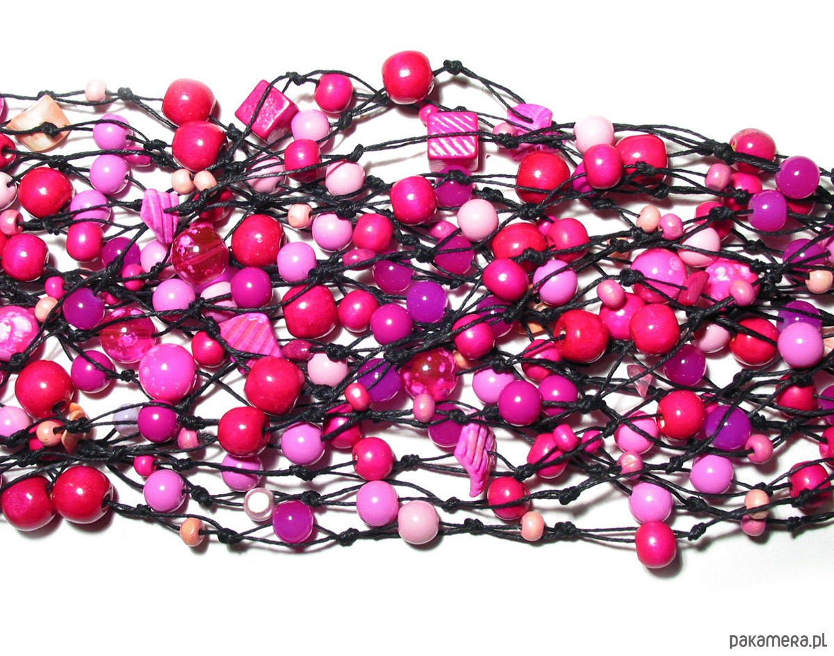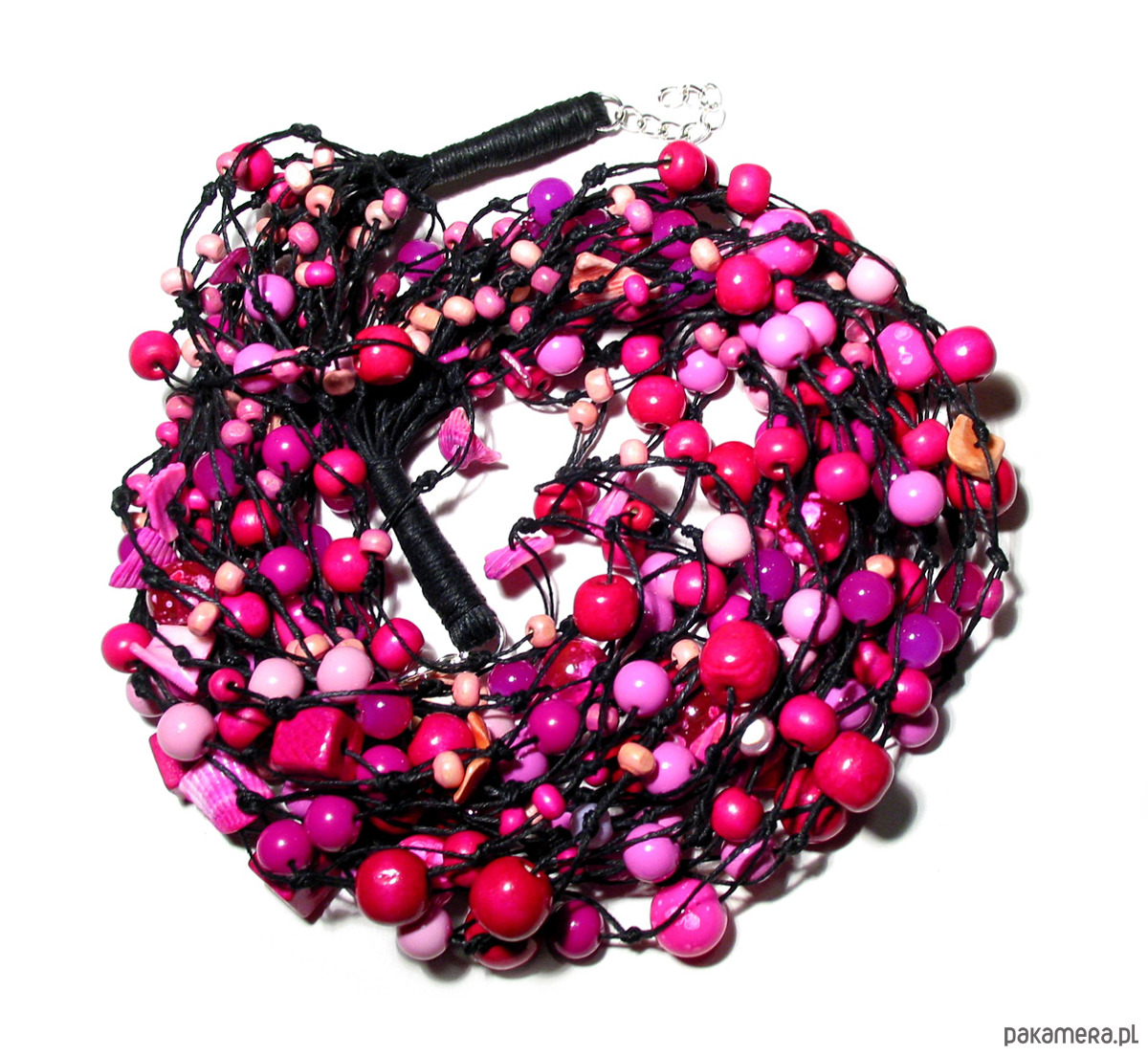 Nasycony i bardzo energetyczny naszyjnik wykonany na czarnej przędzy lnianej z korali w odcieniach kwitnących róż.