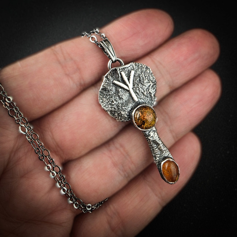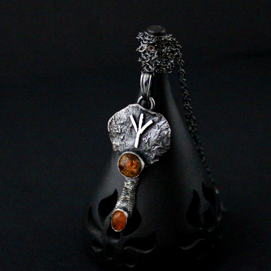 Runa Algiz z bursztynami - oksydowany srebrny naszyjnik