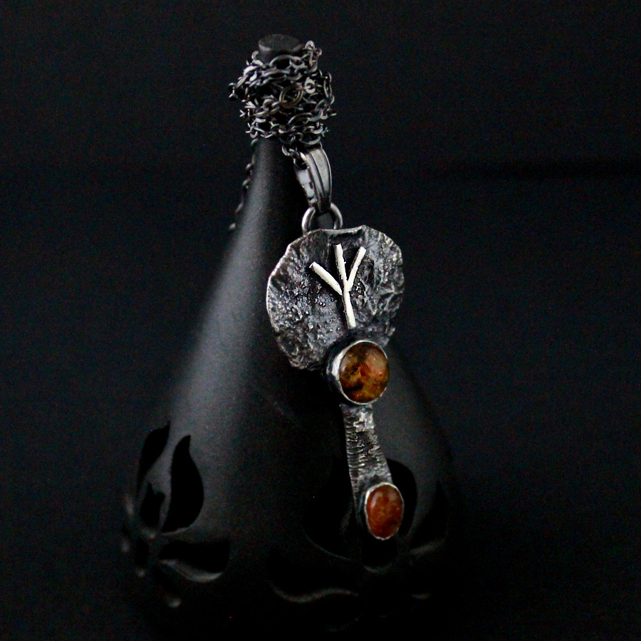 Praca została wykonana w całości ręcznie – od formowania blachy i runy, przez lutowanie, aż po zakuwanie bursztynu. Istnieje możliwość stworzenia runy z innym kamieniem na indywidualne zamówienie.