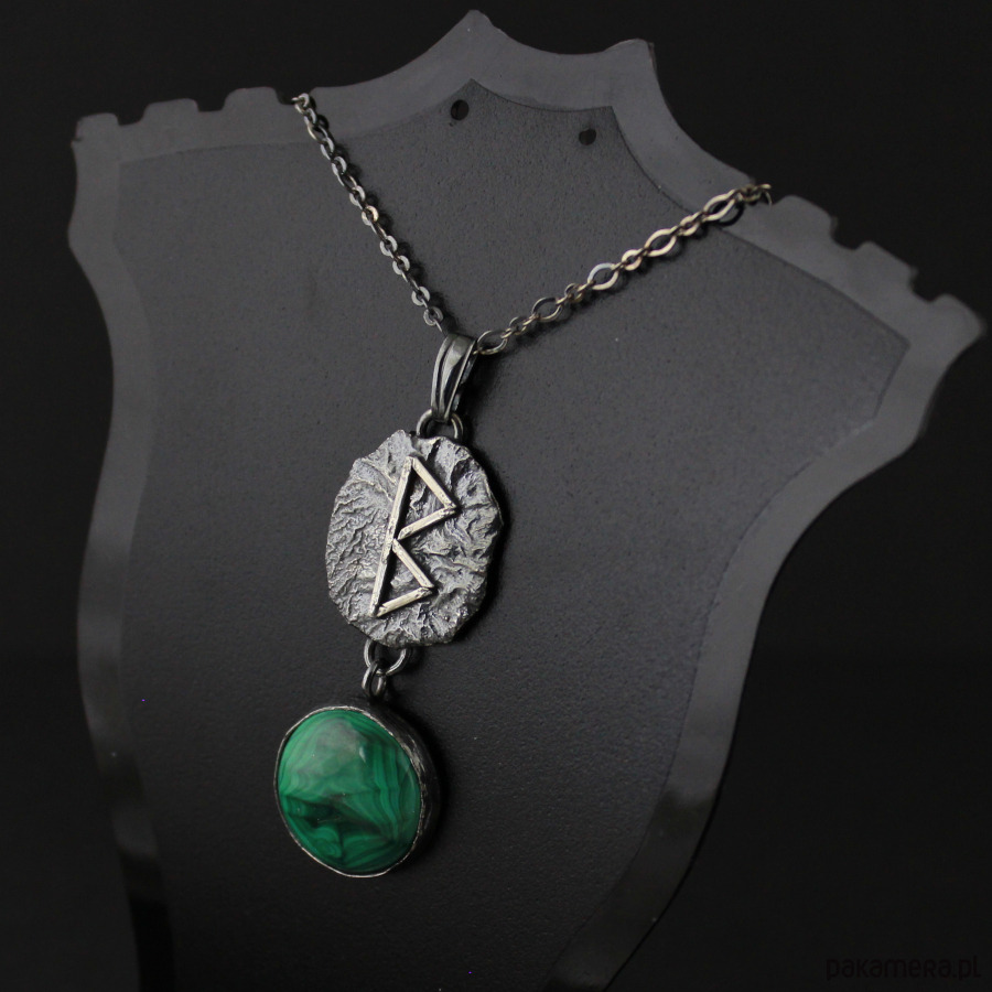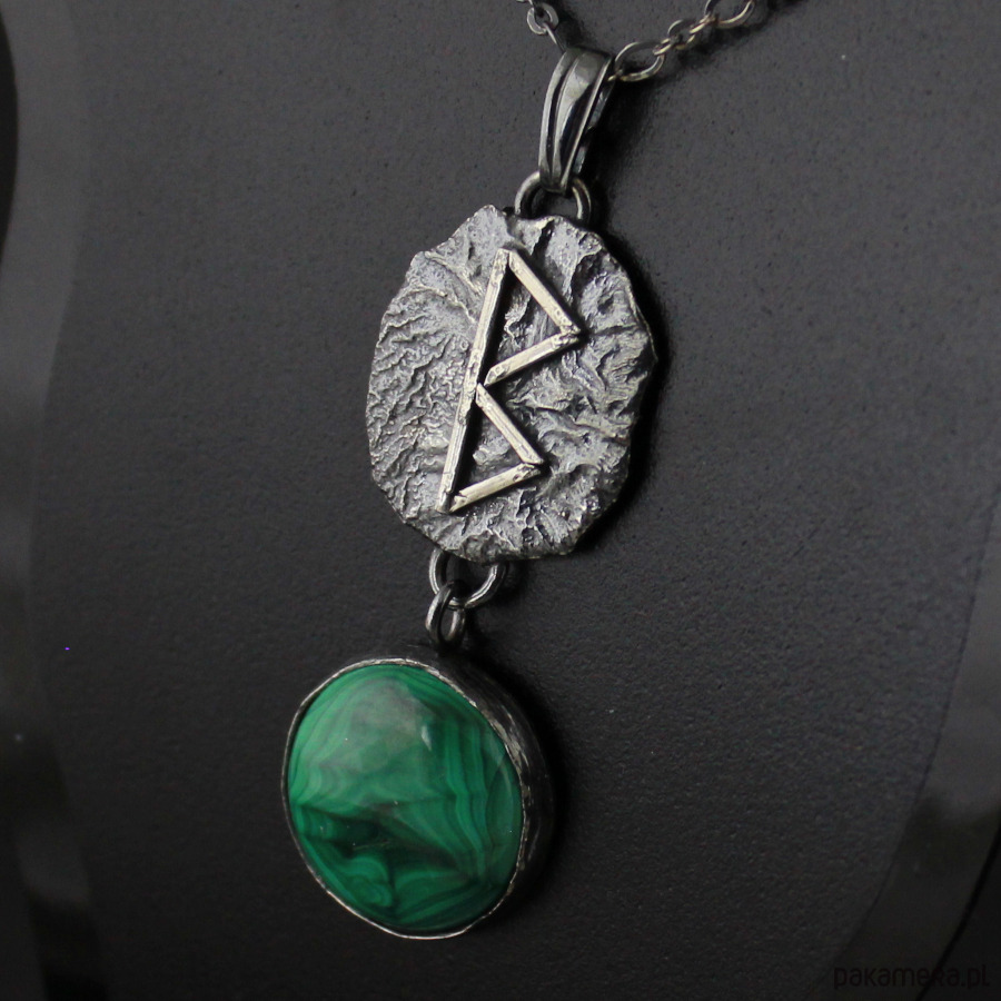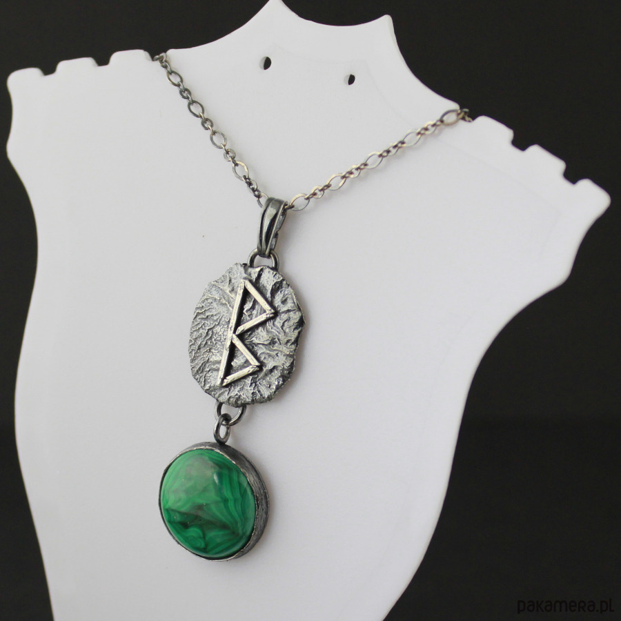 Runa Berkano z malachitem - srebrny talizman runiczny