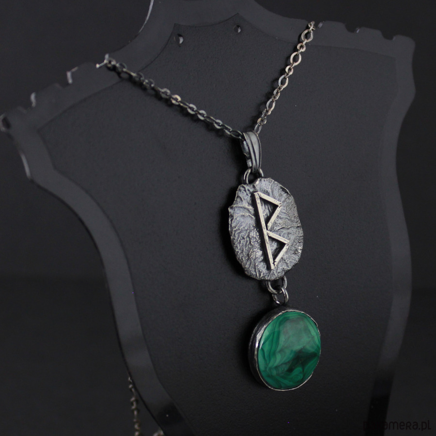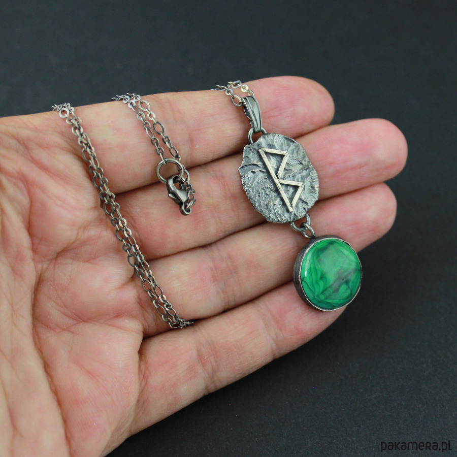 Runa Berkano, należąca do run nordyckich, starogermańskich znaków używanych przez wikingów, od wieków symbolizuje wzrost, płodność, ochronę i początek nowego. Malachit natomiast od dawna uznawany jest za kamień transformacji, wspierający odwagę w zmianie i chroniący przed negatywnymi energiami. Połączenie runy Berkano z malachitem tworzy amulet – talizman wspierający wewnętrzną harmonię, odrodzenie duszy i siłę przemiany.