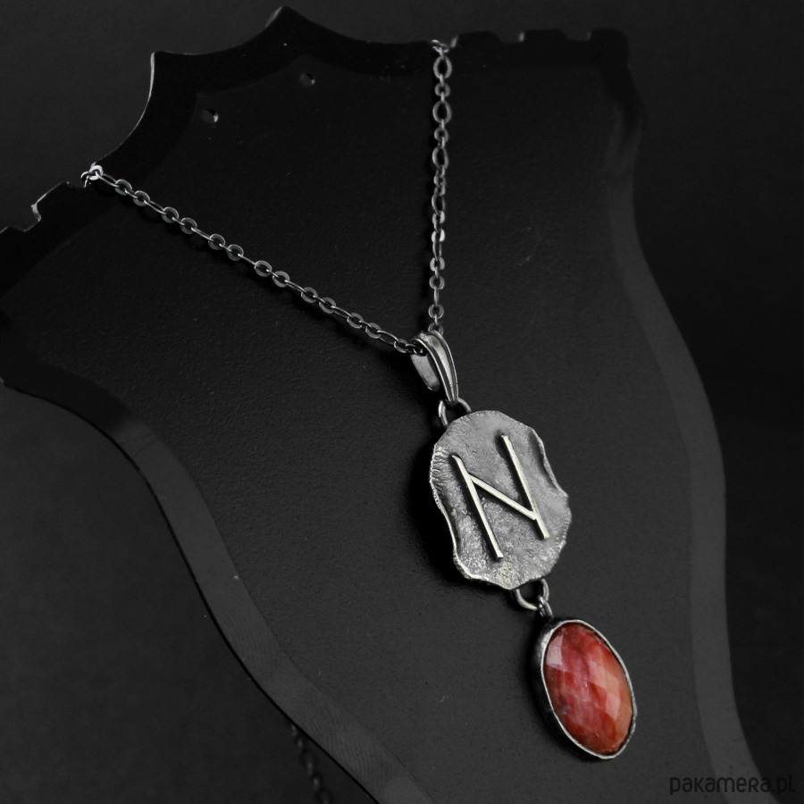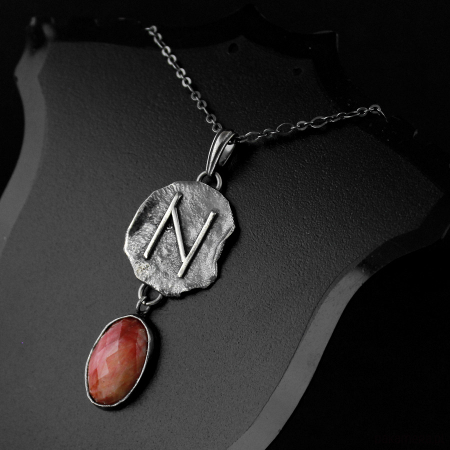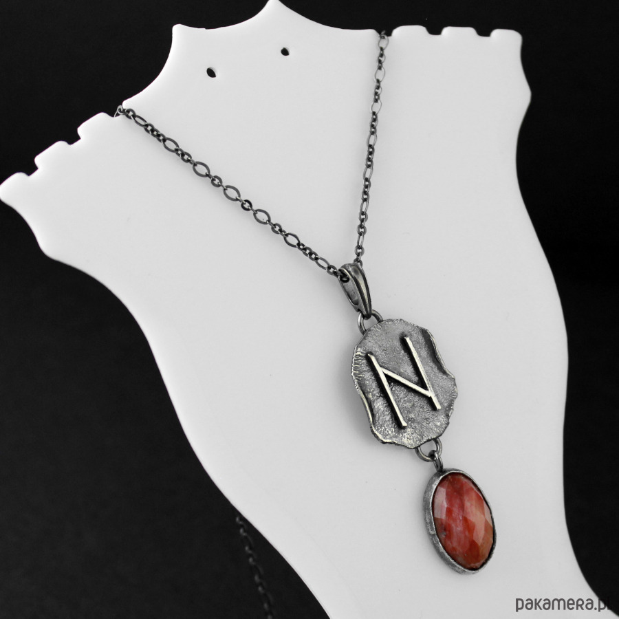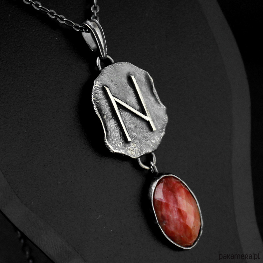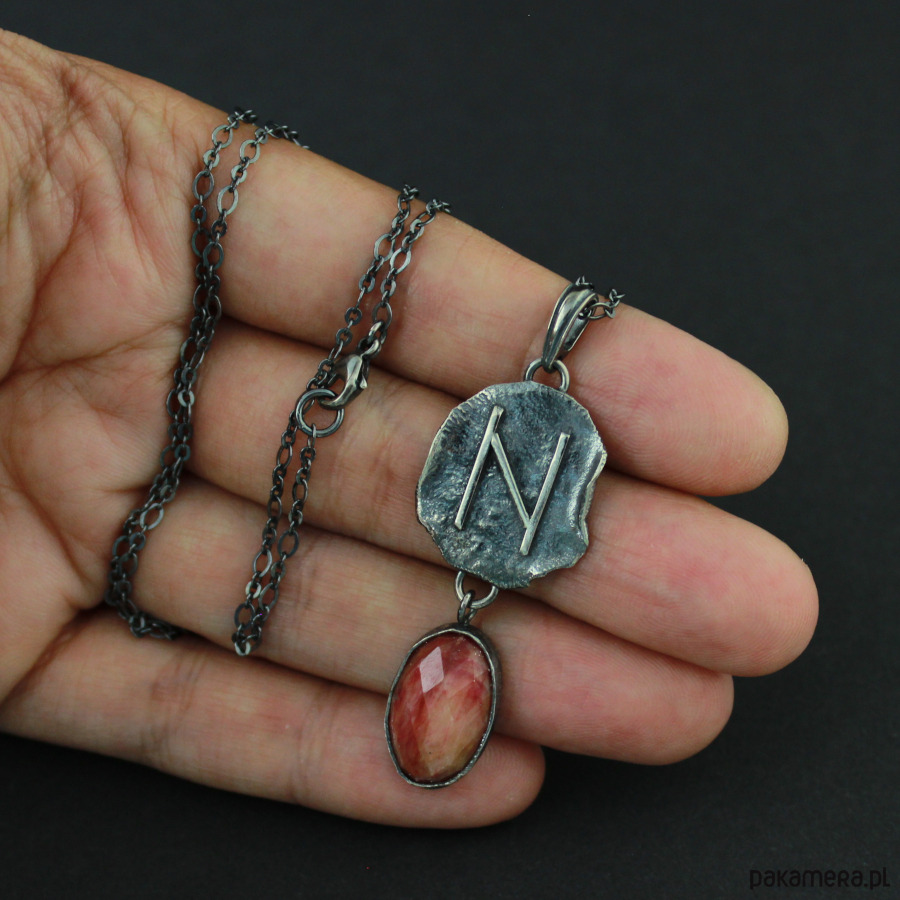 Runa Hagalaz z różowym szafirem - oksydowany srebrny naszyjnik