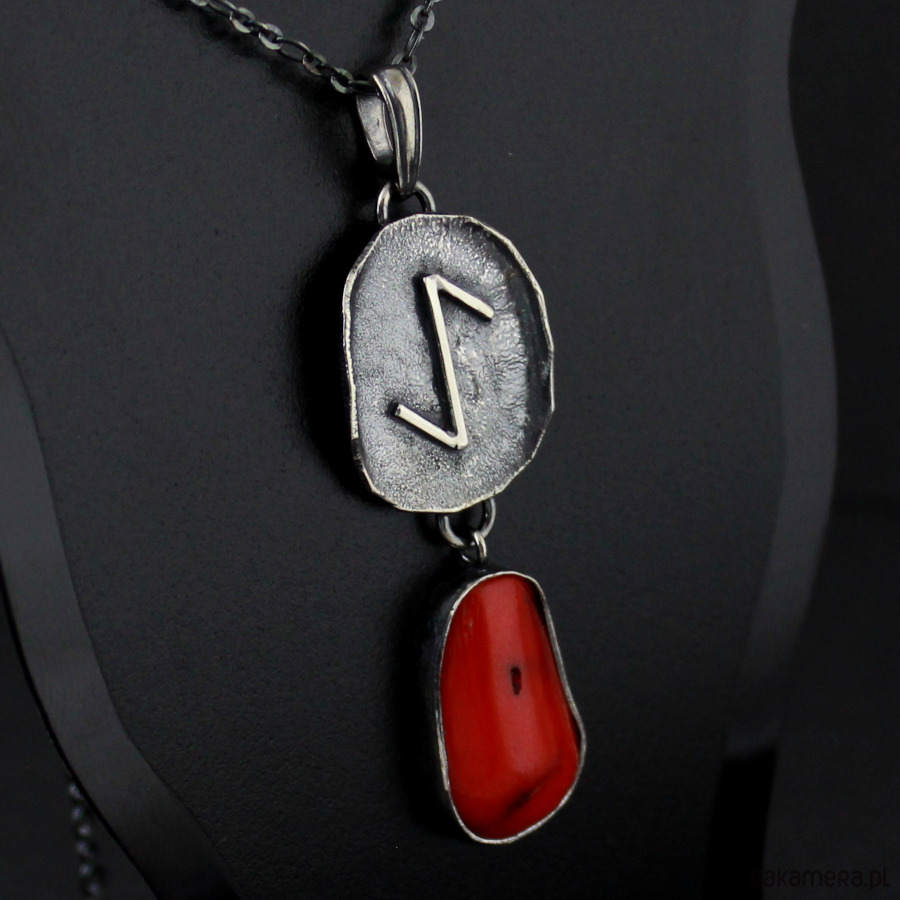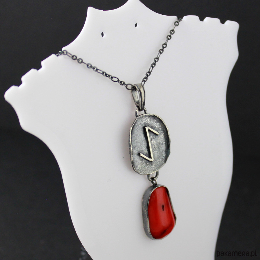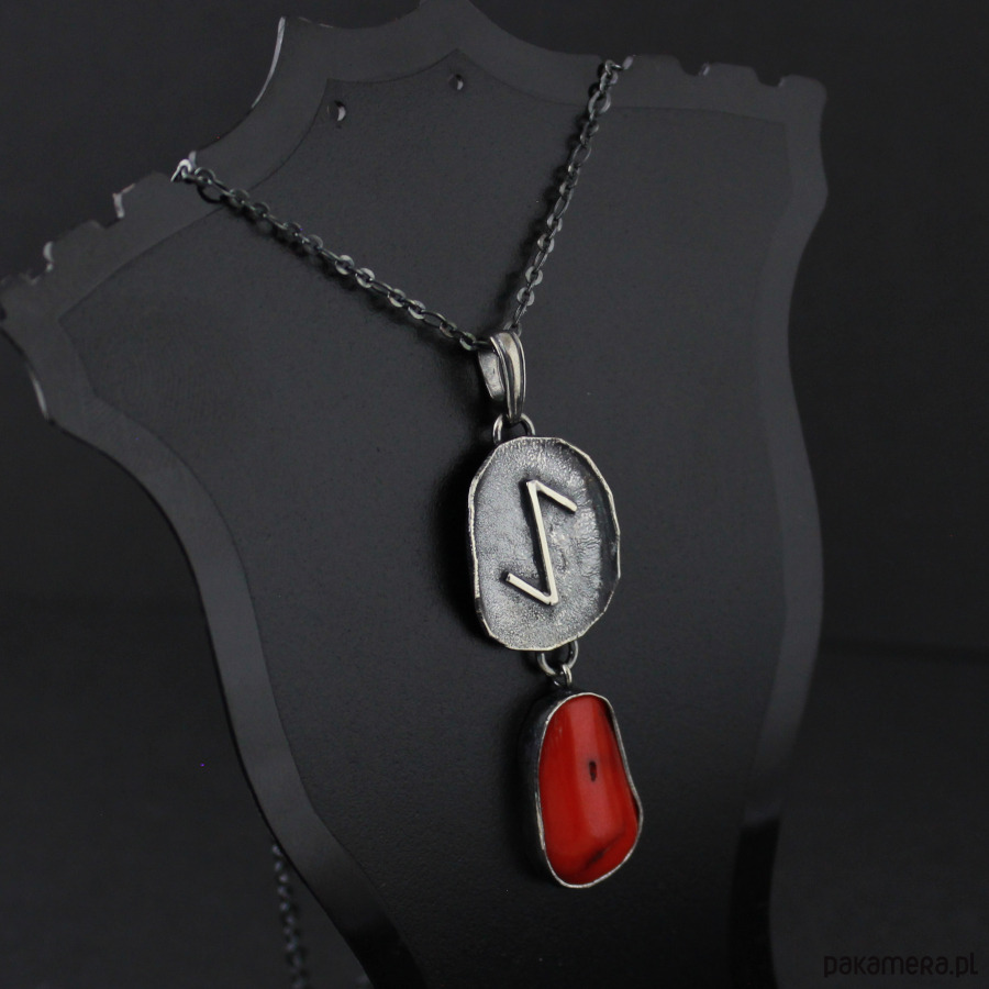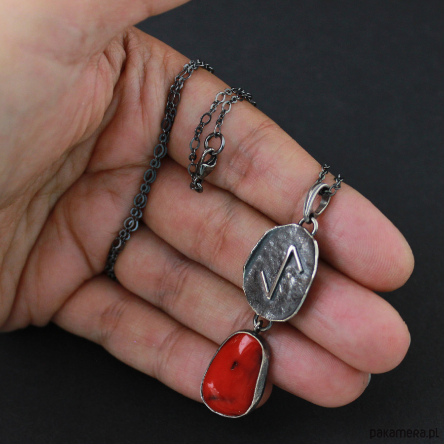 Połączenie runy Eihwaz i koralowego talizmanu tworzy amulet harmonii – zakorzeniony w stabilności, a zarazem pobudzający wewnętrzną pasję. Całość zawieszona jest na łańcuszku o obwodzie około 55 cm (istnieje możliwość innej długości - proszę o wiadomość). Biżuteria zostanie zapakowana w eleganckie etui.