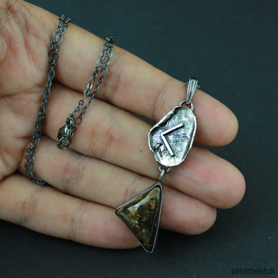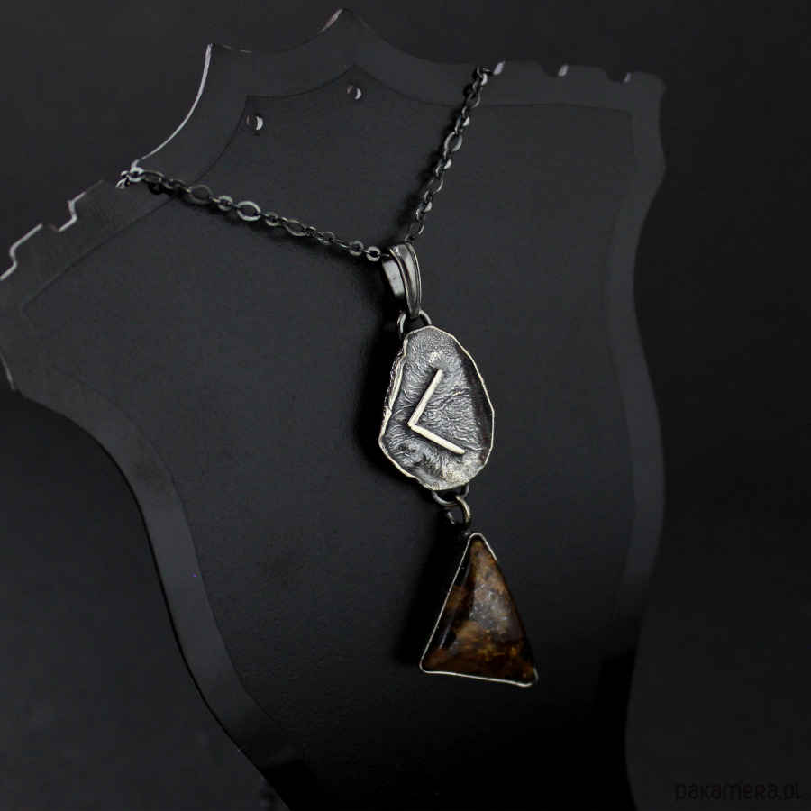 Na ciemnym tle oksydowanego srebra próby 925 wyrasta kształt jak z pradawnej opowieści – runa Kenaz, znana także jako Kaunaz lub Cen. Jej srebrne linie, wypolerowane w miejscach, które dotykało światło, lśnią na tle surowej, nieregularnej faktury metalu, przypominającej powierzchnię starego kamienia wyłowionego z rzeki. Poniżej zawieszony jest bronzyt – kamień w odcieniach głębokiego brązu, czekolady i miodu, z przebłyskami złocistych smug, jak roziskrzony żar wśród popiołów. Jego powierzchnia kryje mozaikę odcieni: od ciemnej, niemal kawowej głębi, po świetliste, karmelowe refleksy, które migoczą przy każdym ruchu. Trójkątny kształt kamienia przywołuje na myśl grot strzały lub fragment pradawnego artefaktu.
