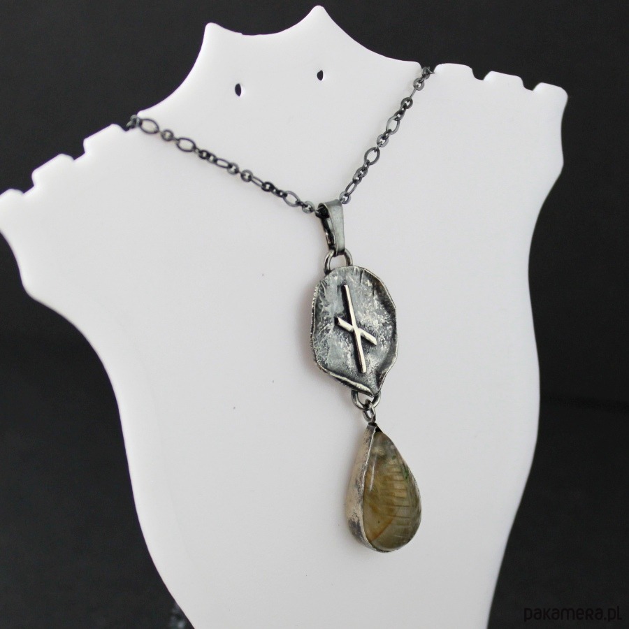 Wisiorek mierzy 5,3 cm długości i 1,5 cm szerokości, łańcuszek ma ok. 55 cm (możliwość zmiany długości na życzenie - proszę o wiadomość). Każdy detal – od formowania srebra po zakuwanie kamienia – wykonano ręcznie. Całość zapakowana w eleganckie etui.
