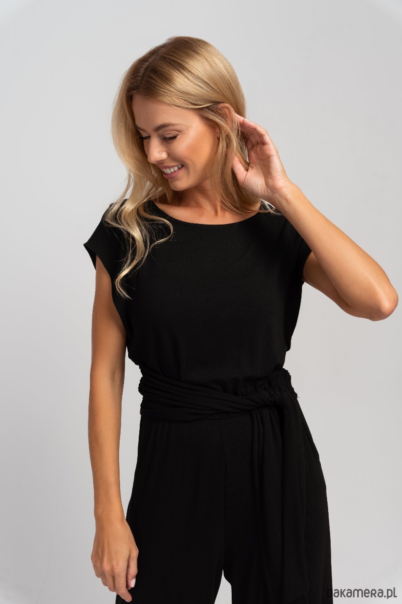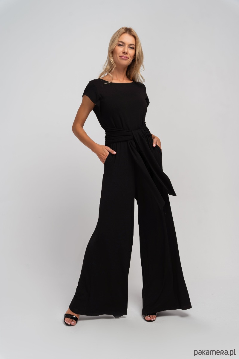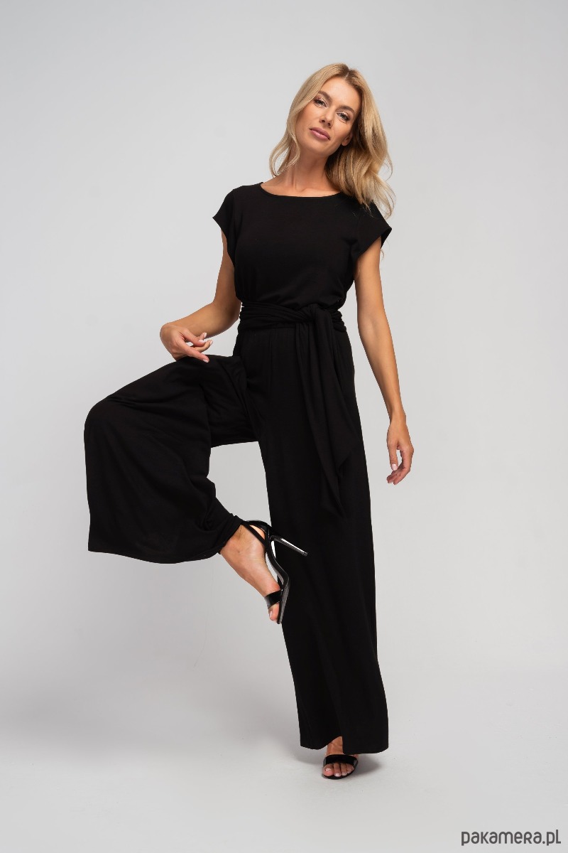 Kombinezon z cienkiej, lejącej dzianiny z elastanem. Długie, szerokie nogawki z wpuszczonymi kieszeniami na biodrach. W pasie wszyta gumka, oraz szeroki wiązany pas. Krótkie rękawki zostały zabezpieczone wstawką pod pachą, aby zapewnić komfort noszenia. Plecy kopertowe z zapięciem na guzik, tworzą wąską łezkę, odsłaniającą plecy. Bardzo wygodny model, który w zależności od dodatków sprawdzi się zarówno na co dzień do klapek jak i na wyjście z eleganckimi akcentami.