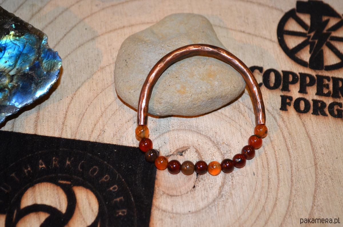 Rustykalna miedziana, ręcznie wykonana bransoleta z paciorkami naturalnego kamienia - agat brązowy. Obwód bransolety to około 17 cm (10 cm miedź, 7cm koraliki). Z uwagi na konstrukcję bransoletki - kamienie umieszczone są na elastycznej gumce jubilerskiej - istnieje możliwość regulacji jej obwodu - samodzielnego dopasowania do potrzeb klienta.Wykonam również w innym rozmiarze na zamówienie klienta. Z uwagi na różnorodność kamieni towar może nieco różnić się od tego na zdjęciu.