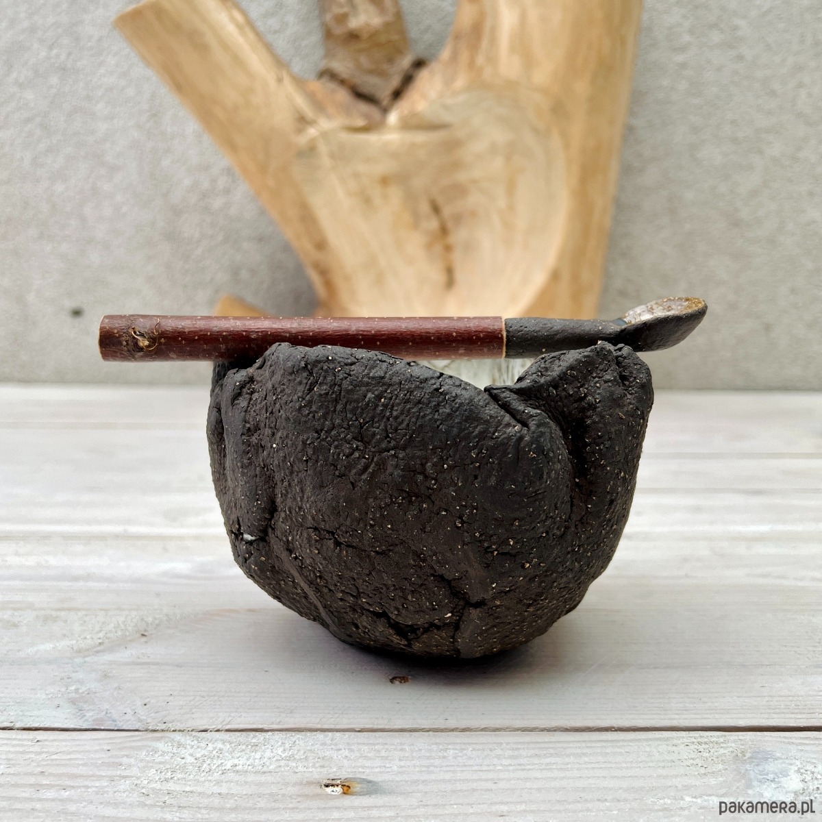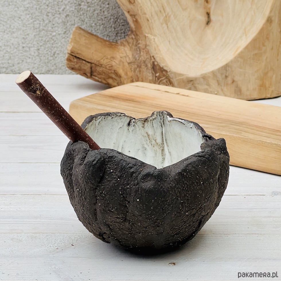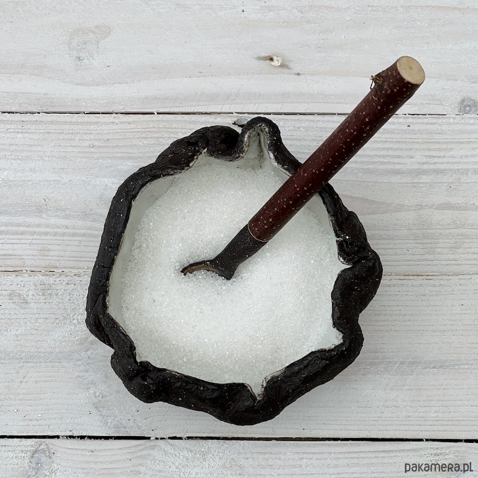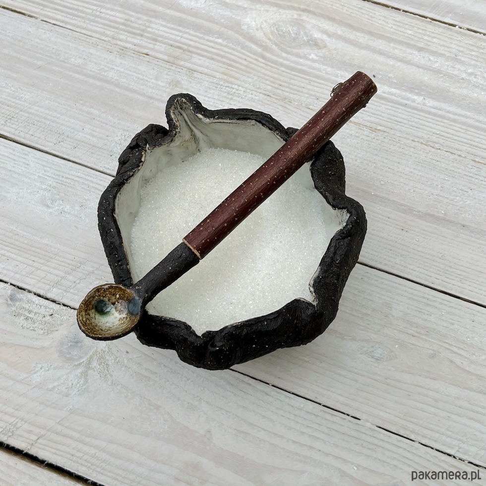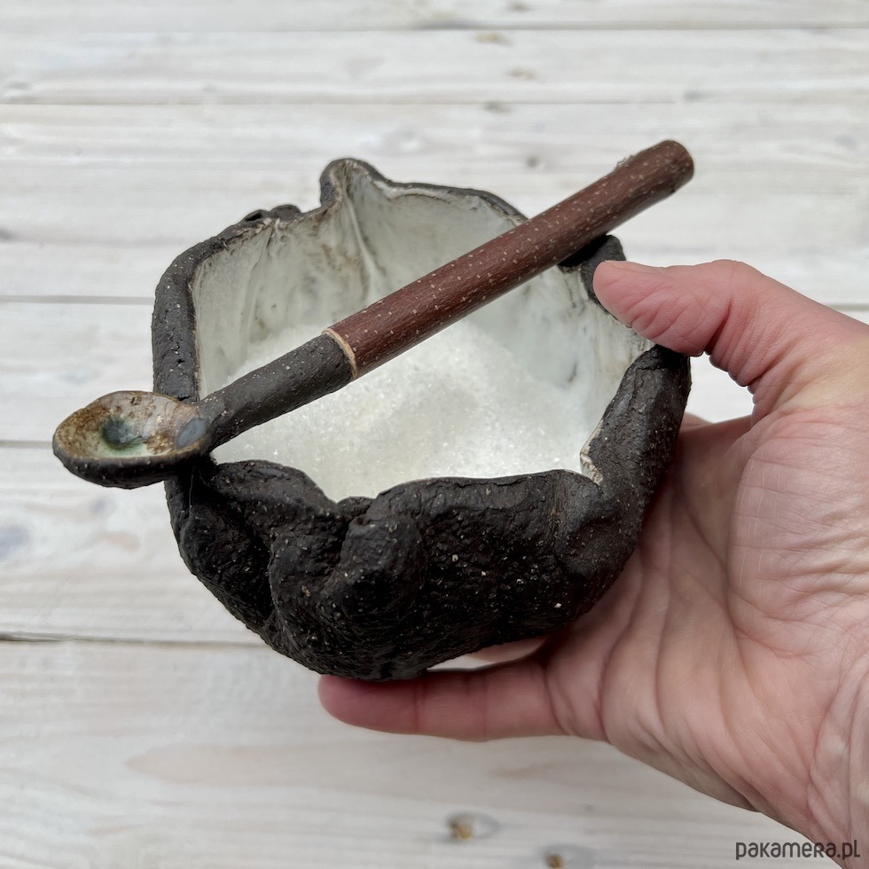 Ta ceramiczna cukiernica z naturalnie powstałą podczas formowania fakturą zewnętrzną i gładkim, perłowo białym wnętrzem została wykonana z szamotowej brązowej gliny. Do cukiernicy dodałam ręcznie wykonaną łyżkę do nabierania. Główka łyżki jest wykonana z tej samej gliny co cukiernica, a rączka z gałązki czereśni. Cukiernica nadaje się do codziennego użytku, sprawdzi się również jako niewielki, rustykalny element dekoracji kuchni. To może być ciekawy prezent na urodziny, pod choinkę lub z okazji przeprowadzki dla osoby ceniącej sobie naturalne, ręcznie robione formy ceramiczne.