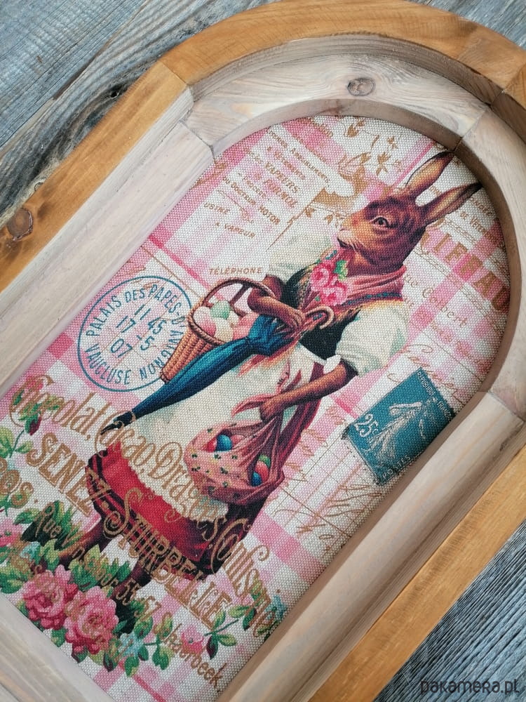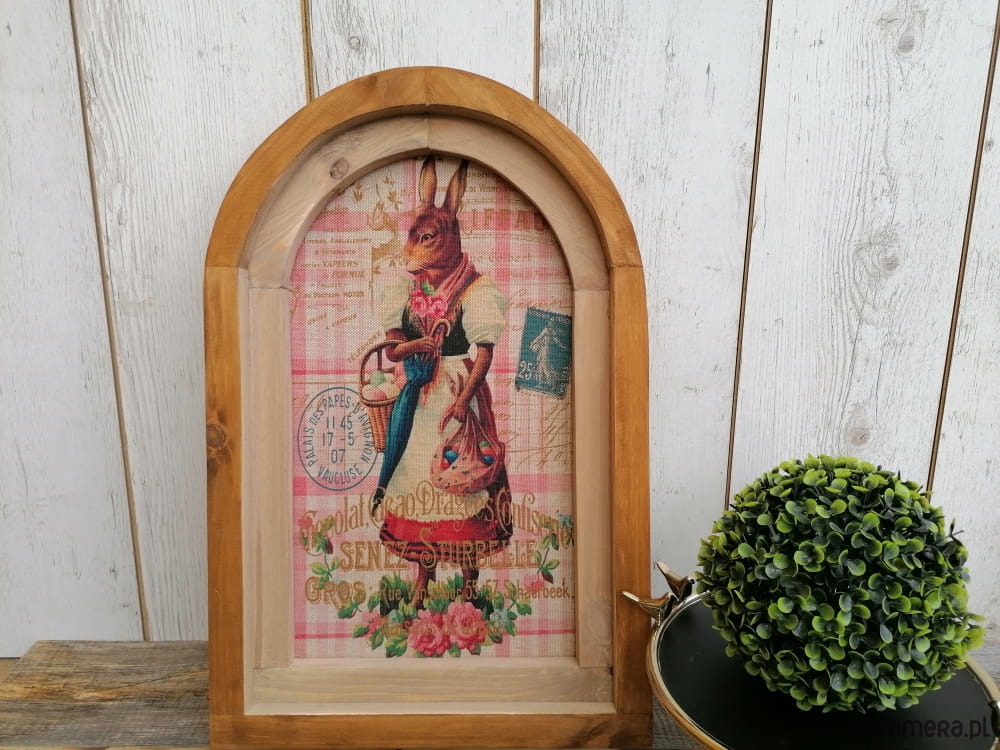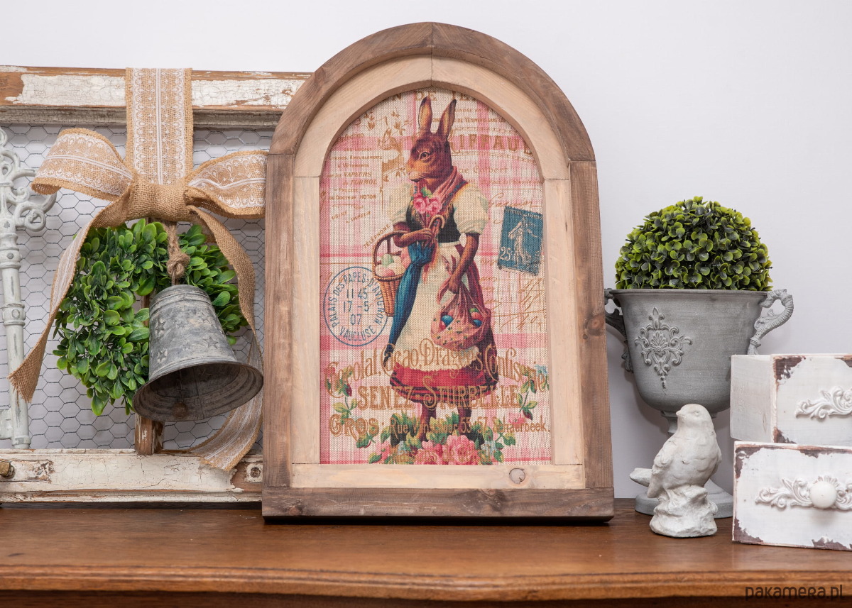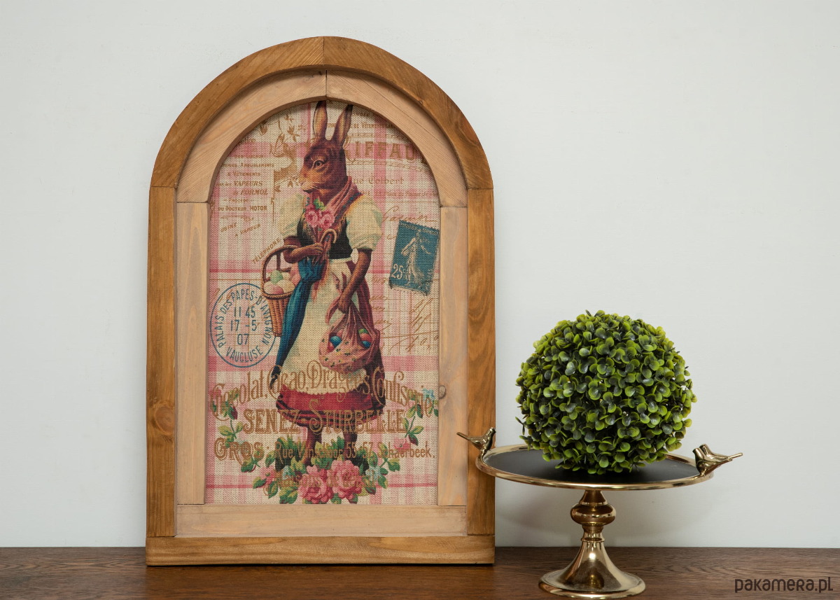 Rustykalna dekoracja ścienna z motywem zajęczycy. W środku drewnianej ramy w kształcie łuku umieściliśmy obraz w stylu vintage drukowany na tkaninie lnianej. Rozmiar dekoracji 37 x 56 cm. Dekoracja posiada zamontowany metalowy wieszak.