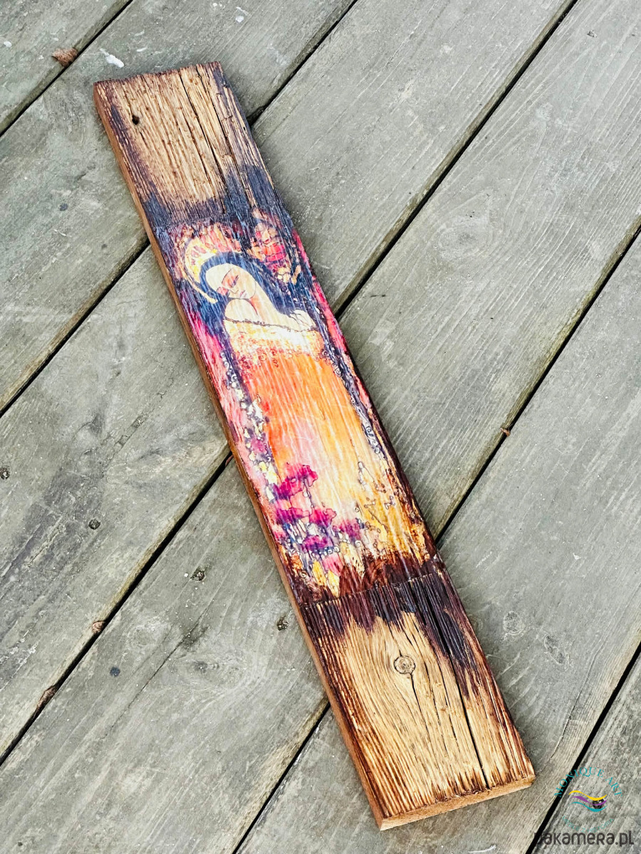 Drewno z historią, zamienione w obraz z aniołem, wnoszący do wnętrza spokój, ciepło i symboliczny wymiar ochrony.