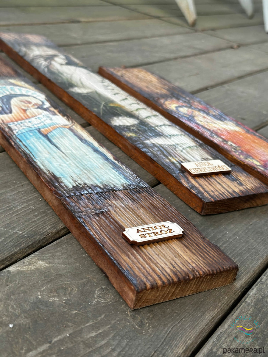 Rustykalna deska z aniołem, prezent, anioł na desce, anioł stróż
