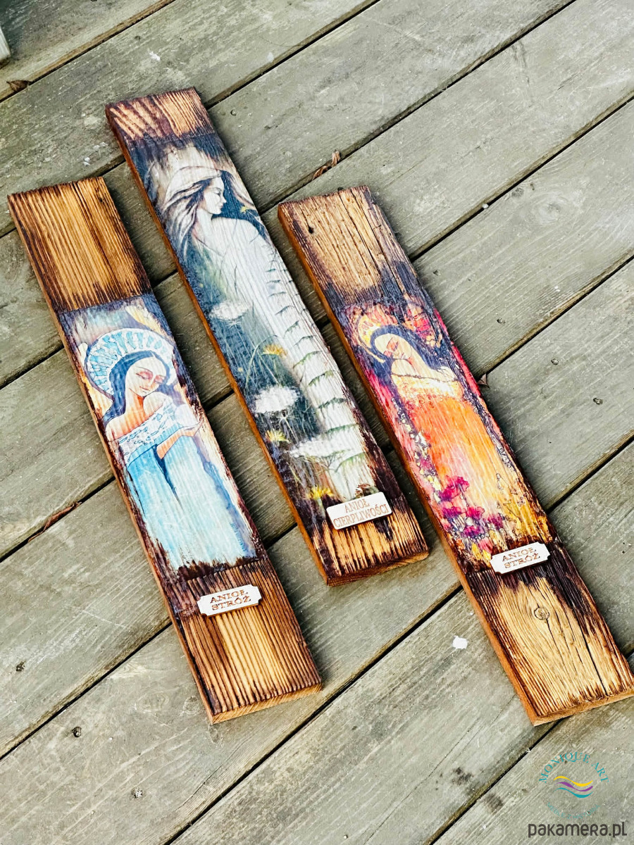 Drewno z historią, zamienione w obraz z aniołem, wnoszący do wnętrza spokój, ciepło i symboliczny wymiar ochrony.