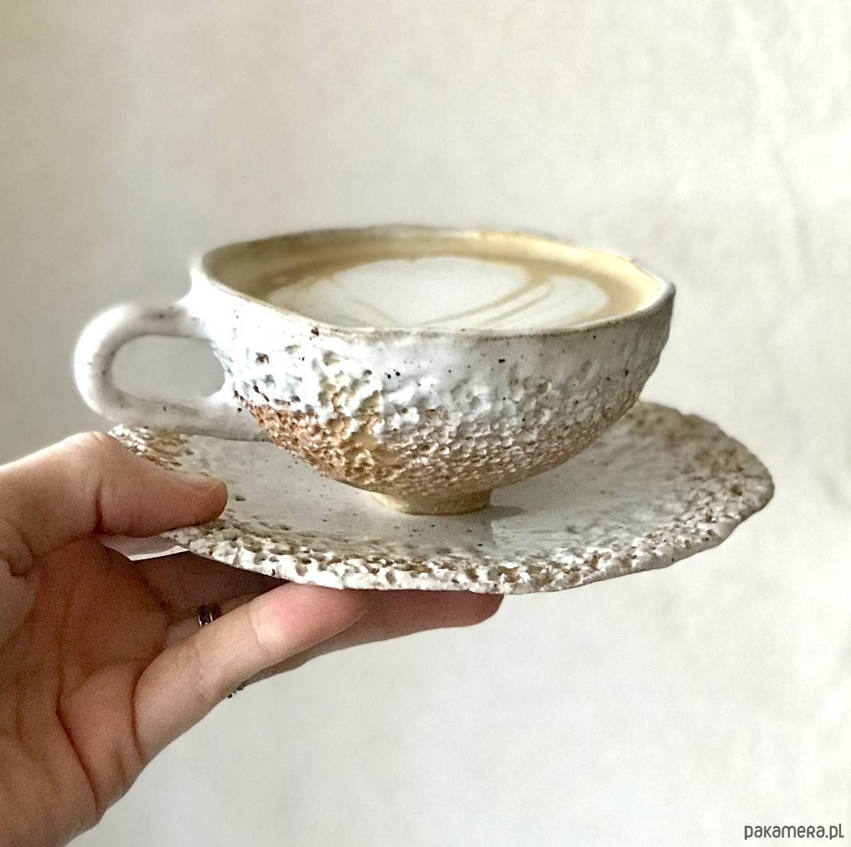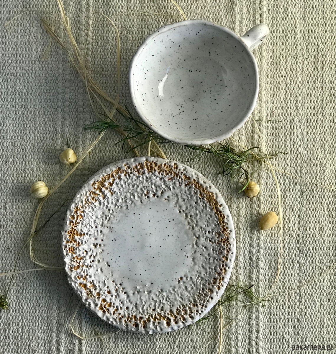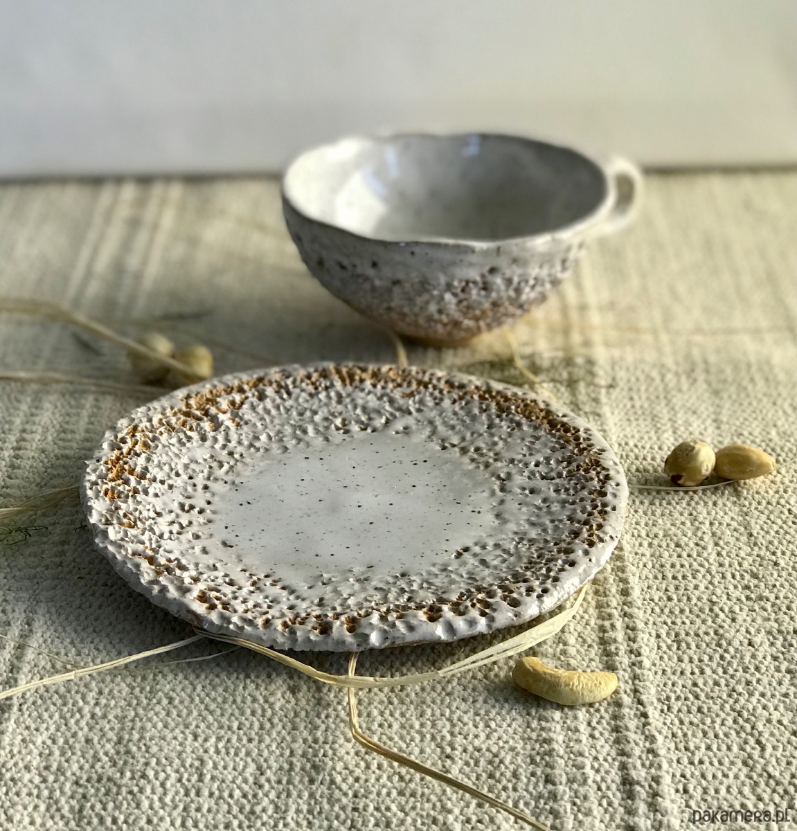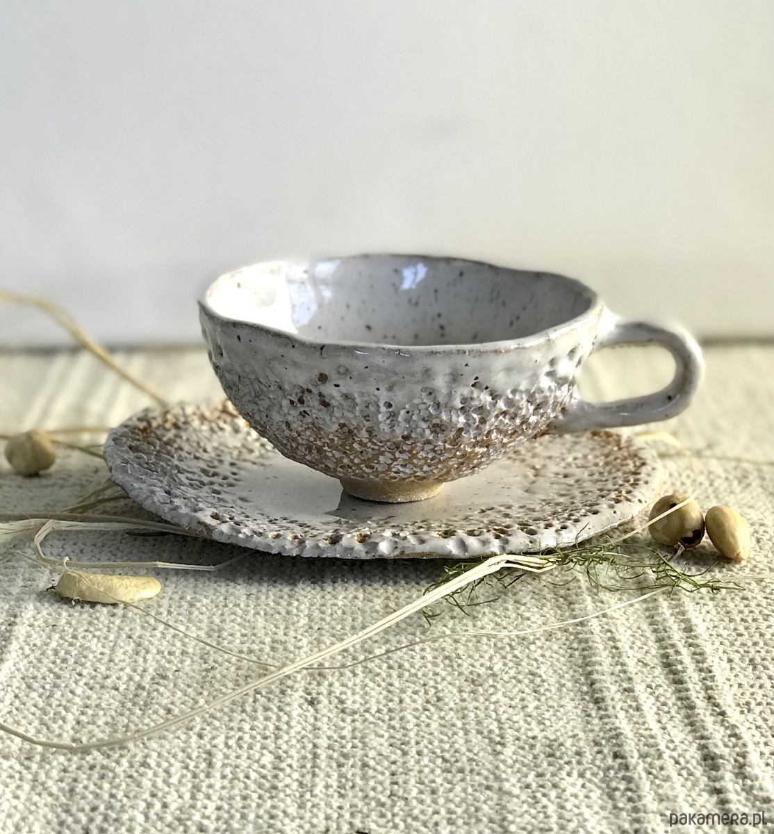 Naczynia (filiżanka + talerzyk) zostały wykonane z gliny i częściowo pokryte szkliwem. Uwydatniona faktura gliny nadaje zestawowi oryginalny, rustykalny charakter.