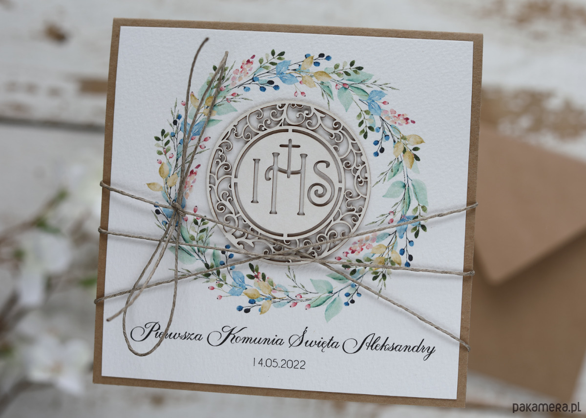 Rustykalna kartka na komunię z pełną personalizacją wykonana na bazie papieru kraftowego, z najwyższej jakości papieru bawełnianego oraz ozdoby tekturkowej. Możliwość nadruku życzeń w środku.