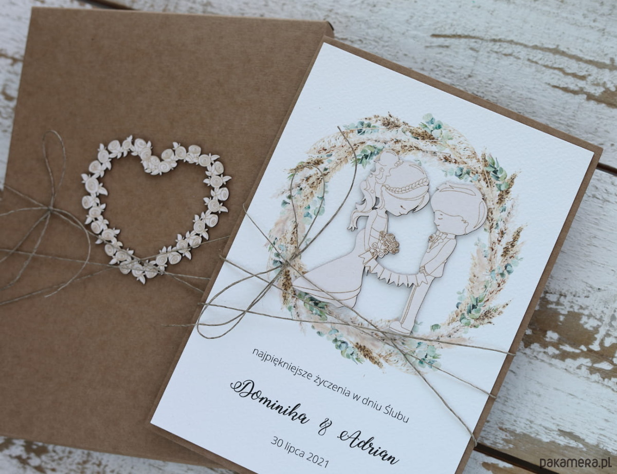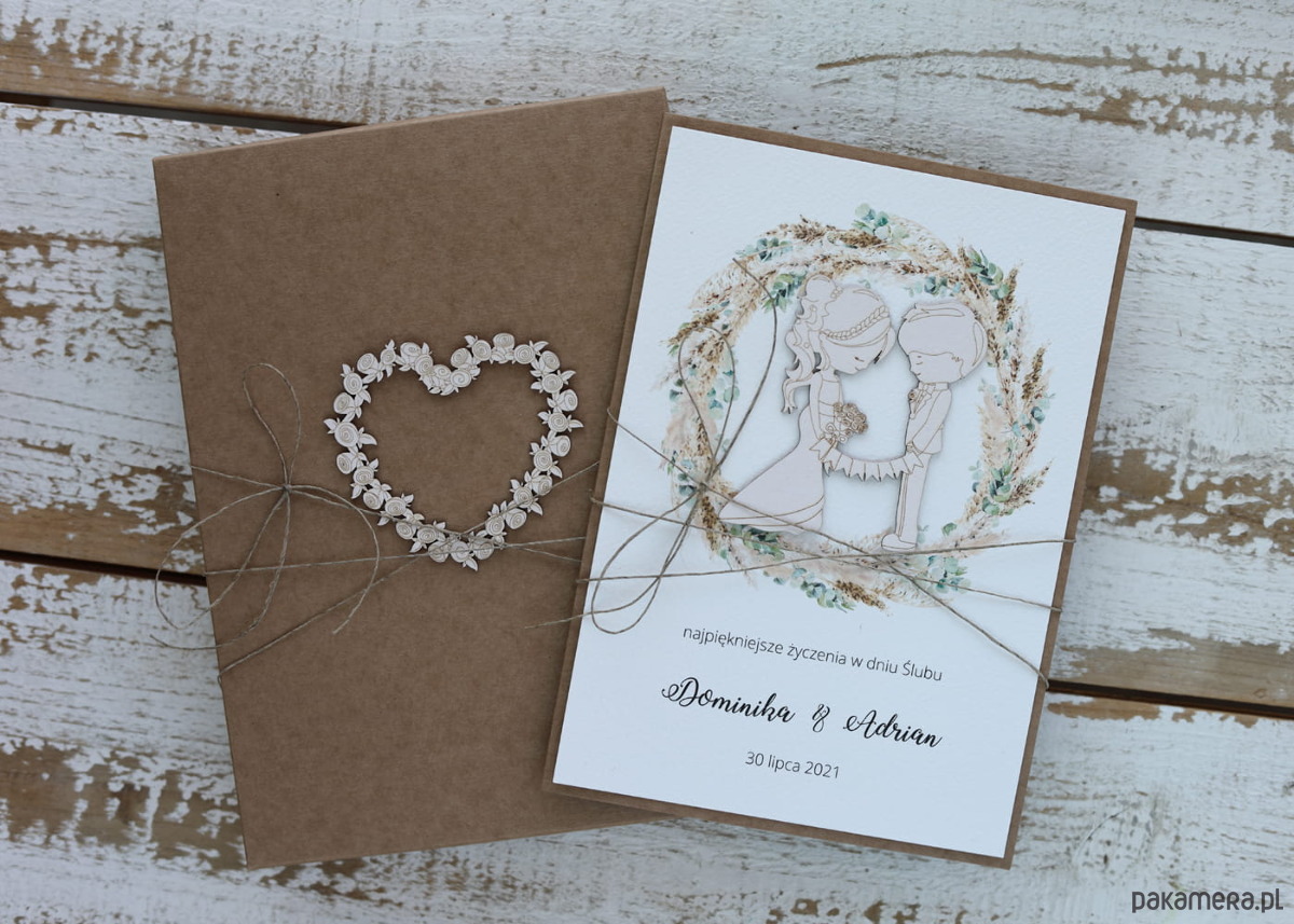 Kartka ślubna wykonana jest na bazie papieru kraftowego z użyciem starannie wyselekcjonowanego papieru bawełnianego w kolorze ecri oraz ozdoby tekturkowej. Kartka przewiązana jest lnianym sznureczkiem.
