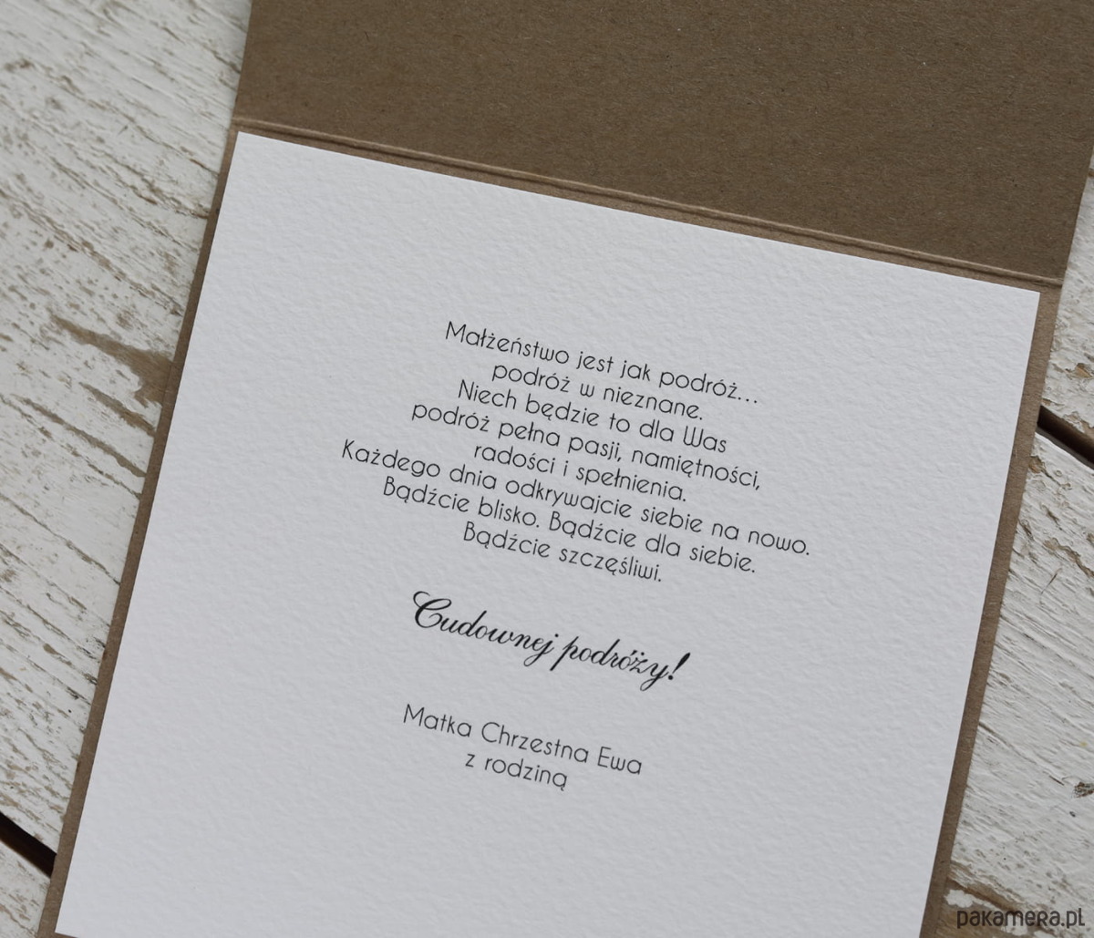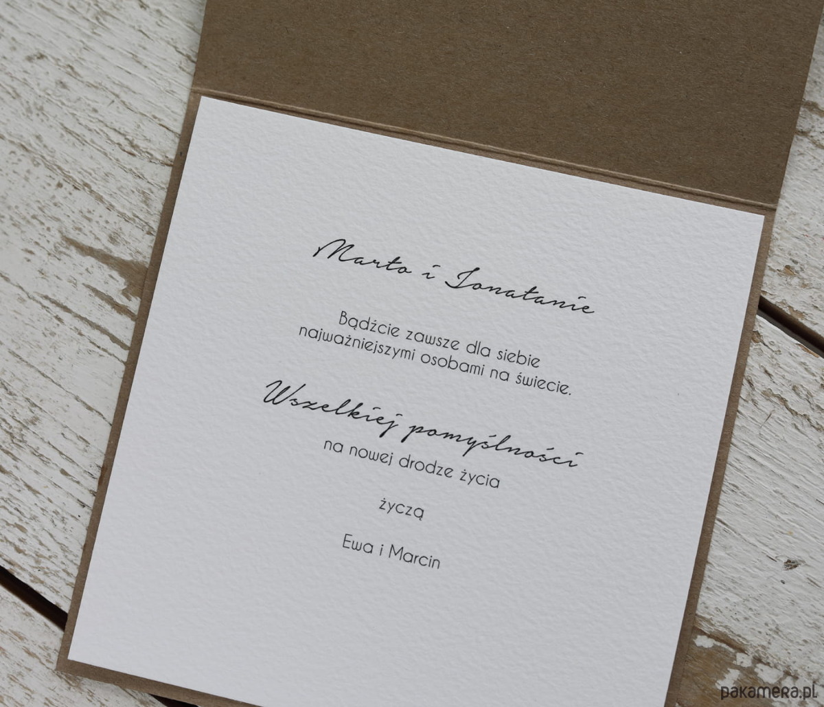 W środku wklejona jest jedna kartka z papieru bawełnianego z życzeniami bądź kartka pusta, gotowa do wpisania życzeń własnoręcznie.