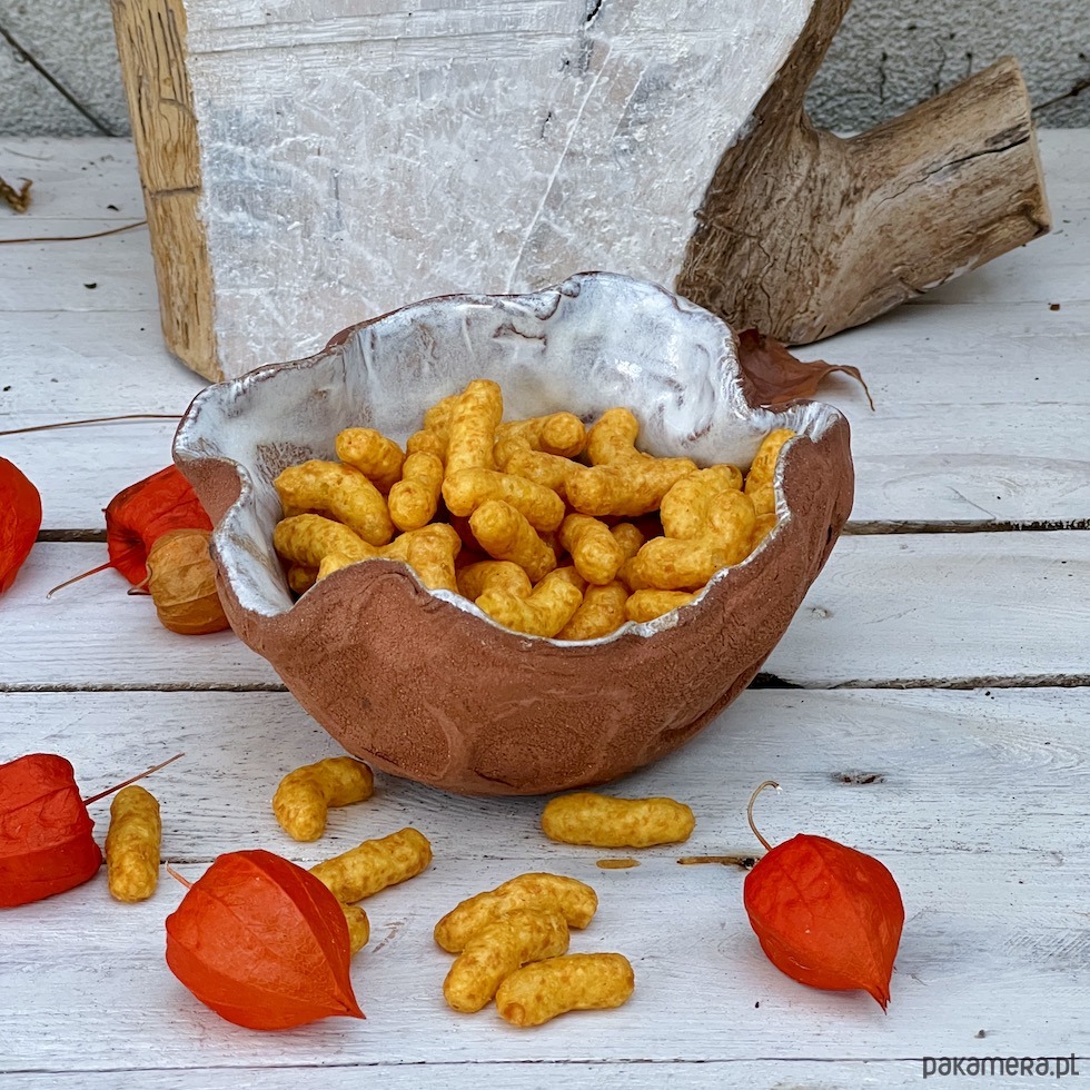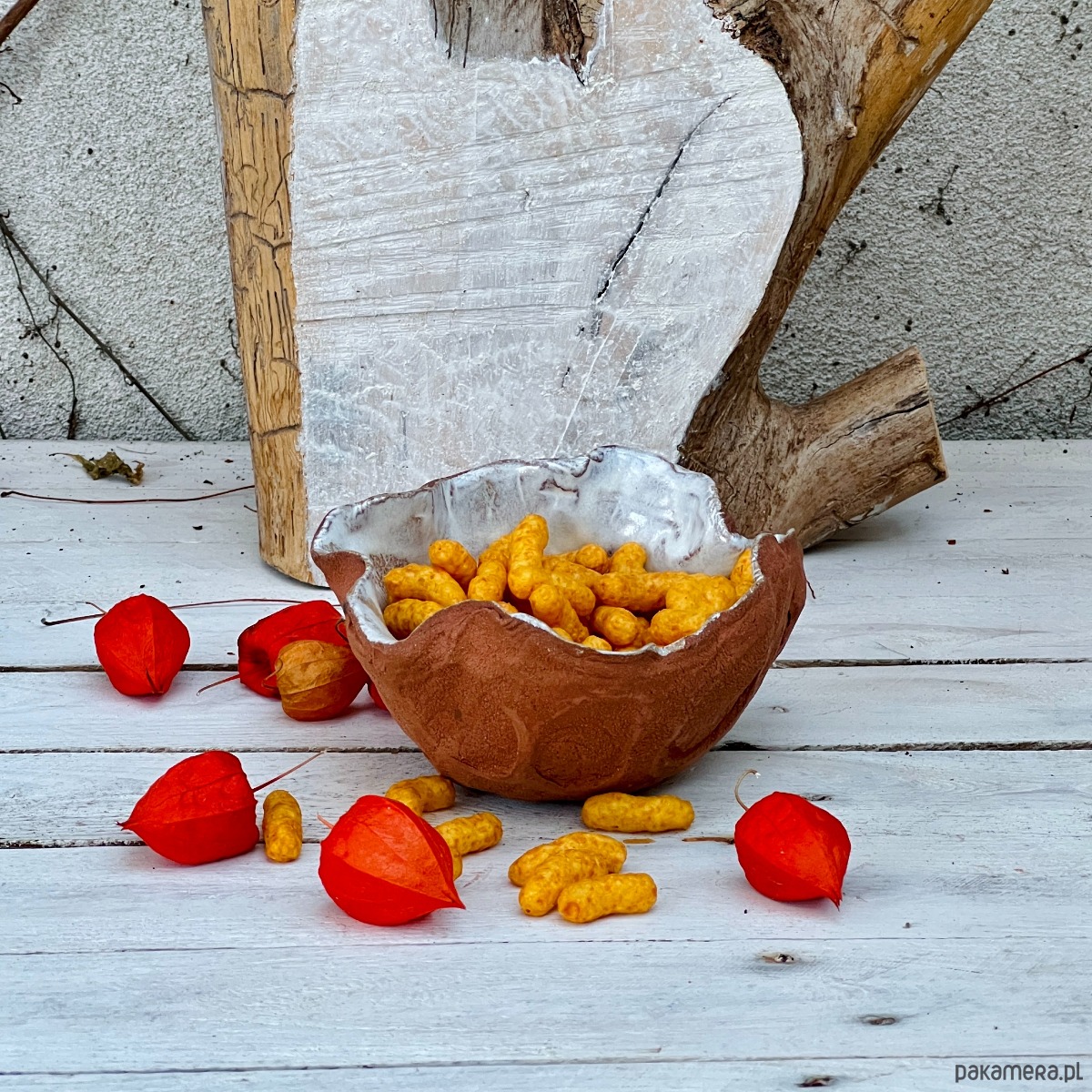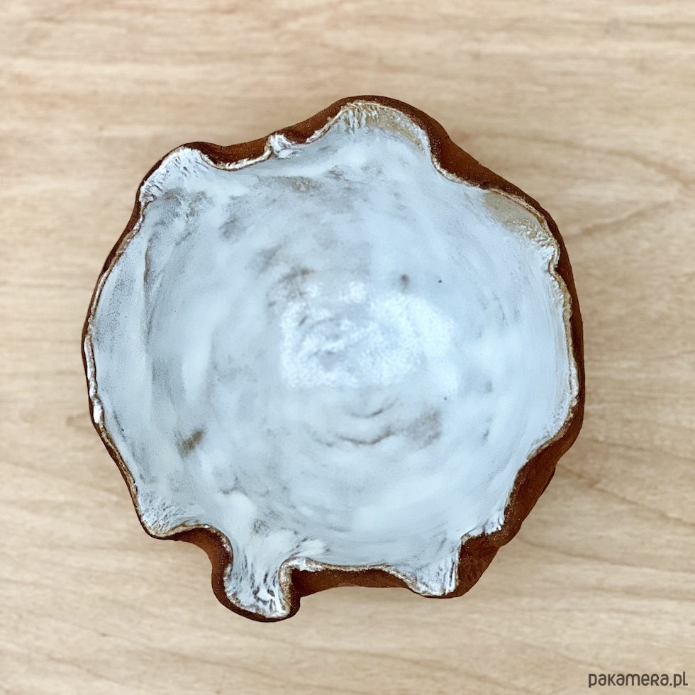 Ta ceramiczna miska z naturalnie powstałą podczas formowania fakturą zewnętrzną i gładkim, perliście białym wnętrzem została wykonana z szamotowej terakoty o rudo czerwonawym odcieniu. Miska jest wyrobem użytkowym do serwowania orzeszków , czipsów, cukierków lub jako pojemnik na biżuterię. Sprawdzi się również jako niewielki, rustykalny element dekoracji wnętrza. To może być ciekawy prezent na urodziny, pod choinkę lub z okazji przeprowadzki dla osoby ceniącej sobie naturalne, ręcznie robione formy ceramiczne.
