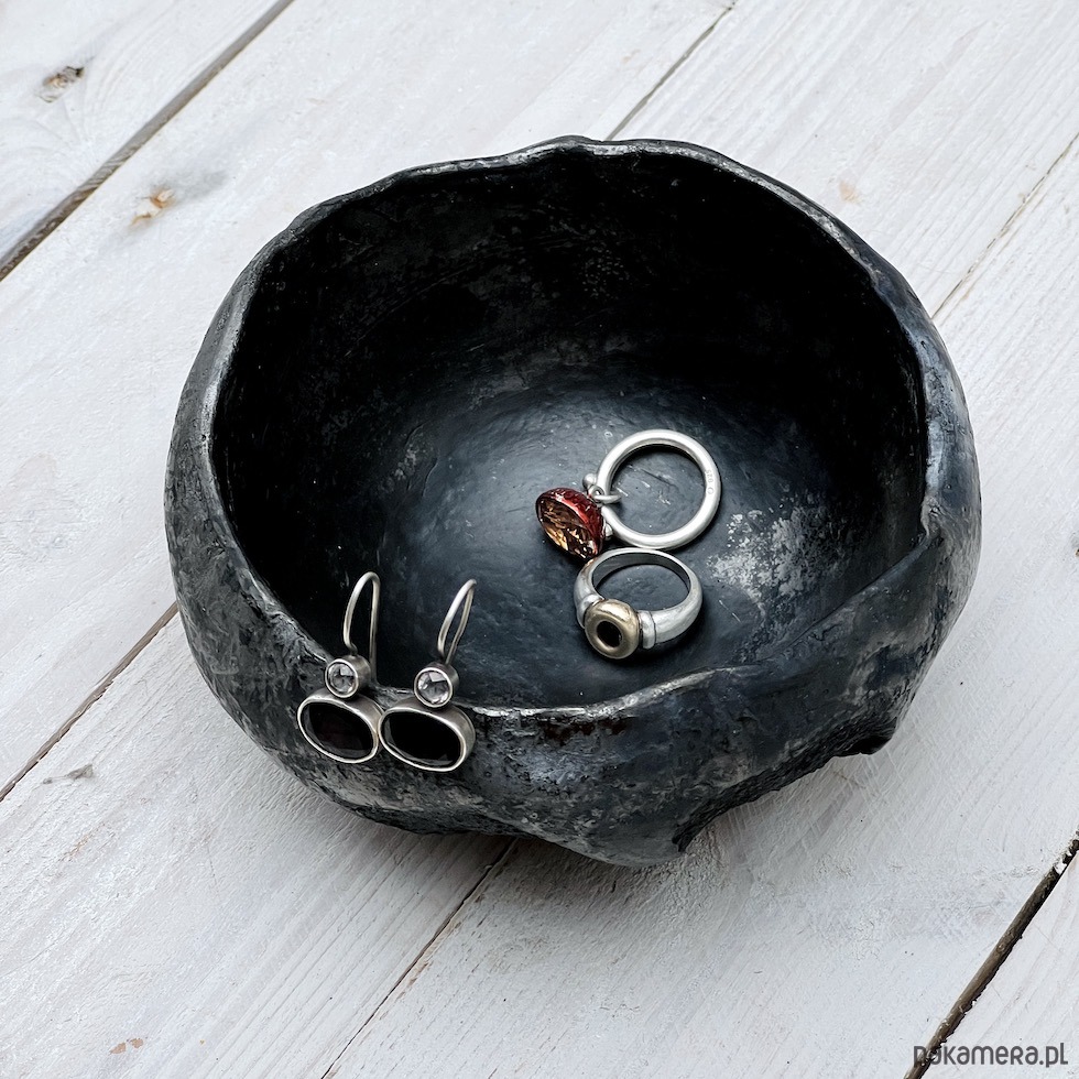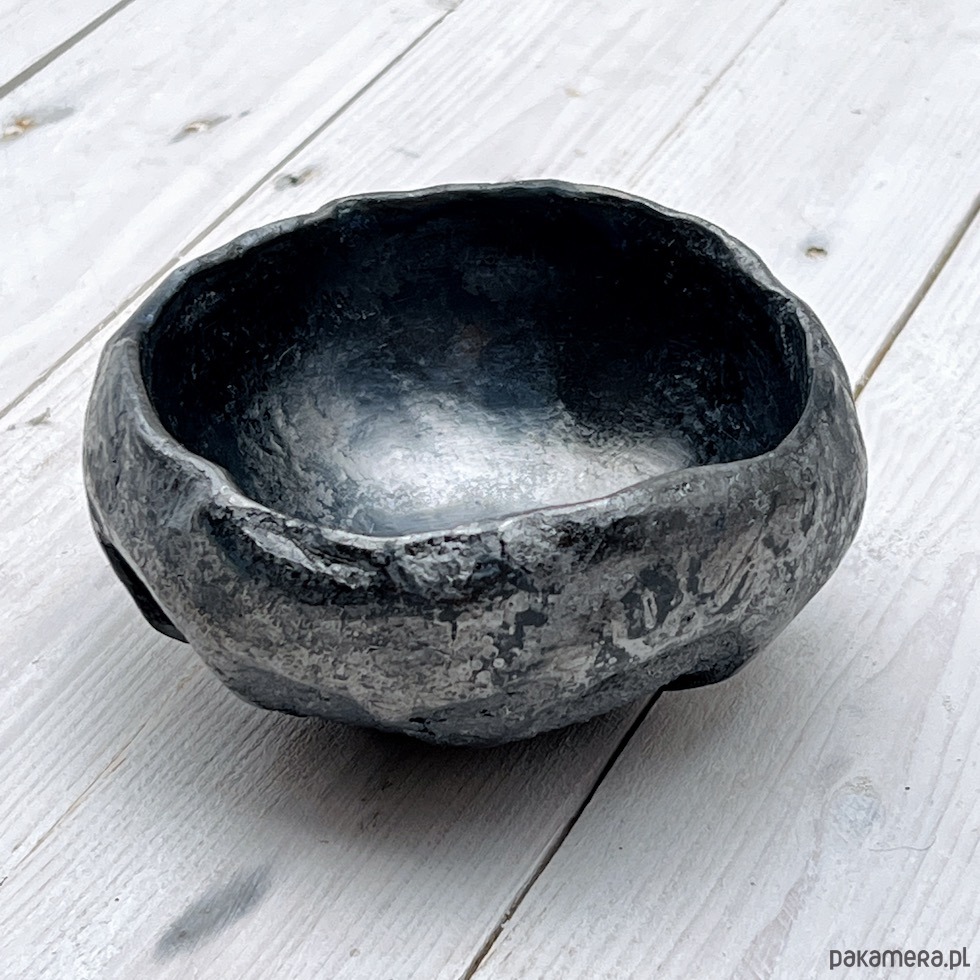 Ta ceramiczna miska z naturalnie powstałą podczas formowania fakturą zewnętrzną i gładkim, polerowanym wnętrzem została wykonana z szamotowej brązowej gliny i wypalona w żywym ogniu. Miska jest wyrobem użytkowym do serwowania orzeszków , czipsów, cukierków lub jako pojemnik na biżuterię. Sprawdzi się również jako niewielki, rustykalny element dekoracji wnętrza. To może być ciekawy prezent na urodziny, pod choinkę lub z okazji przeprowadzki dla osoby ceniącej sobie naturalne, ręcznie robione formy ceramiczne.
