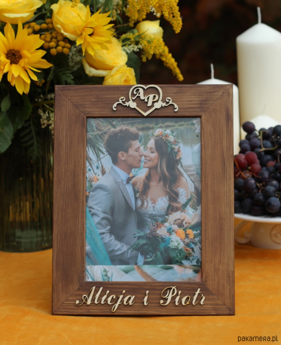 Na górze ramki umieszczone zostały drewniane inicjały otoczone delikatnym serduszkiem. Na dole znajdują się imiona małżonków.
