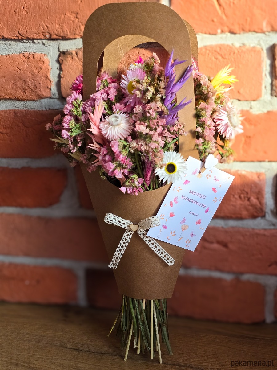 🎁 To wyjątkowy prezent dla osób, które cenią naturalne dodatki - ukochanej, mamy, siostry, przyjaciółki, koleżanki z pracy czy nauczycielki. W przeciwieństwie do świeżych kwiatów, ten bukiet zachowuje swój urok przez długi czas. Jest gotowy do wręczenia.