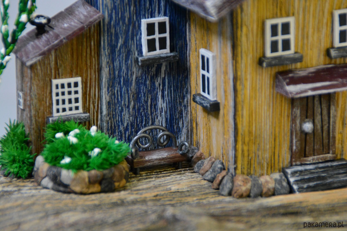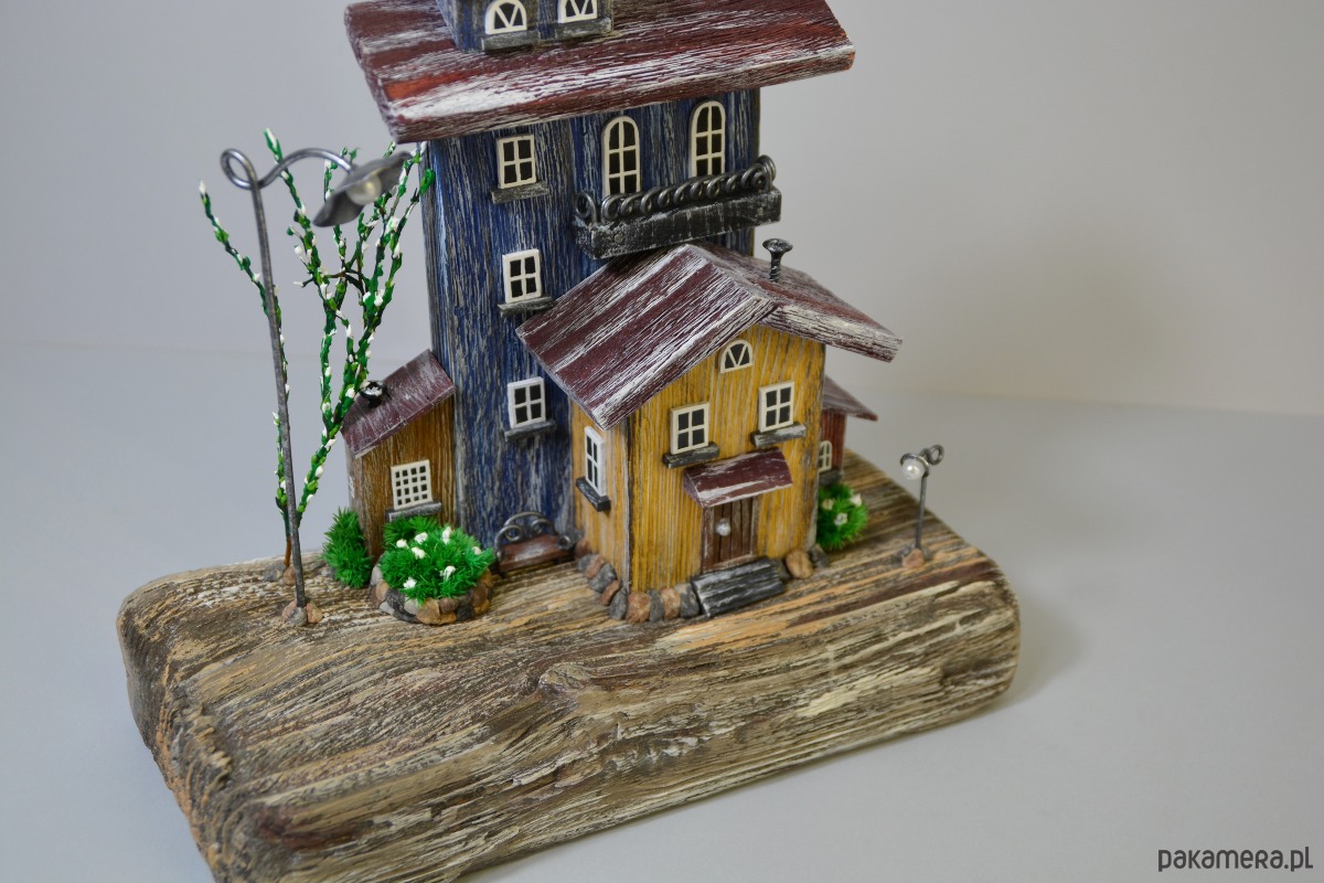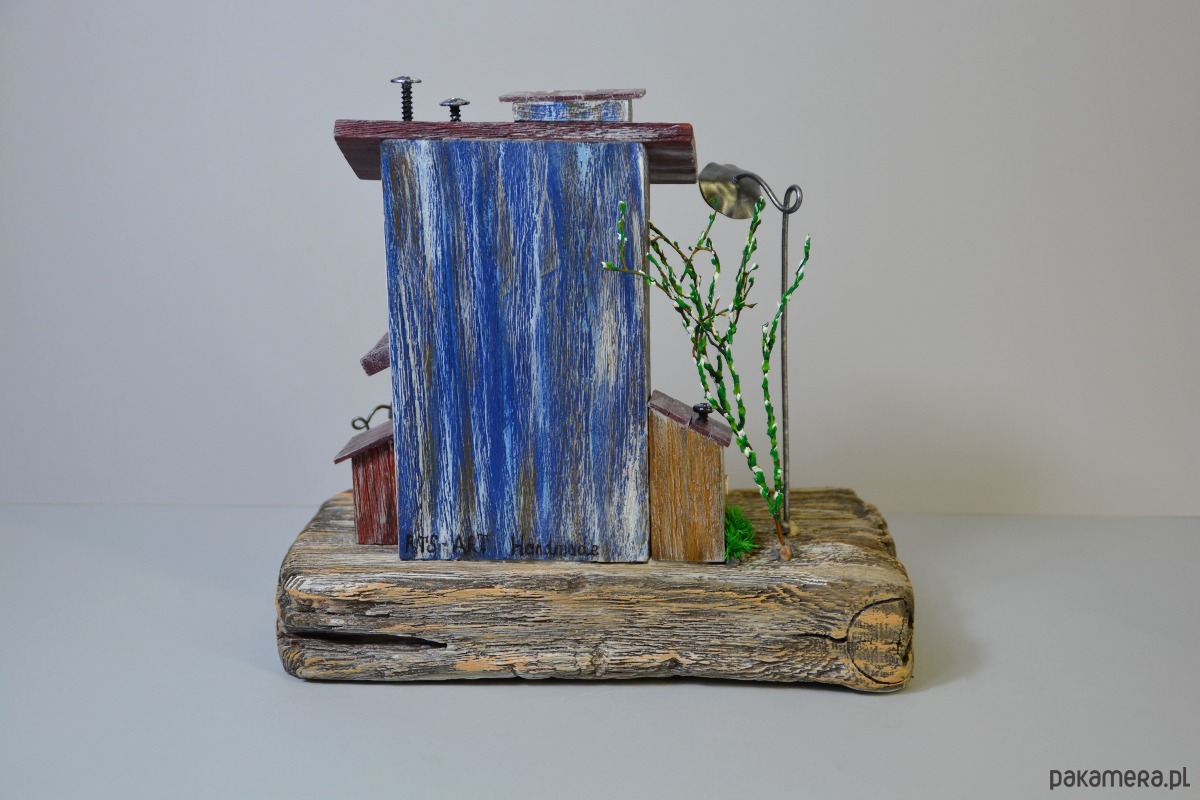 Domek wykonany jest z drewna, pomalowany farbami akrylowymi i polakierowany.