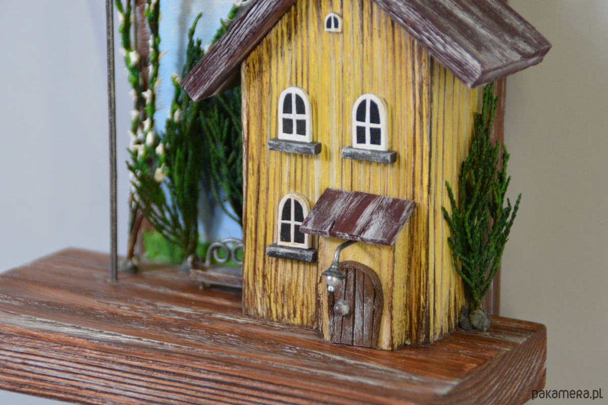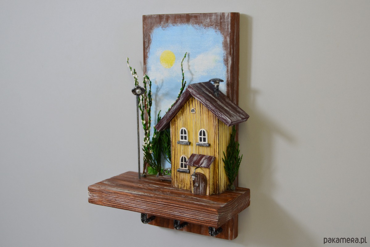 Dodaj wyjątkowego akcentu do swojego przedpokoju: ten ręcznie robiony, drewniany wieszak na klucze został wykonany z odzyskanego drewna sosnowego i ozdobiony miniaturowym domkem, pomalowanymi ekologiczną farbą. Wyposażony w trzy metalowe haczyki, idealnie nadaje się na klucze, szaliki lub maski. Wyjątkowa funkcjonalność łączy się z rustykalną estetyką i zrównoważonym podejściem.