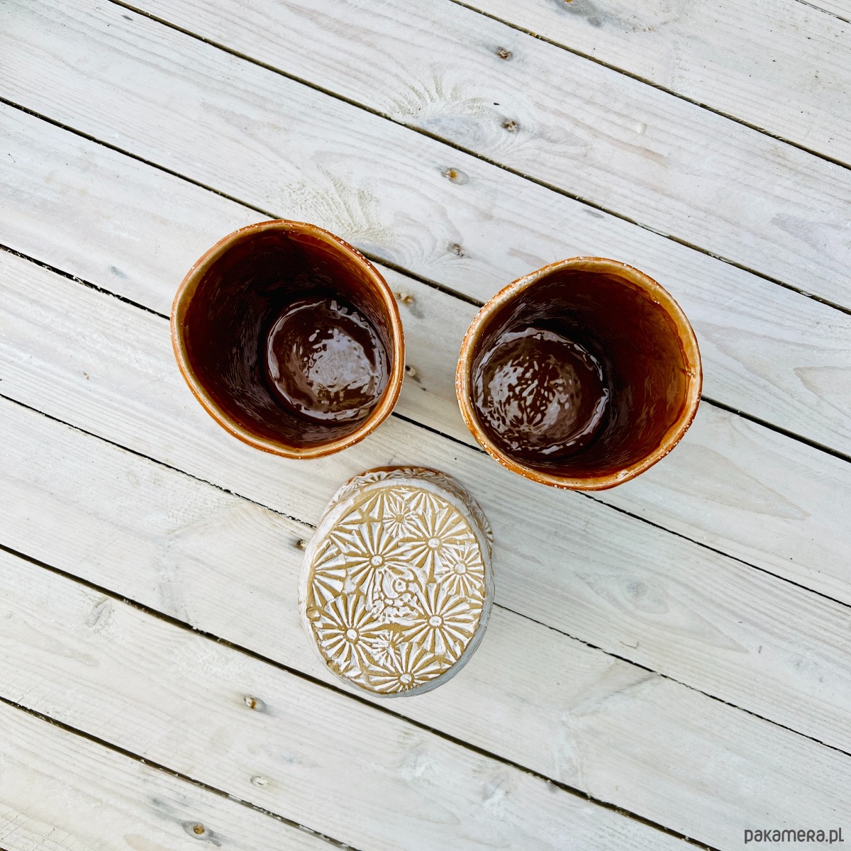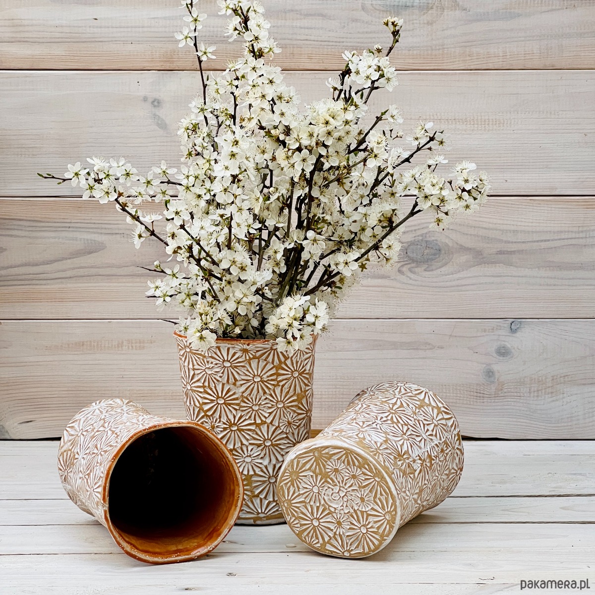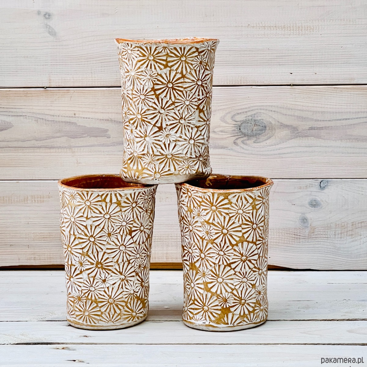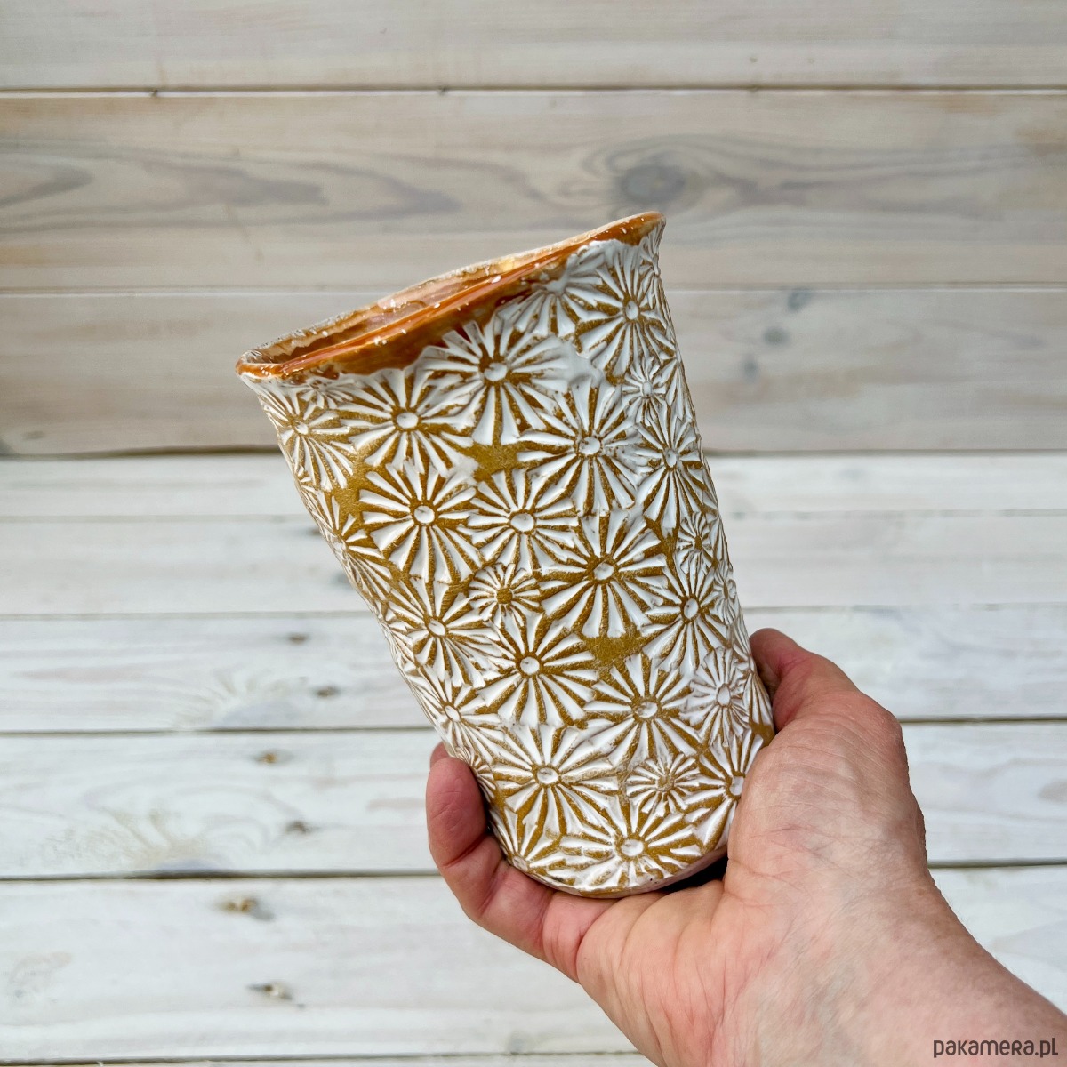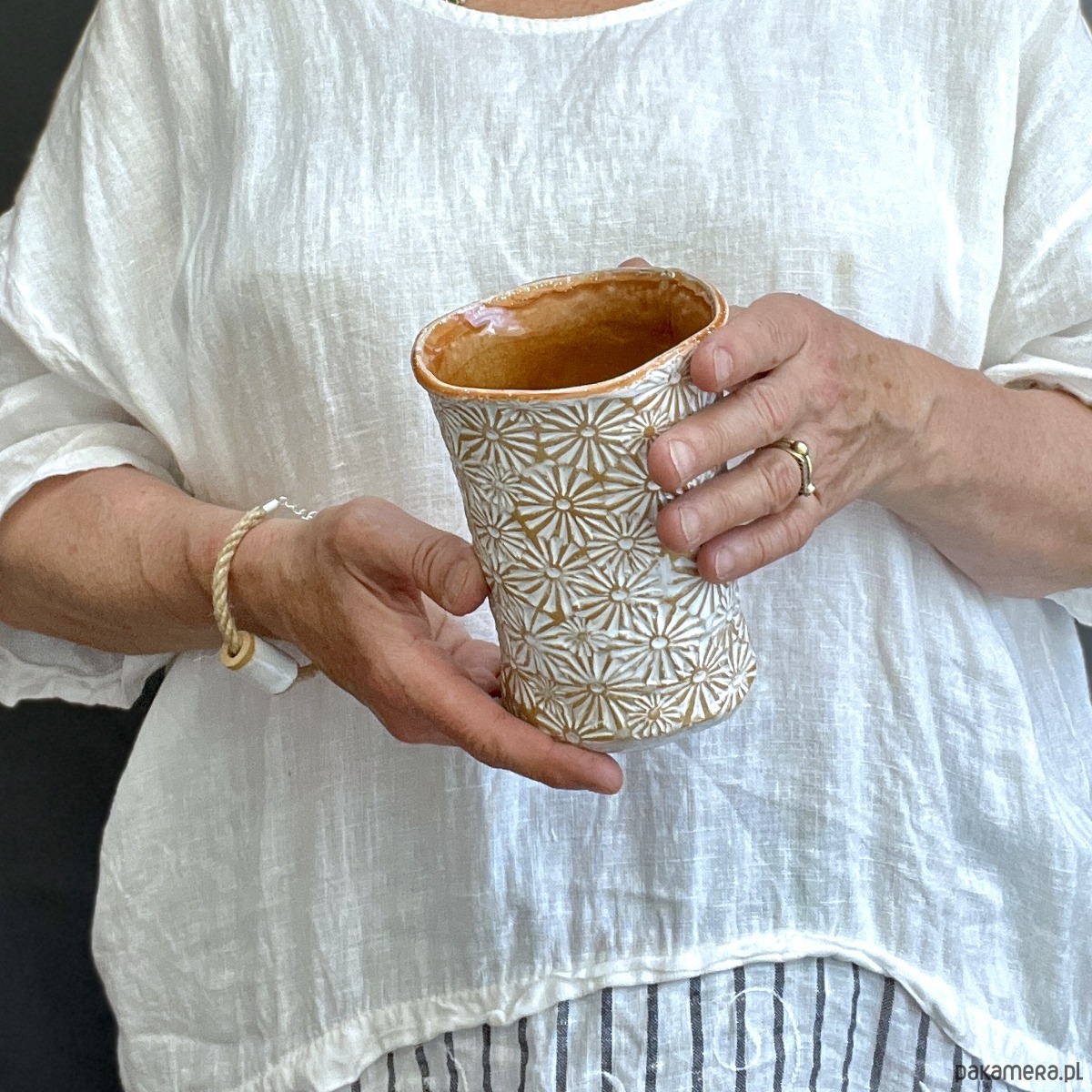 Duży kubas bez ucha o pojemności około 600 ml z odciskanym wzorem kwiatowym stokrotki. Kubas ma płynną formę z owalnym brzegiem co pozwala wygodnie trzymać w dłoni. W niedopełnionym kubku brzeg pozostaje chłodny i pozwala na bezpieczne przenoszenie gorących napojów. Naczynie może być używane również do zimnych napojów lub jako wazonik.