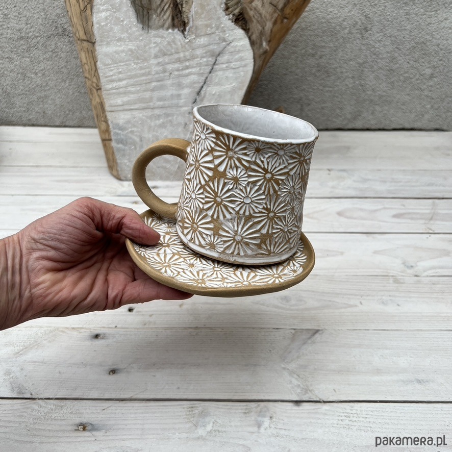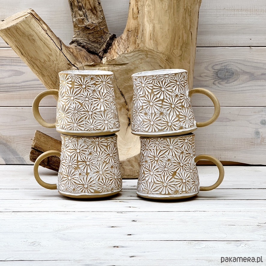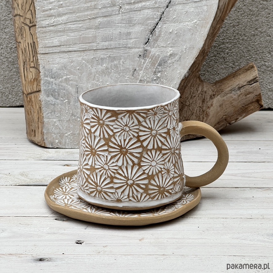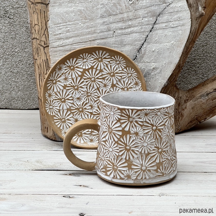 Ręcznie wykonany kubek ceramiczny z odciśniętym motywem kwiatowym stokrotki. KUbek został poszkliwiony białym szkliwem, a następnie przetarty dla uzyskania rustykalnego efektu. Kubek ma lekko wyoblone dno dla wygodnego trzymania na dłoni. Brzeg jest tak skonstruowany, że zapobiega ściekaniu płynu podczas picia. Nieszkliwione ucho zapewnia pewny i wygodny uchwyt. Tekstura jest miła w dotyku, bez zadziorów. Proszę sprawdzić opcję z pasującą podstawką o średnicy około 11 cm.