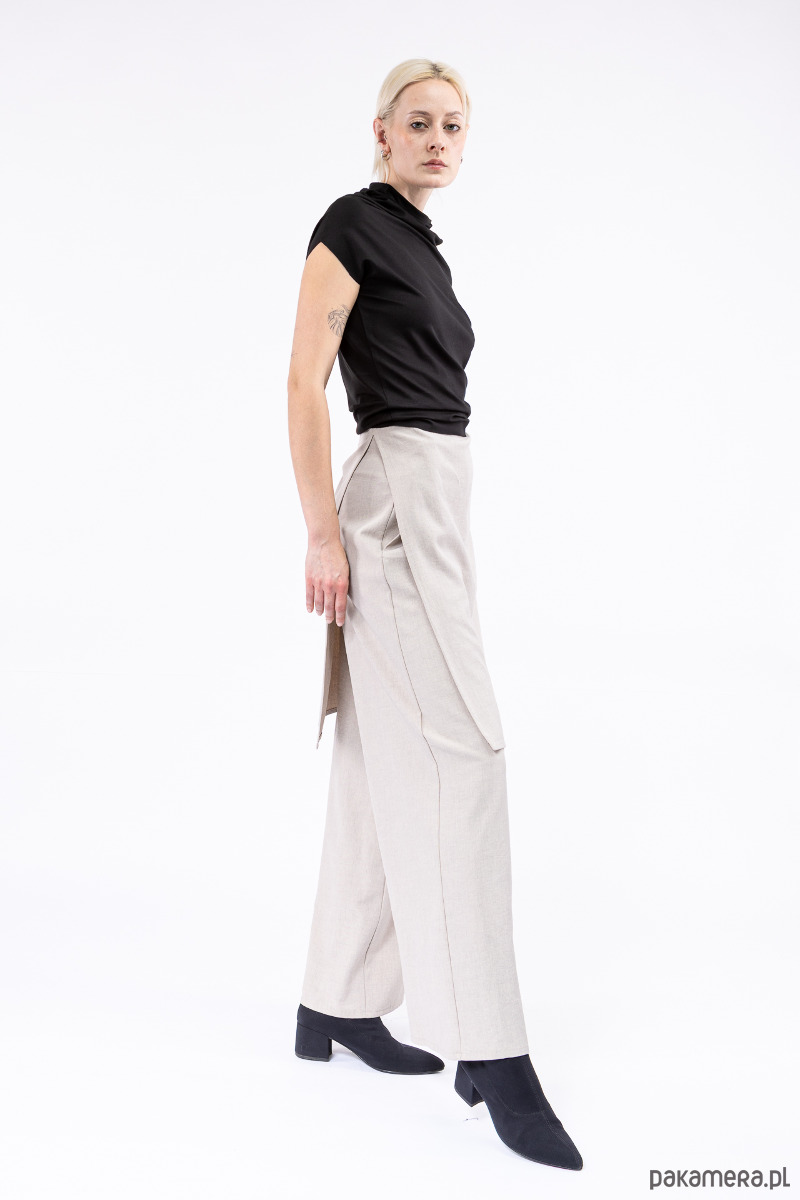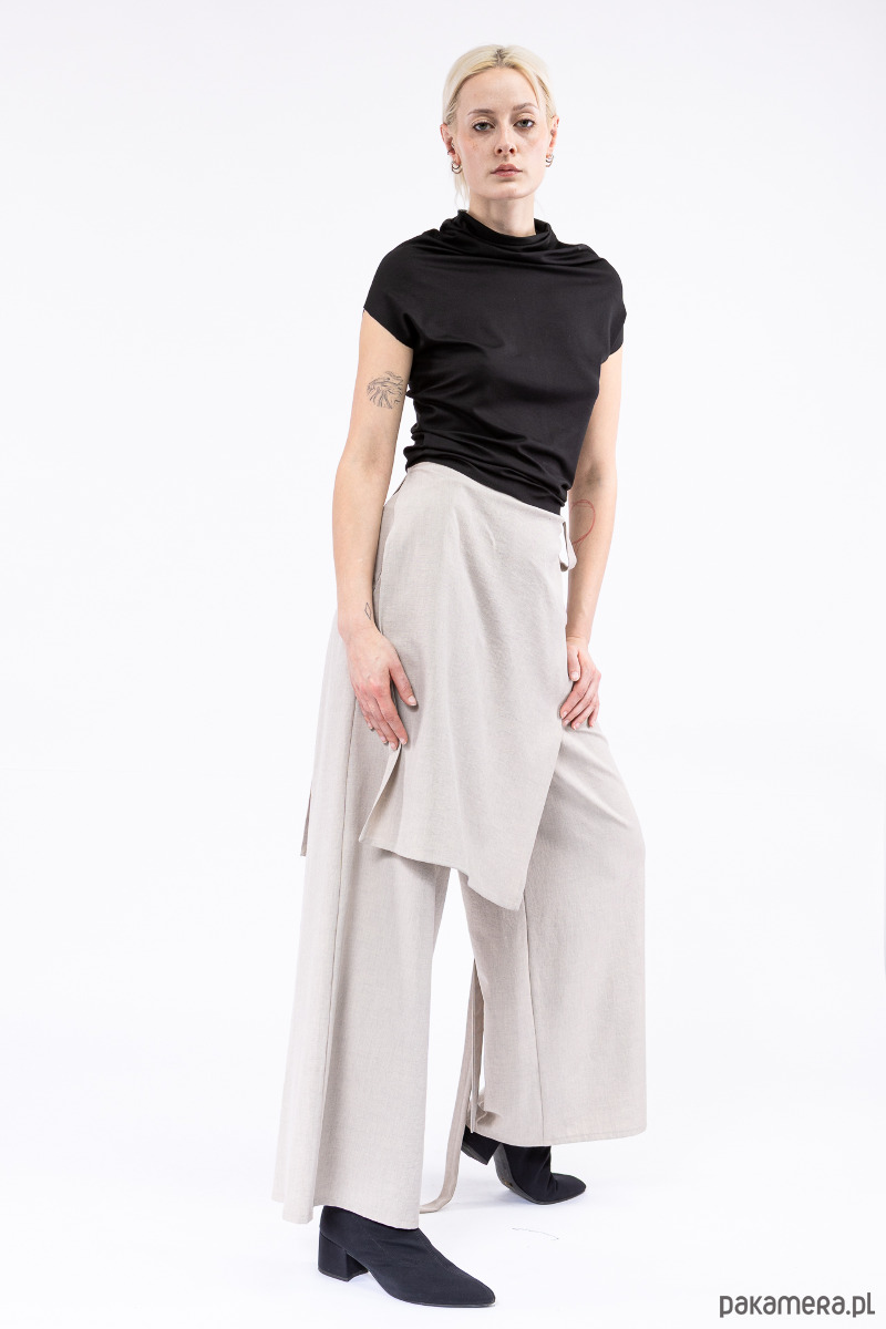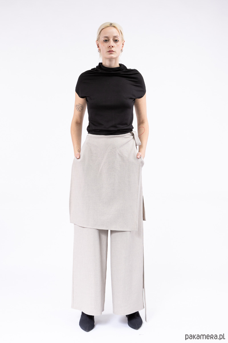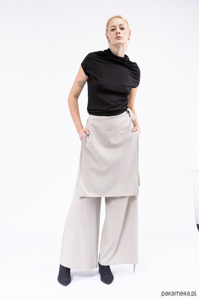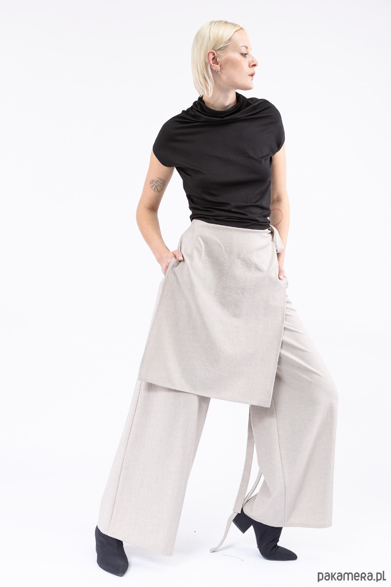 stylowe spodnie z nakładką, przewiązaną z boku paskiem, którą można dowolnie dopasować,