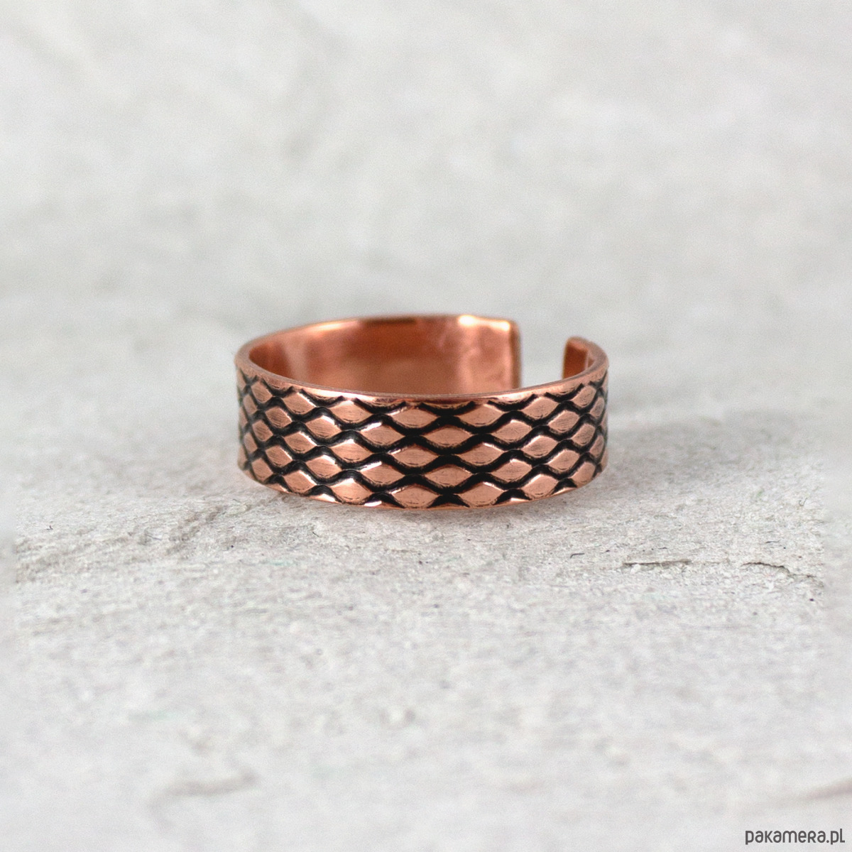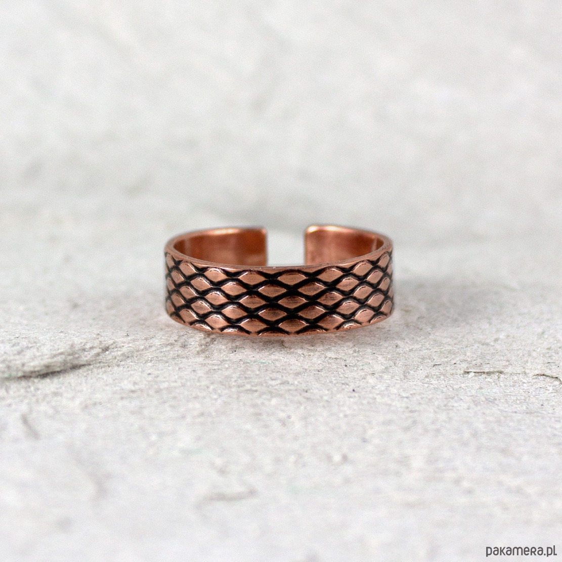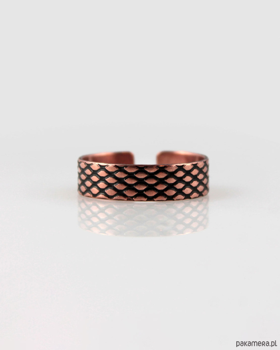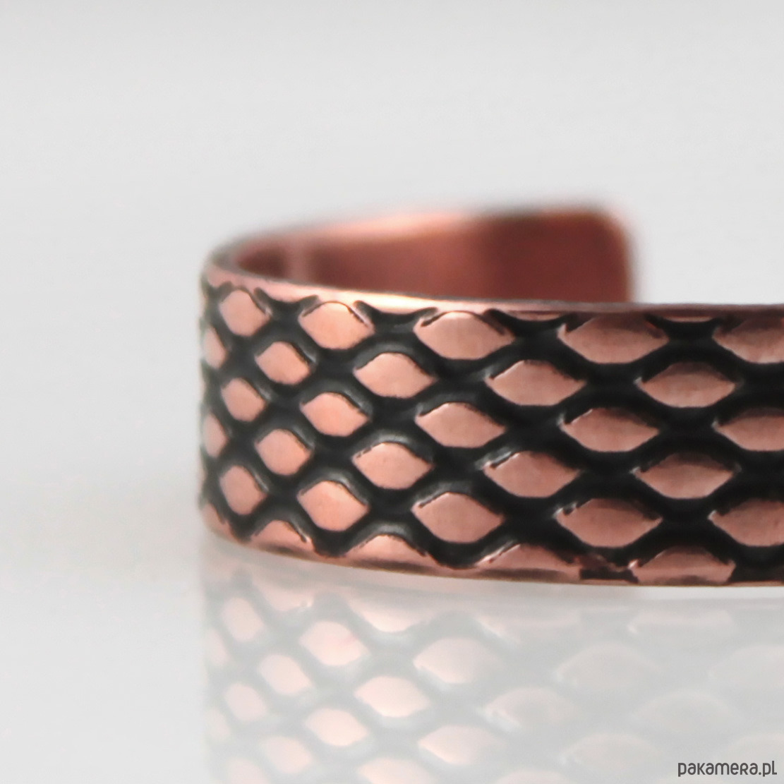 Pierścionek został wykonany z miedzi, jego szerokość to ok 0,5 cm.