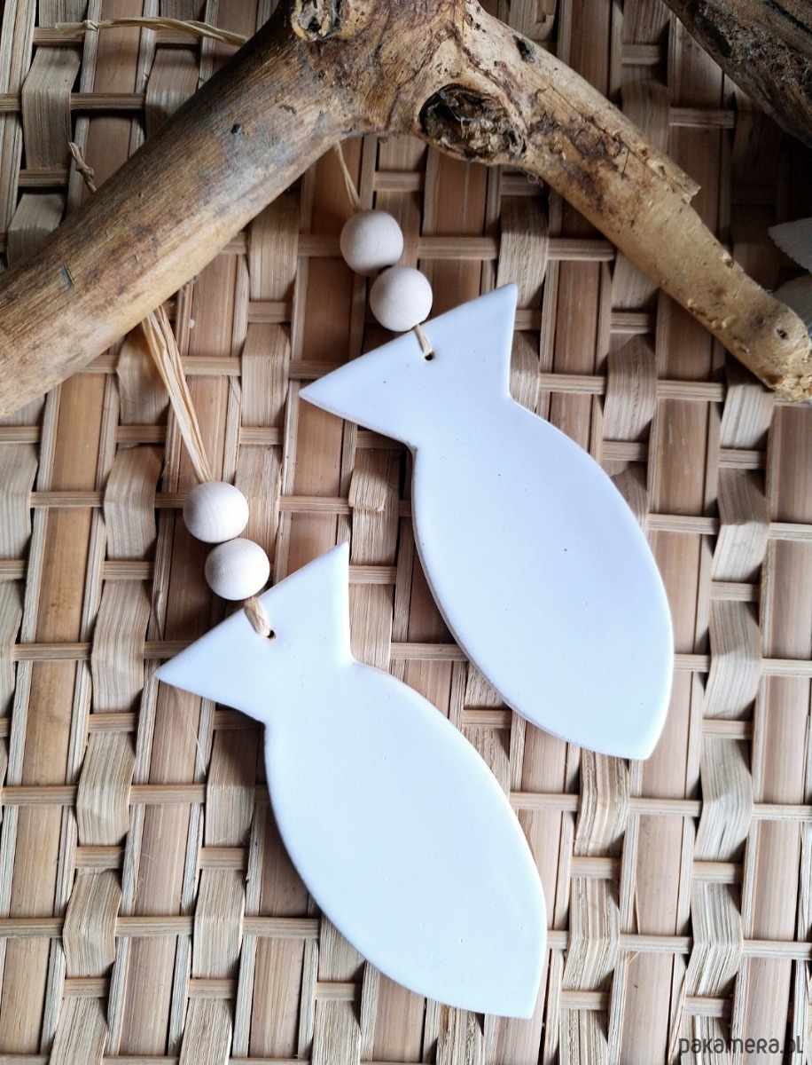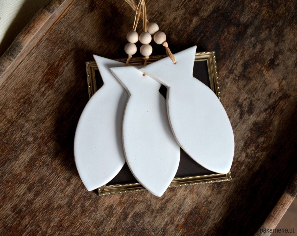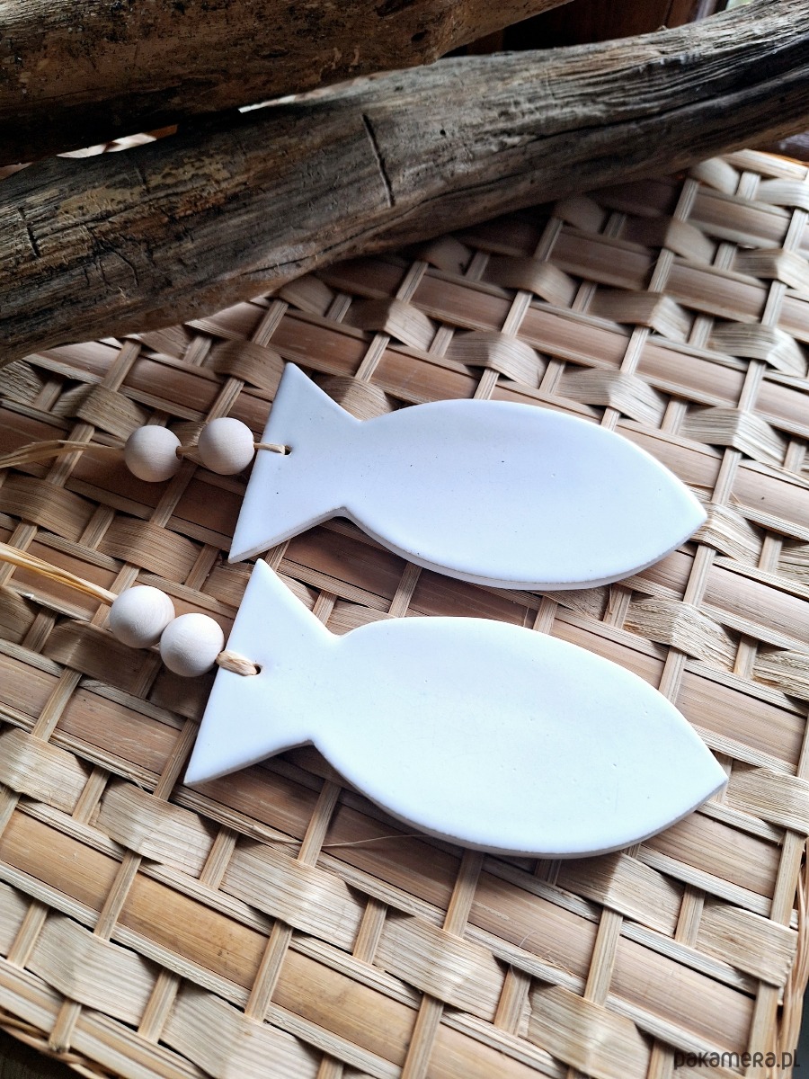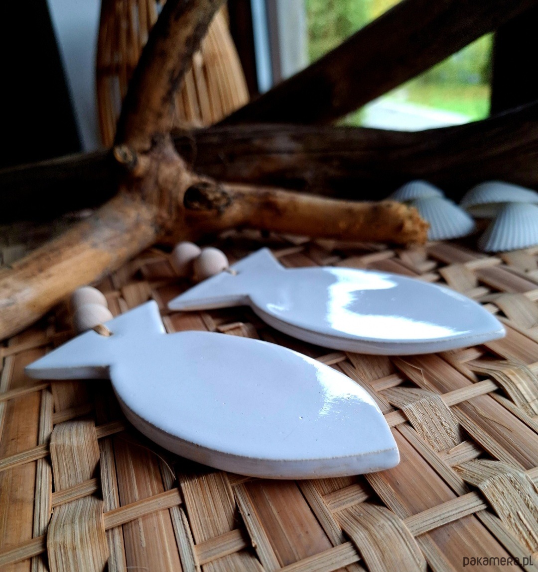 Ryby ceramiczne, ręcznie formowane, szkliwione w kolorze białym błyszczącym. Zawieszka z rafii ozdobiona drewnianymi kulkami.
