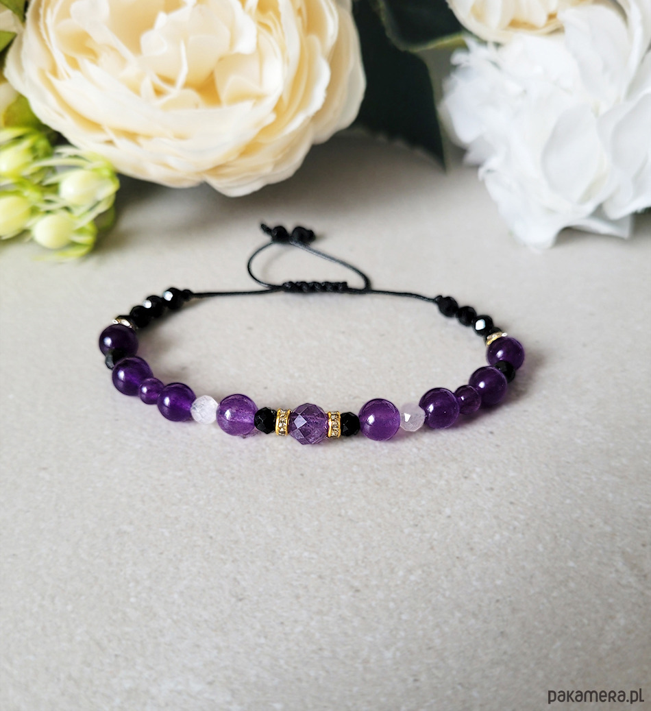 Bransoletka zrobiona z kamieni naturalnych: Ametystu, Kwarcu różowego, Spinelu oraz dodatkowym Turmalinem głównie przeznaczona dla zodiakalnych Ryb.