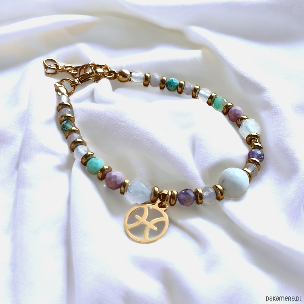 UŻYTE KAMIENIE (wielkość od 4 do 8,5mm) : kamień księżycowy, kwarc różowy, turkus, agat, jadeit, amazonit, ametyst, fosfosyderyt, hematyt złoty.