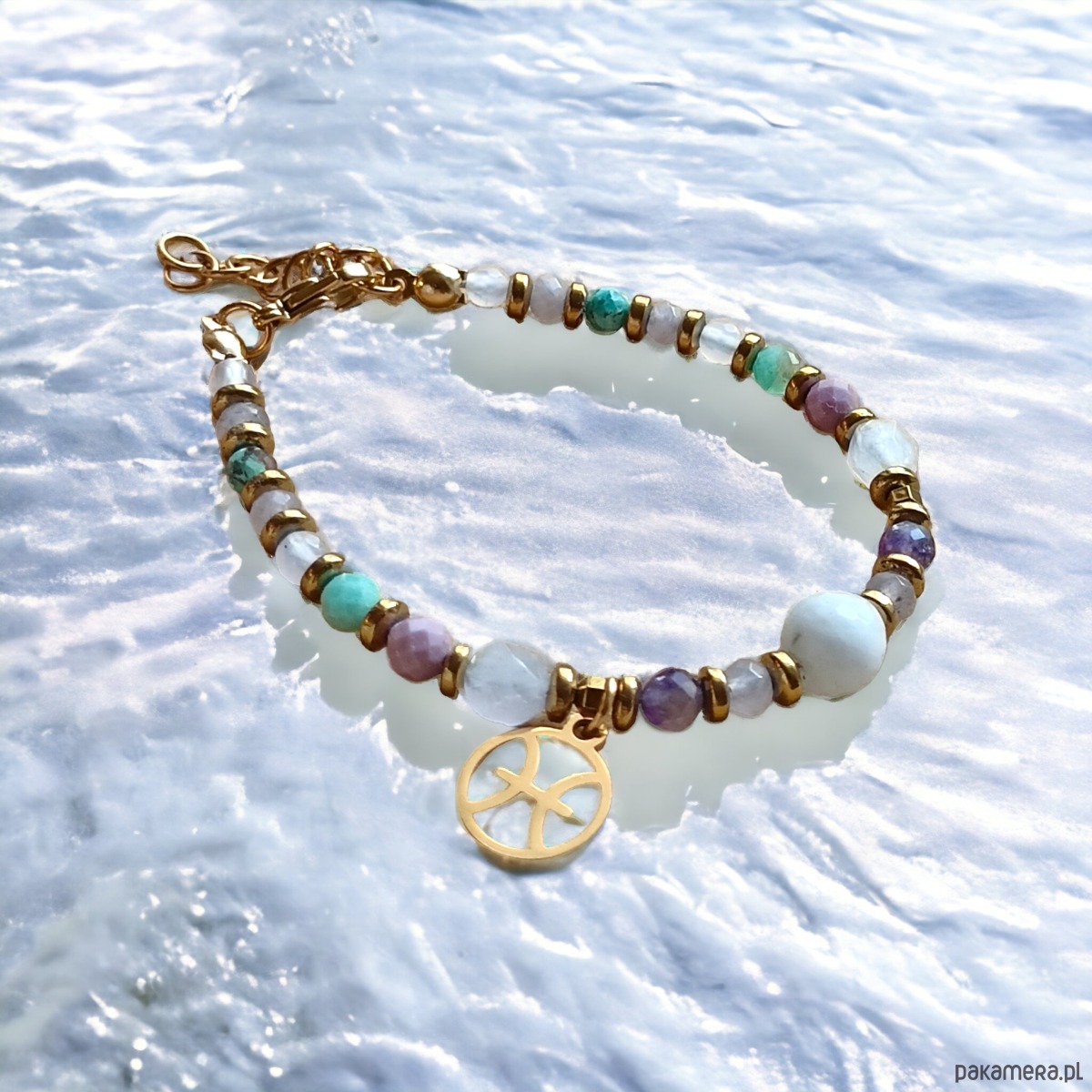 UŻYTE KAMIENIE (wielkość od 4 do 8,5mm) : kamień księżycowy, kwarc różowy, turkus, agat, jadeit, amazonit, ametyst, fosfosyderyt, hematyt złoty.