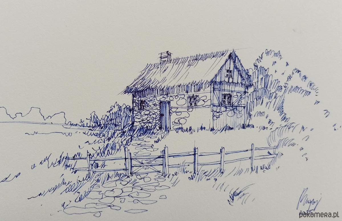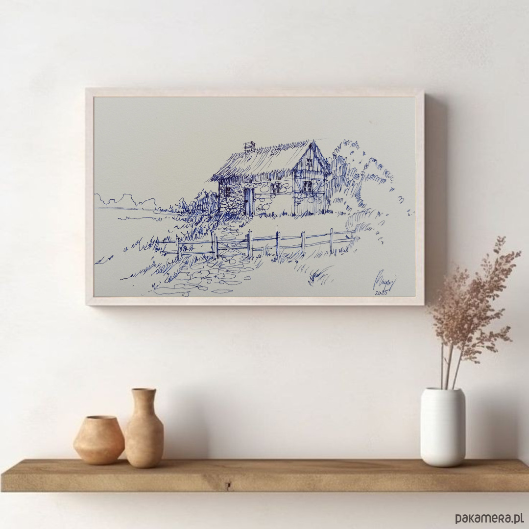 Rysunek cienkopis Wiejska chata oryginalny 20x30 cm