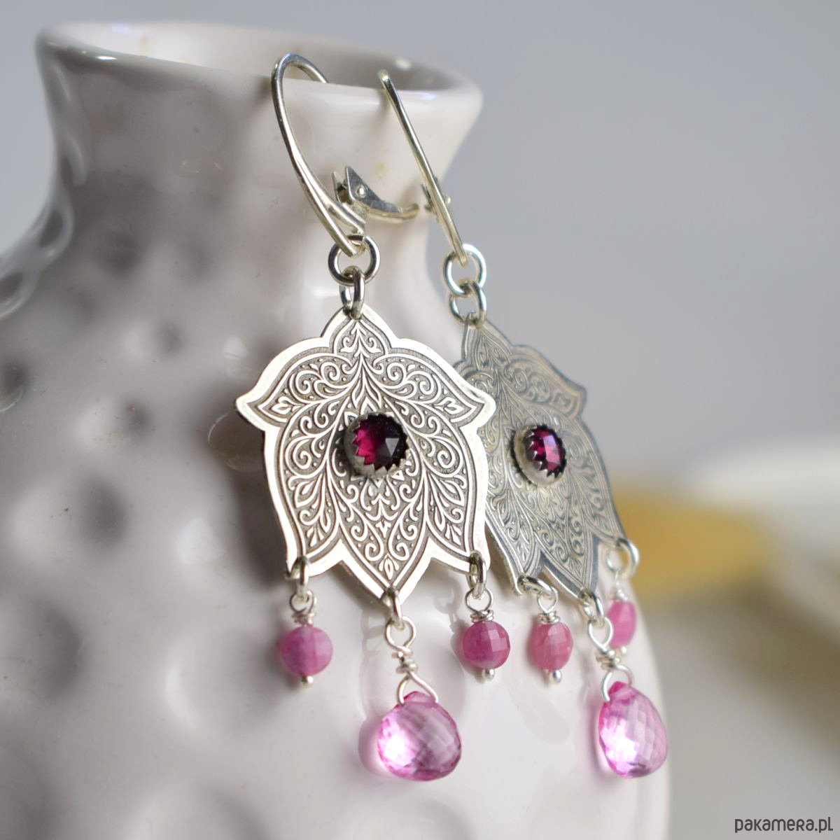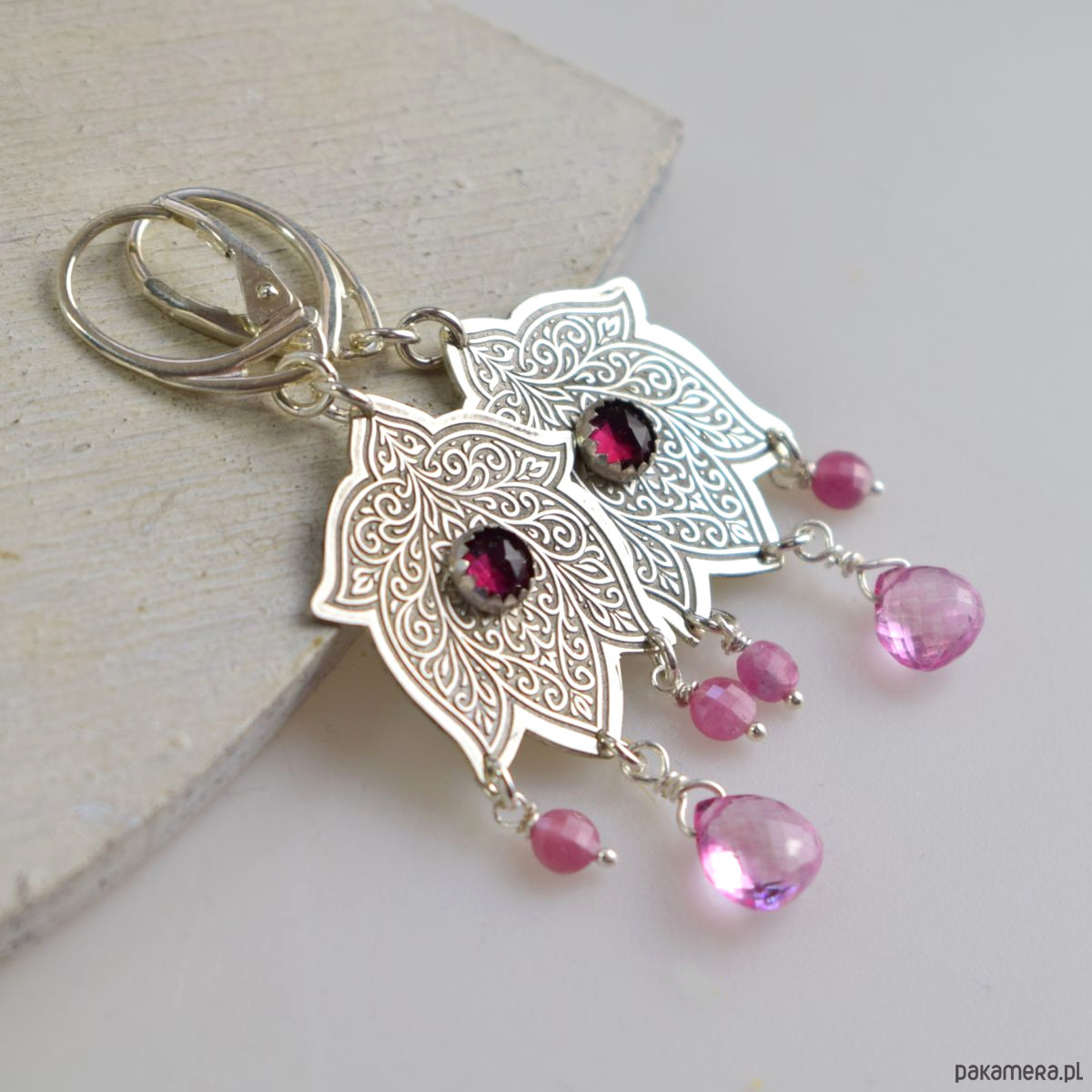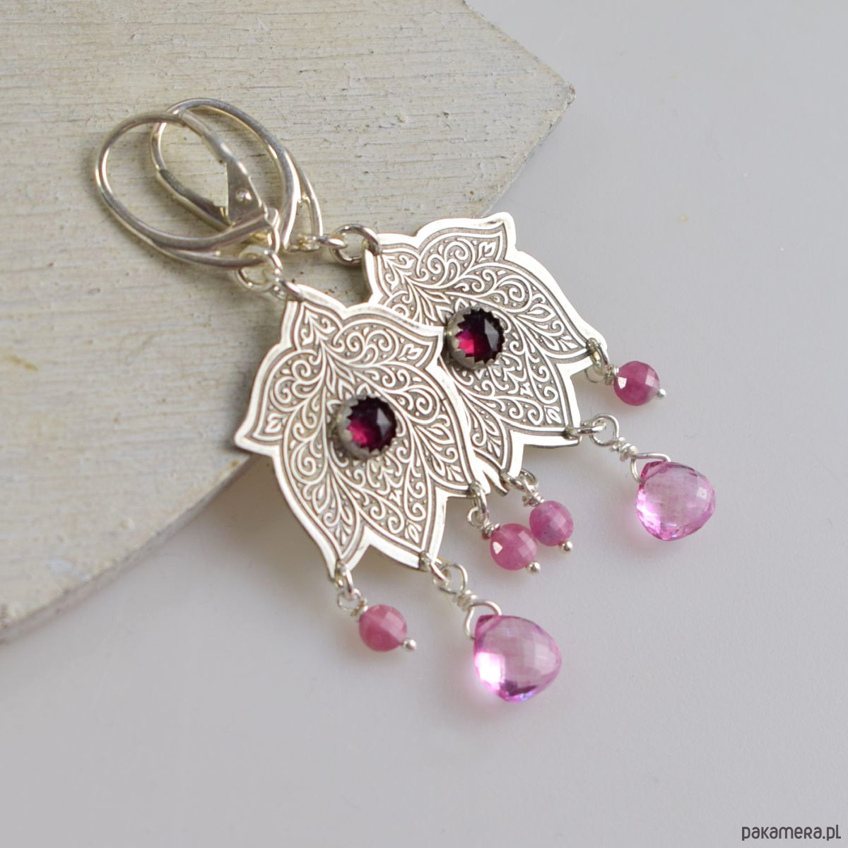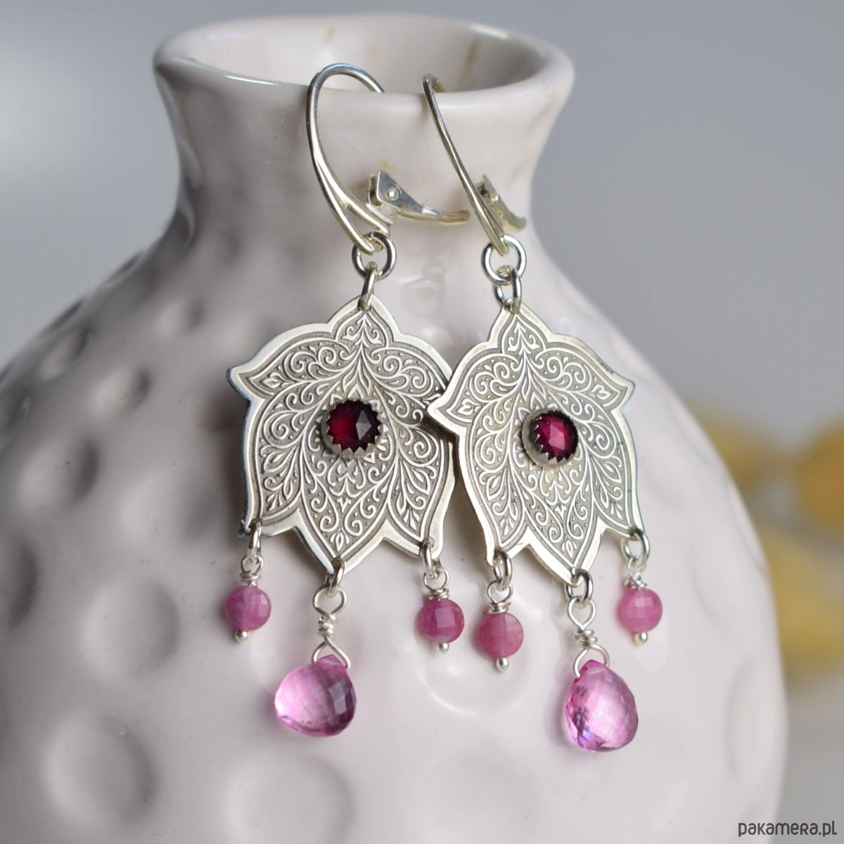 Kolczyki zostały zaprojektowane i wykonane od podstaw w pracowni Sunflower. Jedyny egzemplarz. Długość całego kolczyka 6,2 cm. Użyte materiały: krople różowego topazu, granat, różowy turmalin, srebro 925. Biżuteria zostanie ozdobnie zapakowana.