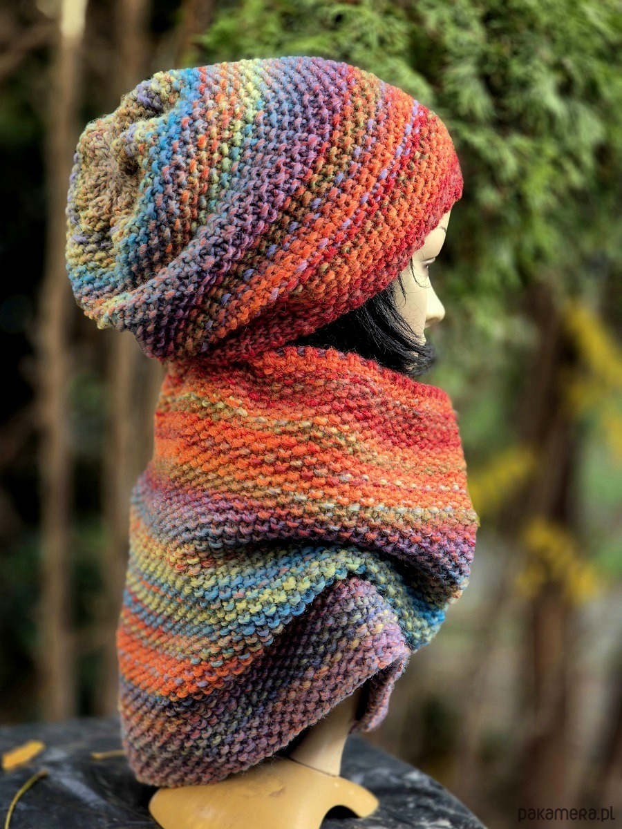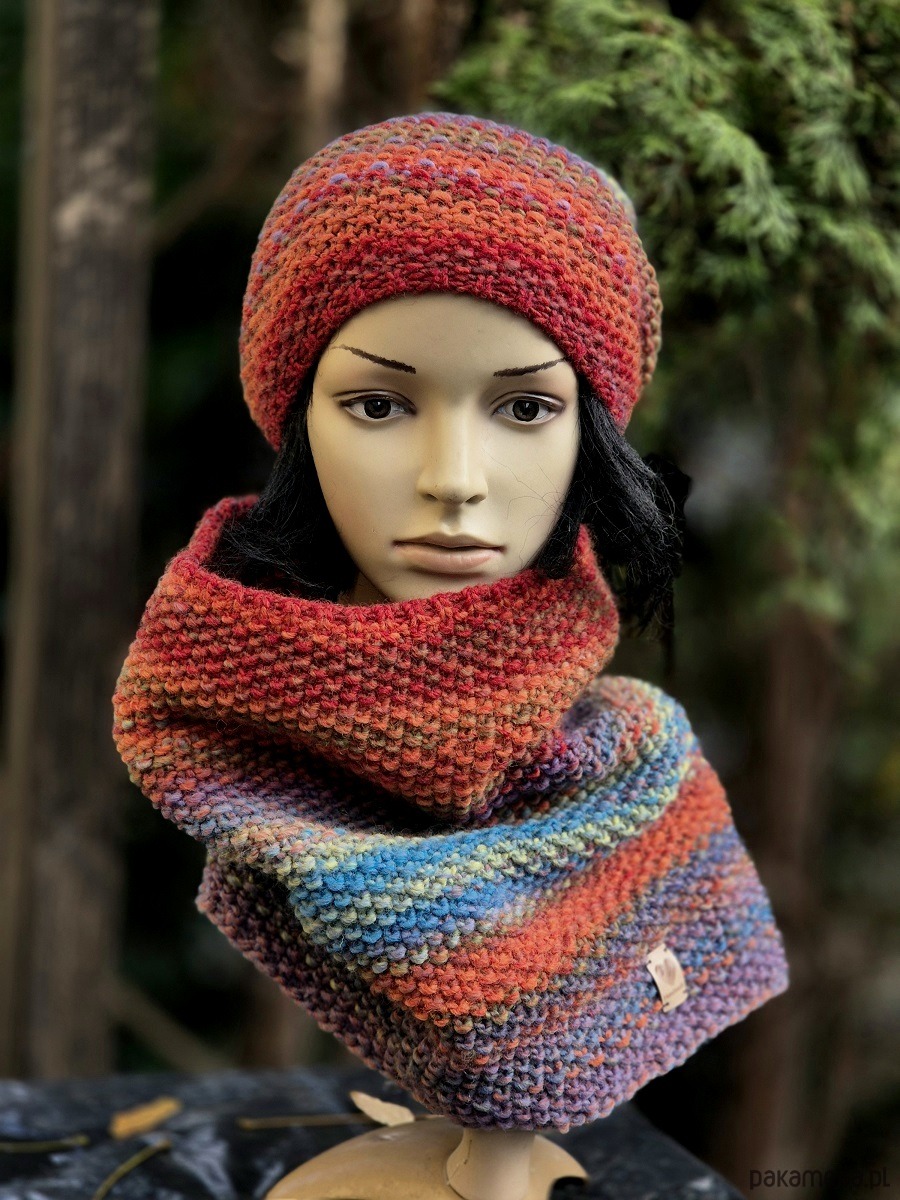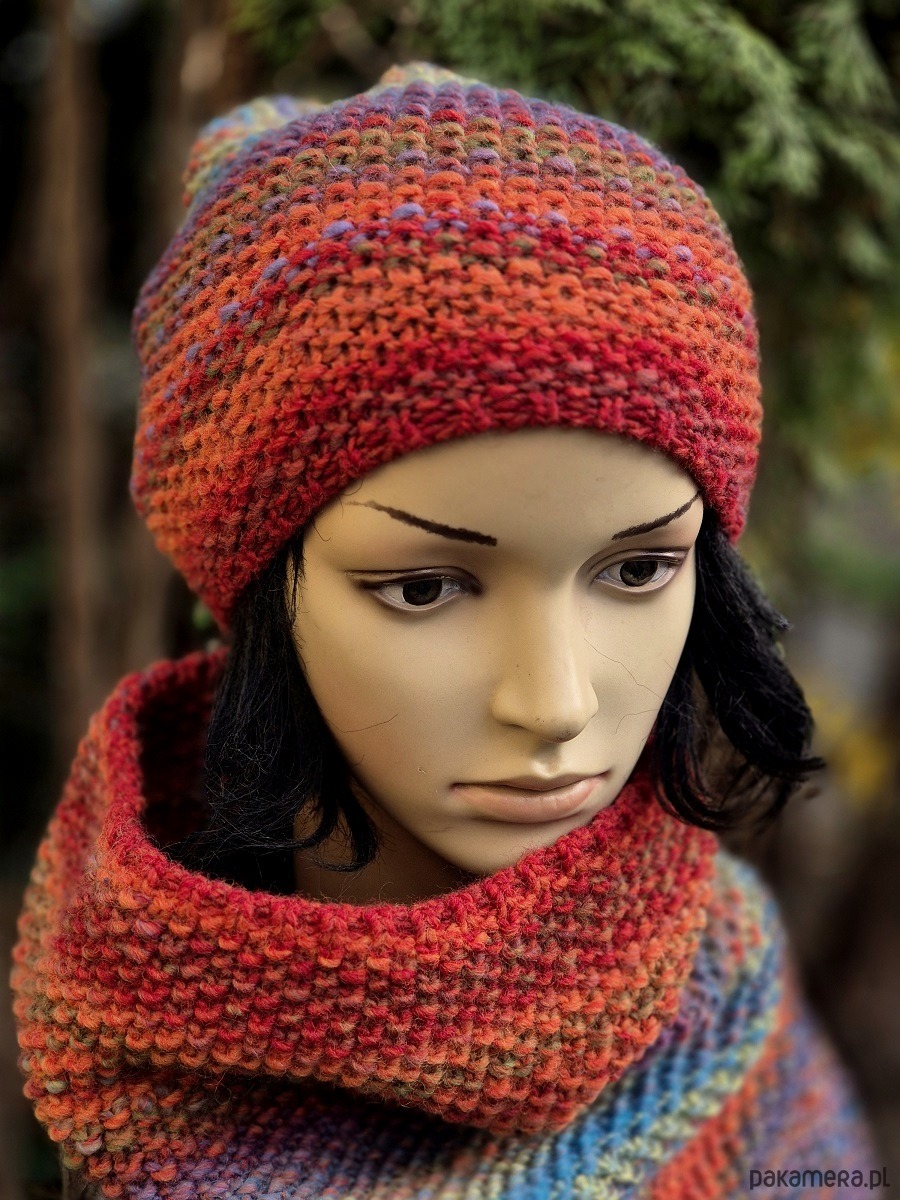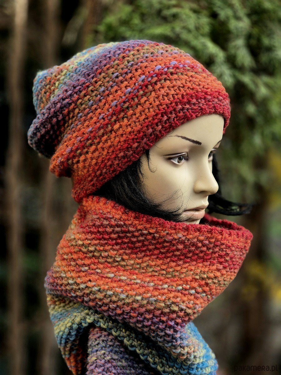 Ciepły, miękki ( wykonany niezbyt luźno, aby nie hulał po nim wiatr :) ) i przyjemny w dotyku komplet wykonany ręcznie na drutach z rewelacyjnej włóczki prod. hiszpańskiej ( 53% wool, 47% akryl)