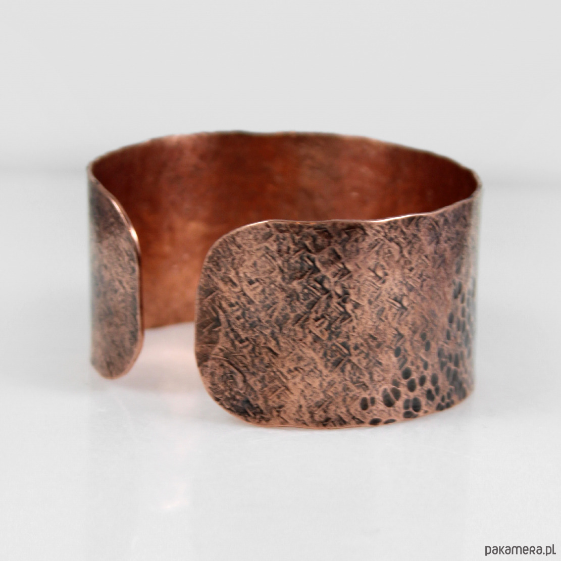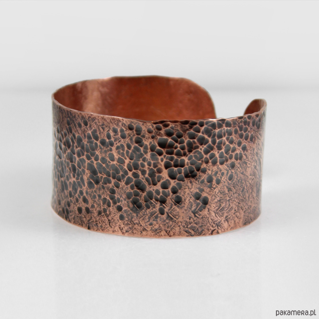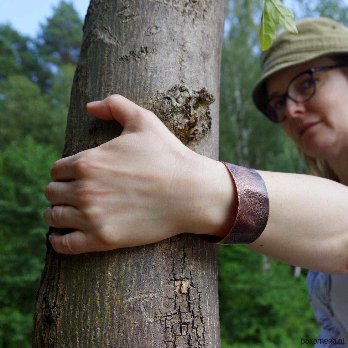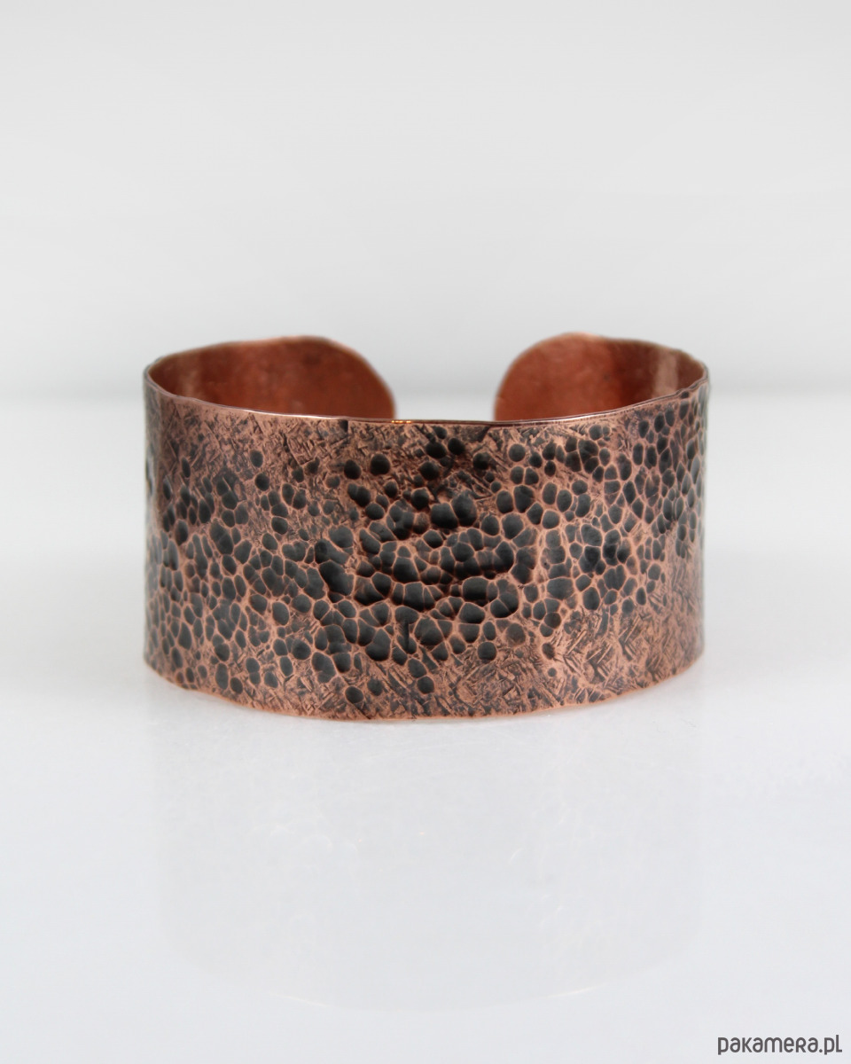 Bransoletka została wykonana w całości z miedzi, ma ok 3 cm szerokości i ok 17 cm długości. Rozmiar uniwersalny - pasuje praktycznie na każdy nadgarstek.