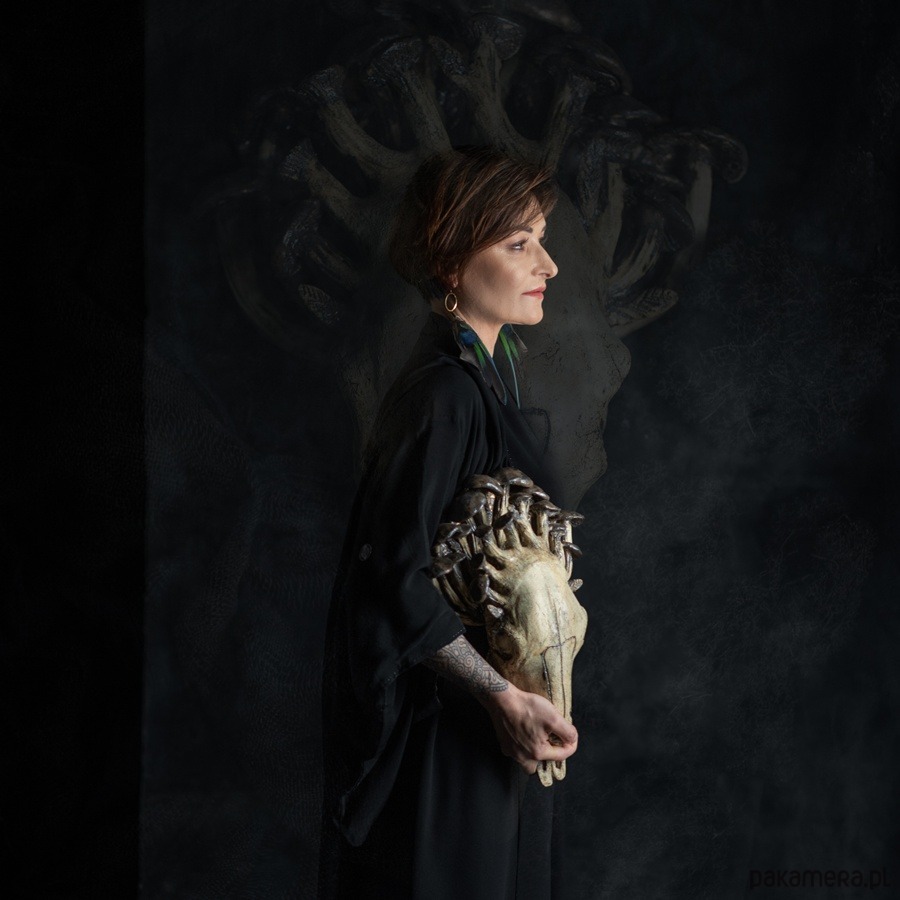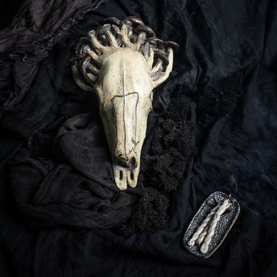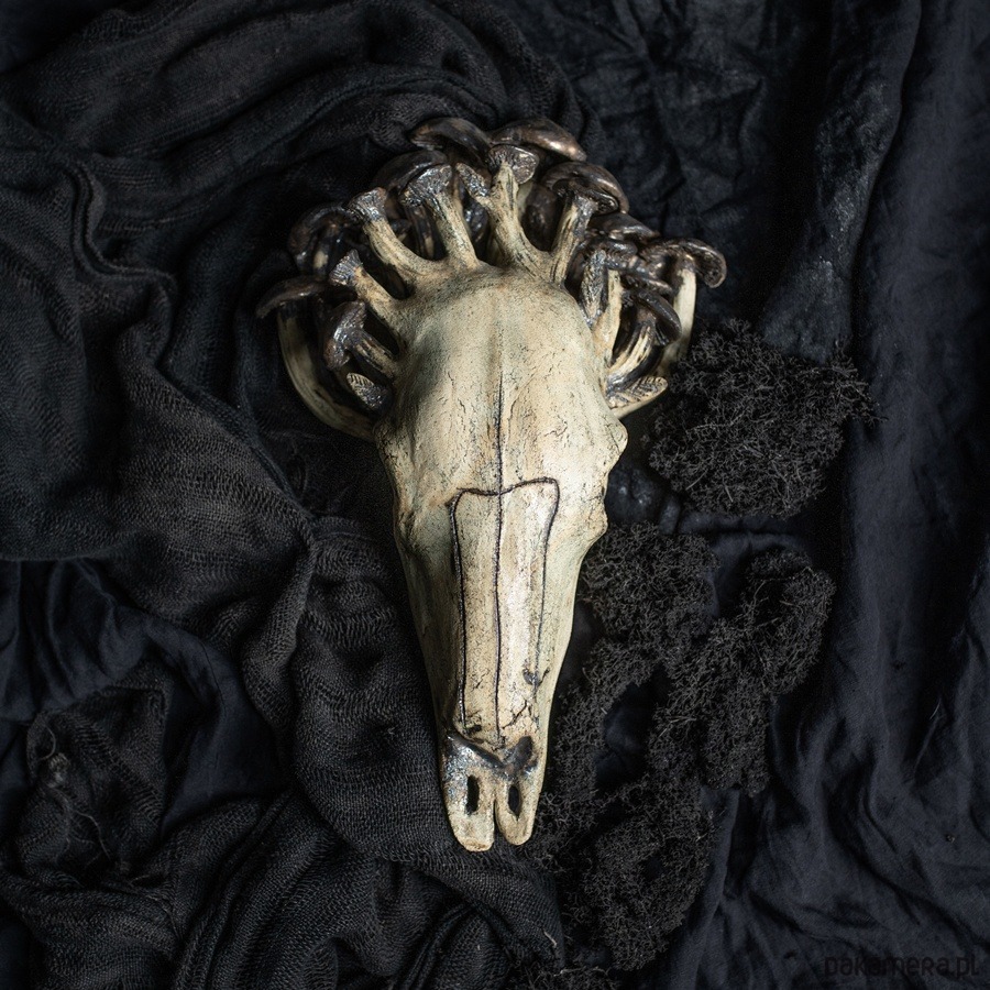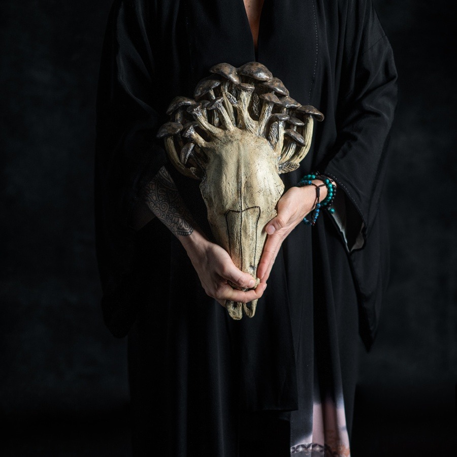 Ręcznie wykonana rzeźba ceramiczna przedstawiająca czaszkę byka, której naturalne rogi zastąpiły organiczne, niemal baśniowe grzyby. Ta praca powstała z intencją przypomnienia o przemijaniu, delikatności życia oraz o możliwości tworzenia „trofeów”, które nie wymagają zabierania go żadnym istotom. To manifest przeciwko zabijaniu dla ozdoby — symbol natury, która odradza się w nowych formach, jeśli tylko damy jej przestrzeń.