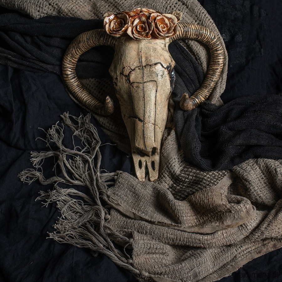 Róże, wyrastające z formy kości, stają się metaforą życia, które mimo przemijania nadal może rozkwitać w naszej wyobraźni. Każdy szczegół — od precyzyjnych krzywizn rogów po płatki kwiatów — został wykonany z wyjątkowym skupieniem i starannością, tworząc rzeźbę o charakterze kolekcjonerskim.