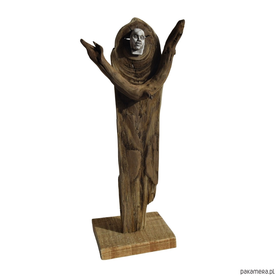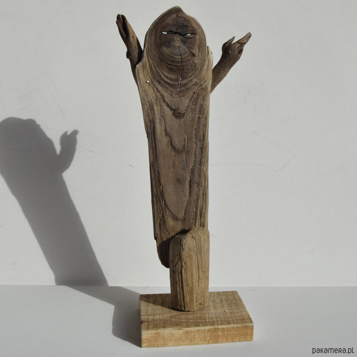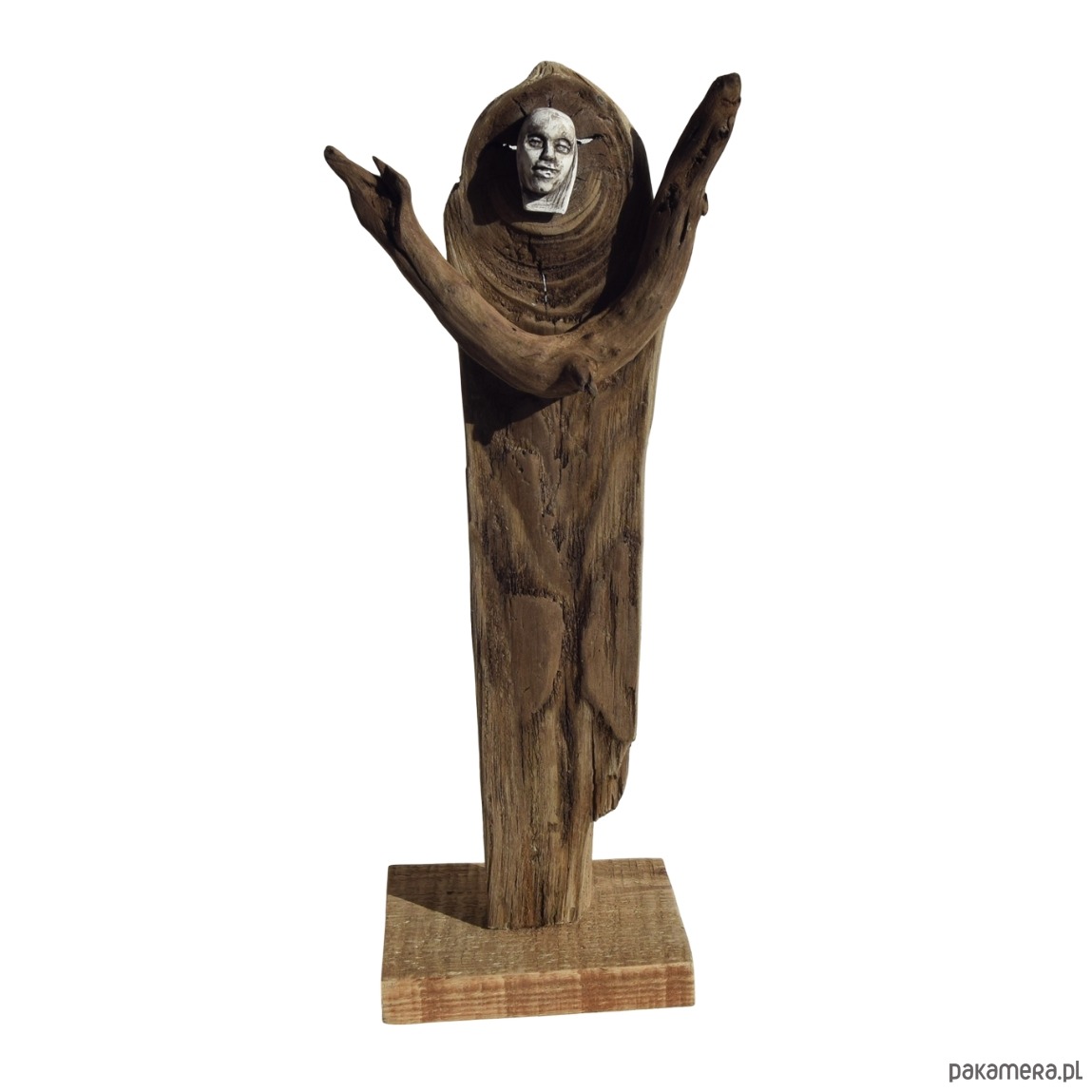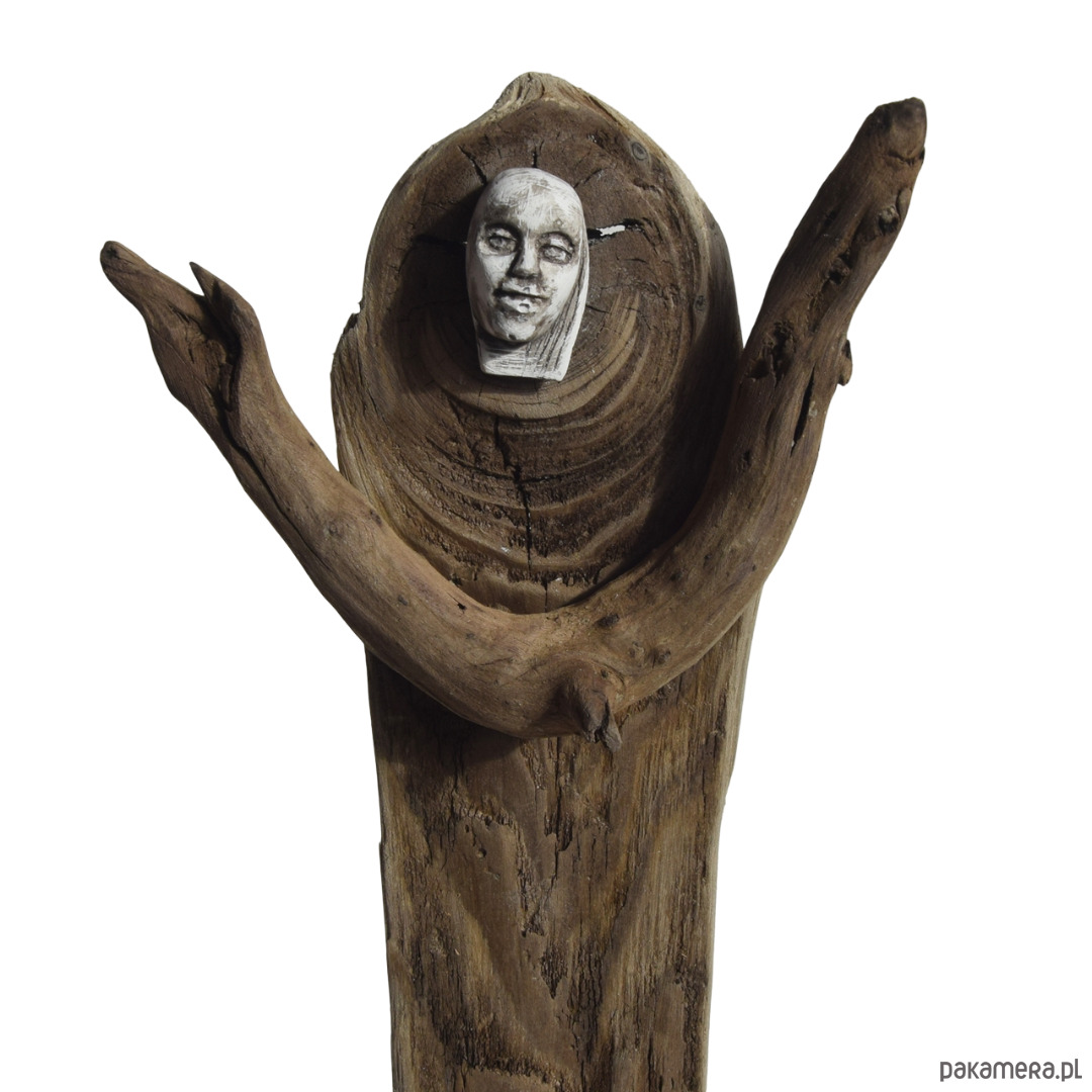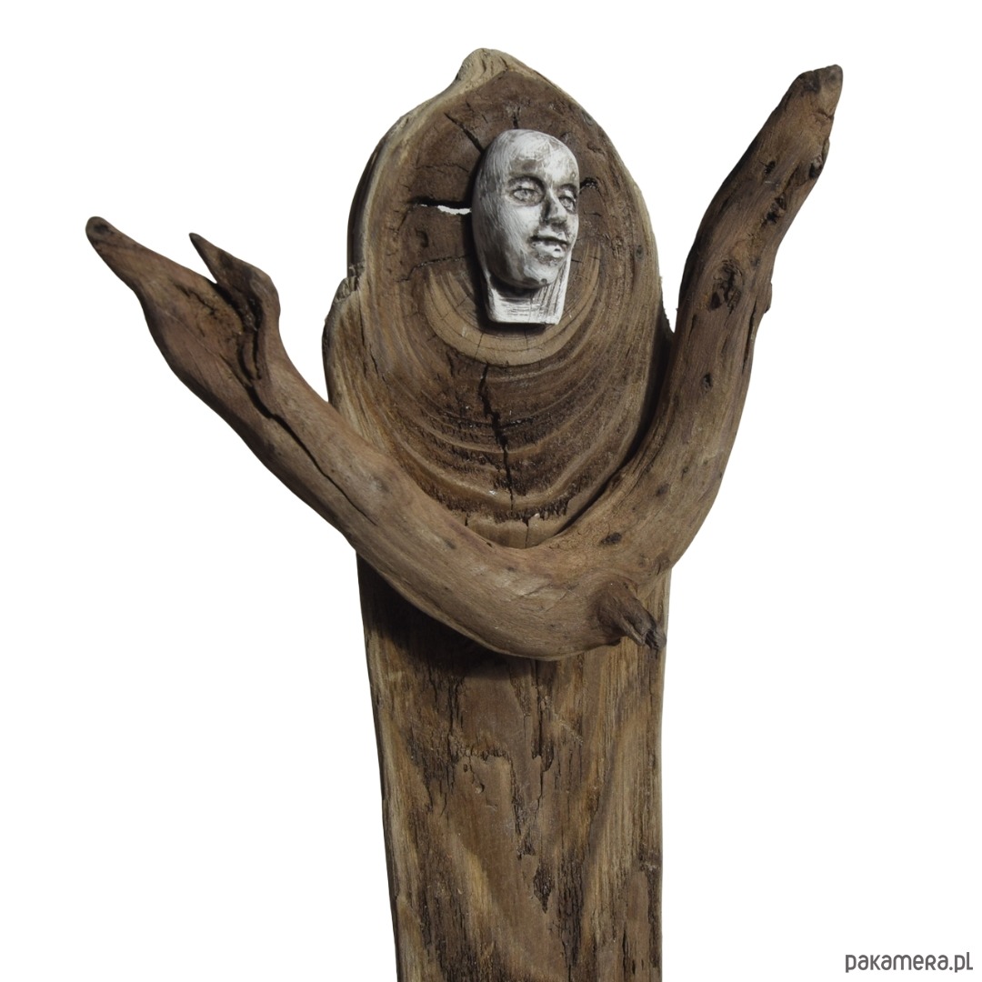 Rzeźba/ figurka - abstrakcyjna postać, dekoracja wykonana ze znalezionego na bałtyckiej plaży starego drewna, oraz gipsu, z podstawą z drewna ze starej deski. Niepowtarzalny kształt wyrzeźbionego przez wodę i czas drewna sprawia, że rzeźba jest unikatowa - jedyny, niepowtarzalny egzemplarz. Wykorzystaniem starego drewna z jego niedoskonałościami dekoracja nawiązuje do stylu wabi-sabi.