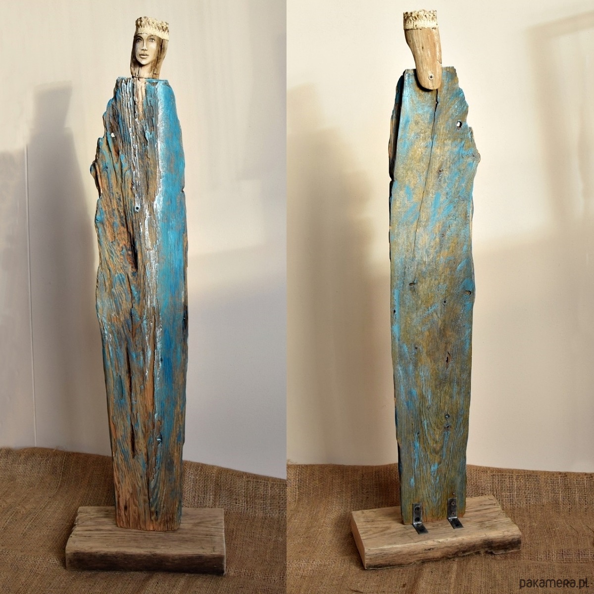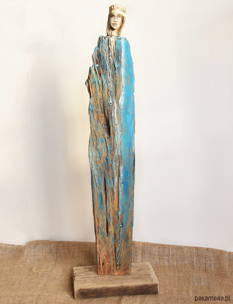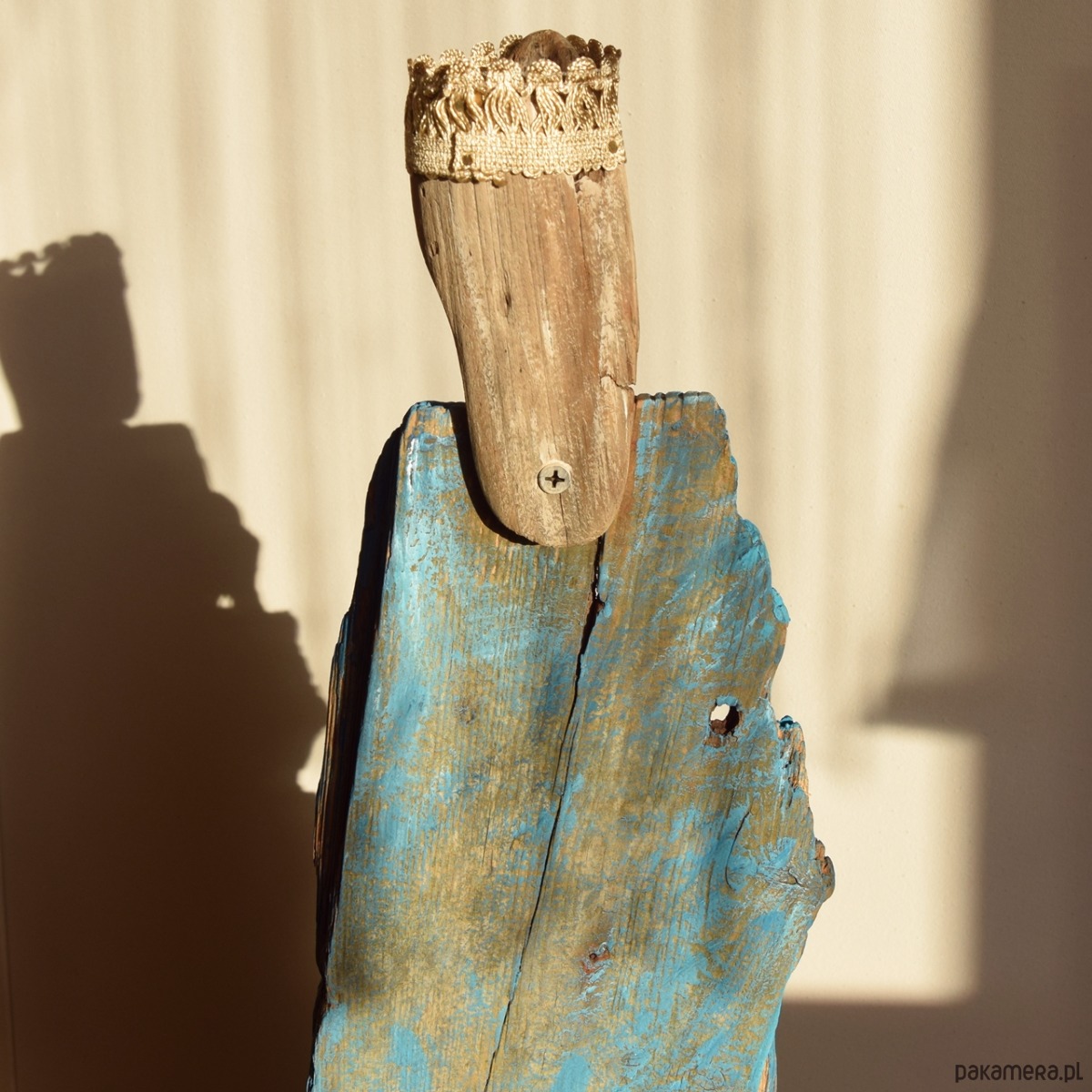 Rzeźba - postać/ dekoracja wykonana ze znalezionych na bałtyckiej plaży starych desek i drewna. Malowana farbami akrylowymi, częściowo tylko "przecierana" farbą by pozostawić część surowego, starego drewna. Niepowtarzalny kształt wyrzeźbionego przez wodę i czas drewna, z jego niedoskonałościami i pęknięciami, pozostałościami po gwoździach sprawia, że rzeźba jest unikatowa - jedyny egzemplarz.