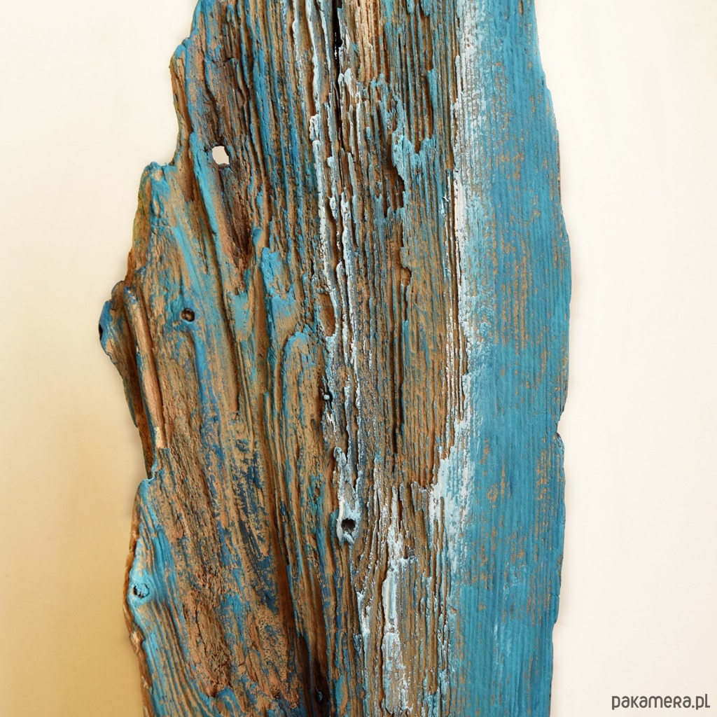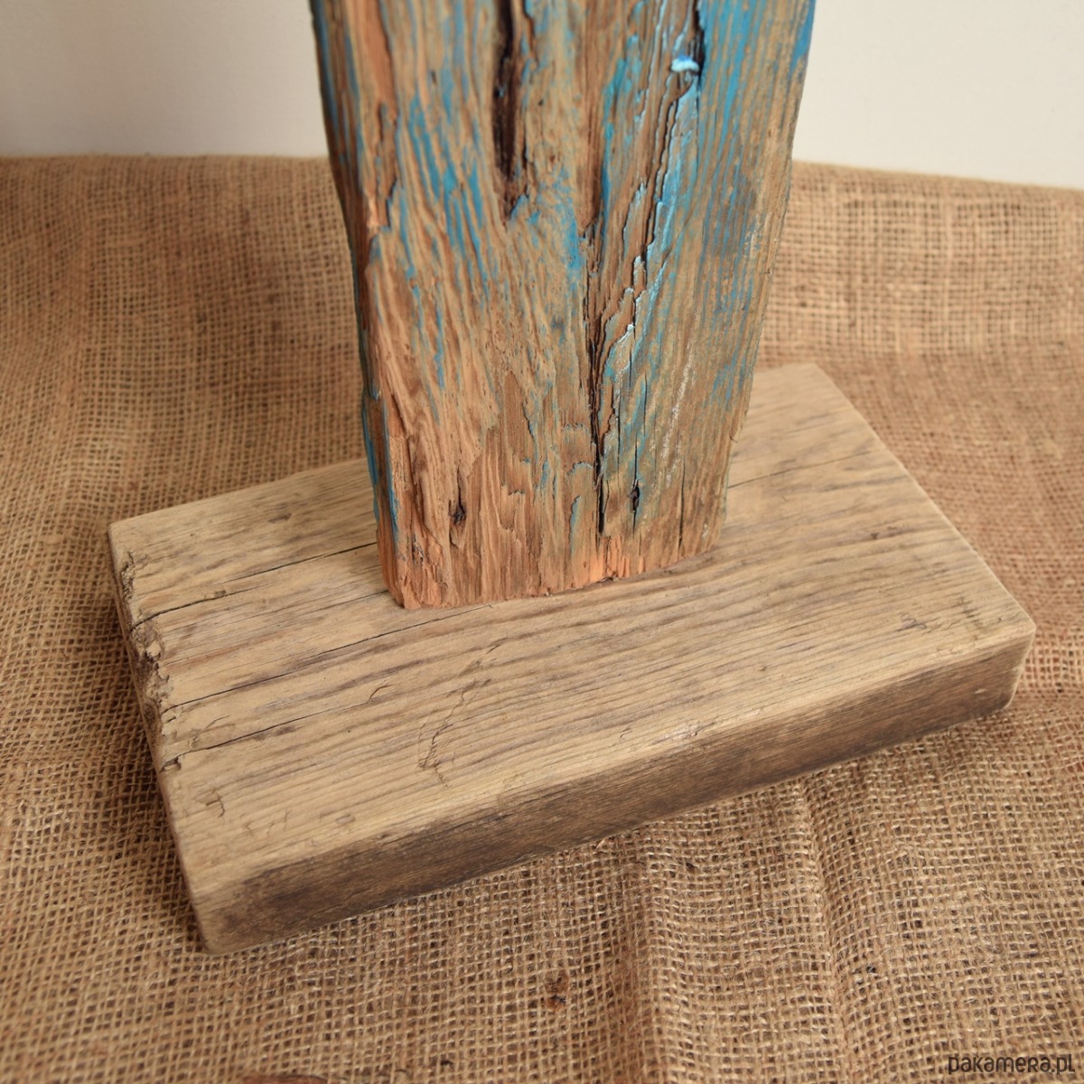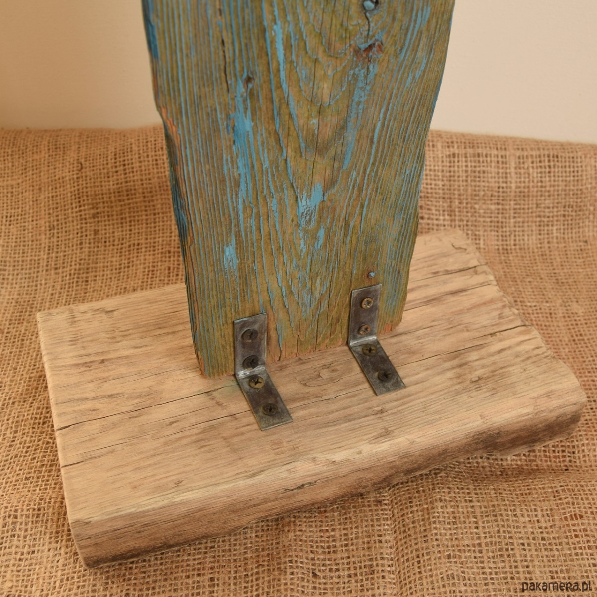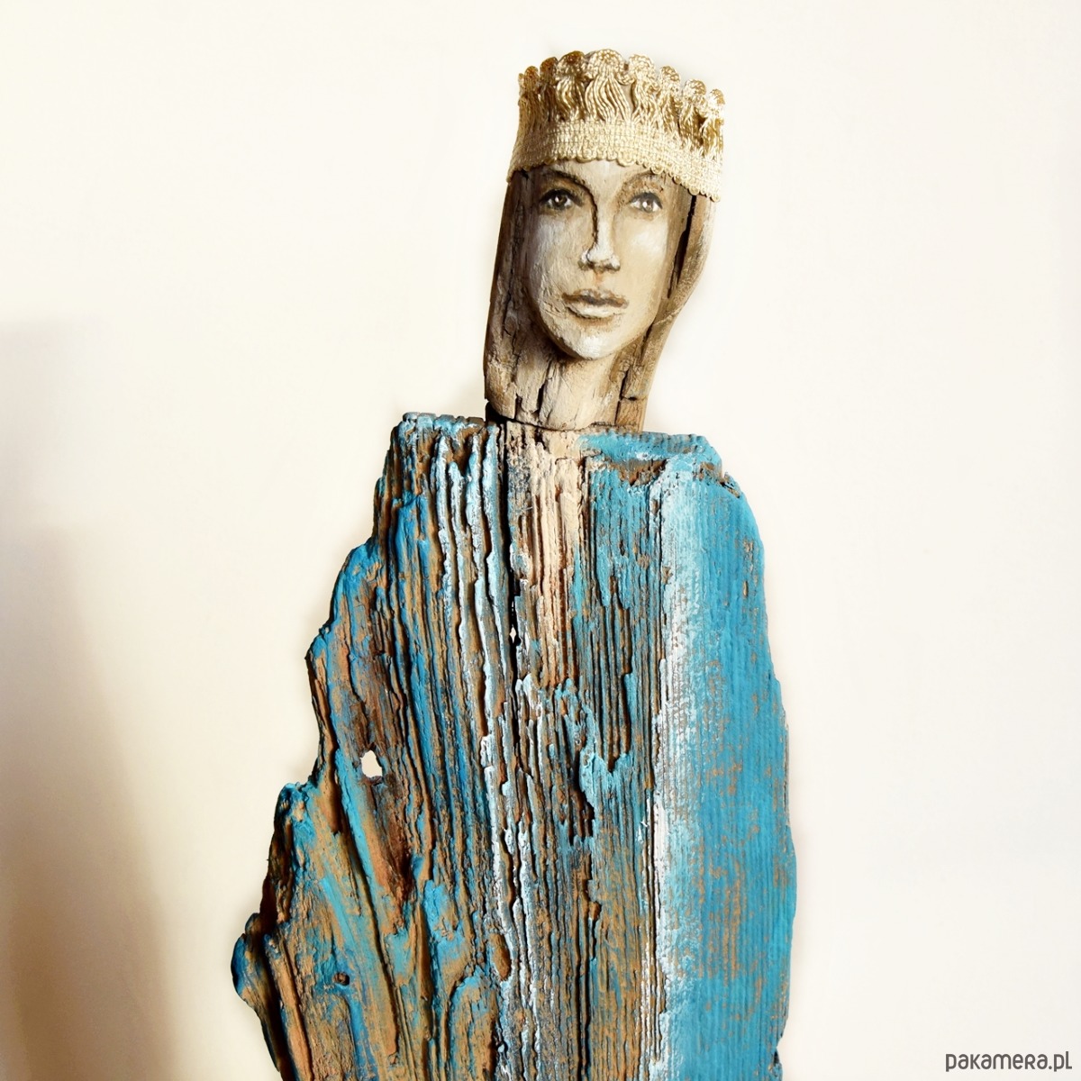 Rzeźba - postać/ dekoracja wykonana ze znalezionych na bałtyckiej plaży starych desek i drewna. Malowana farbami akrylowymi, częściowo tylko "przecierana" farbą by pozostawić część surowego, starego drewna. Niepowtarzalny kształt wyrzeźbionego przez wodę i czas drewna, z jego niedoskonałościami i pęknięciami, pozostałościami po gwoździach sprawia, że rzeźba jest unikatowa - jedyny egzemplarz.