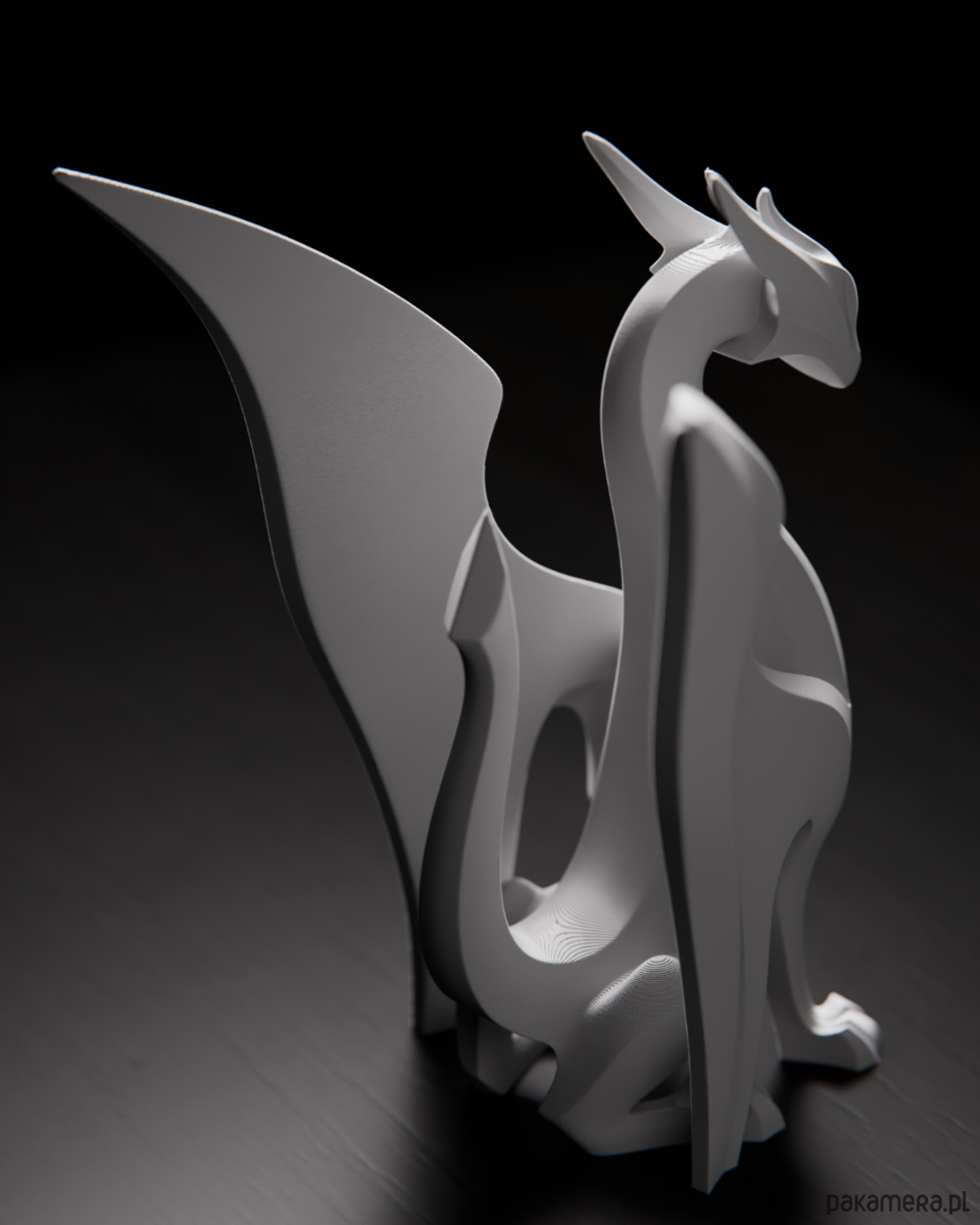 Rzeźba DRAGON to nowoczesna interpretacja klasycznej sylwetki smoka. Jej smukła, dumna postawa, połączona z ostro zarysowanymi krawędziami skrzydeł i ogona, nadaje bryle niezwykłej dynamiki oraz elegancji. Dzięki harmonijnemu połączeniu gładkich, zaokrąglonych płaszczyzn z wyraźnymi, geometrycznymi detalami, rzeźba plastycznie pracuje z domowym światłem, wydobywając z formy głębokie, trójwymiarowe cienie.