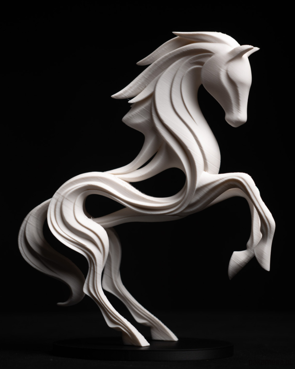 Rzeźba HORSE to niezwykle wyrafinowana interpretacja sylwetki stającego dęba konia. Jej falujące, organiczne linie – przywodzące na myśl unoszącą się na wietrze grzywę – nadają bryle nieskrępowanej energii i lekkości. Dzięki harmonijnemu połączeniu gładkich łuków z precyzyjnymi, smukłymi krawędziami, rzeźba fantastycznie reaguje na domowe światło, tworząc głębokie, trójwymiarowe kontrasty i miękkie cienie. Całość została osadzona na minimalistycznej, czarnej podstawie, co dodatkowo podkreśla jej elegancki charakter.