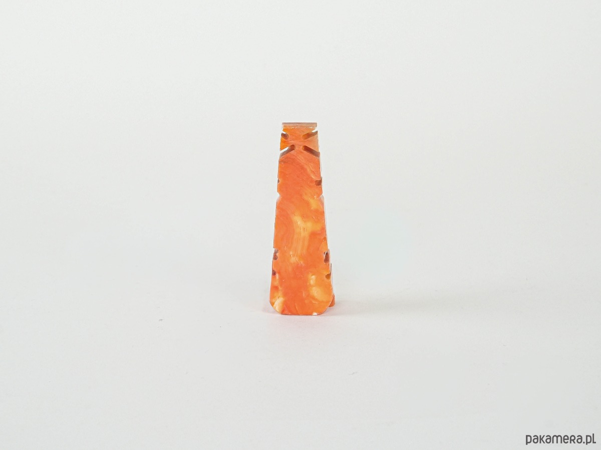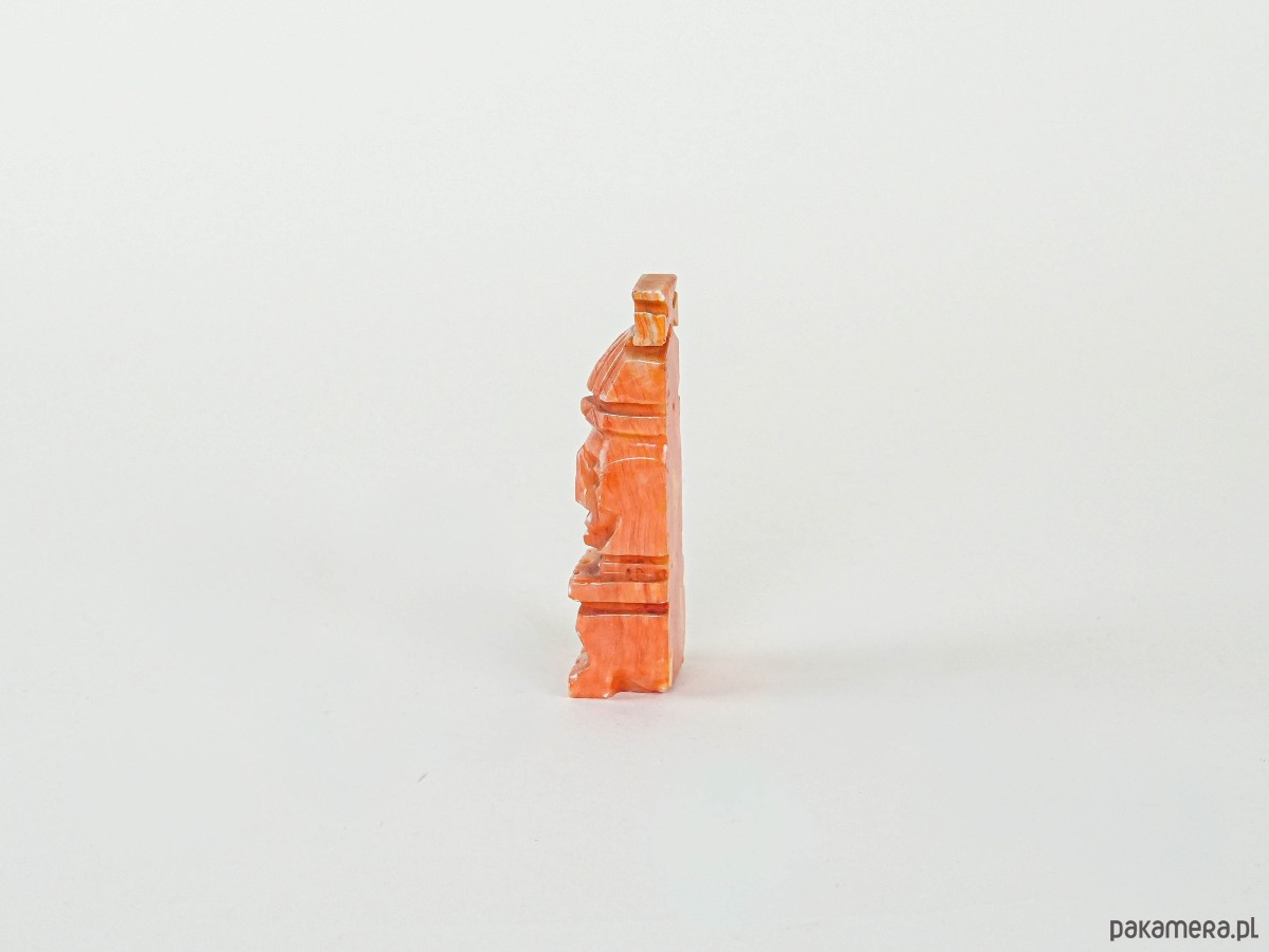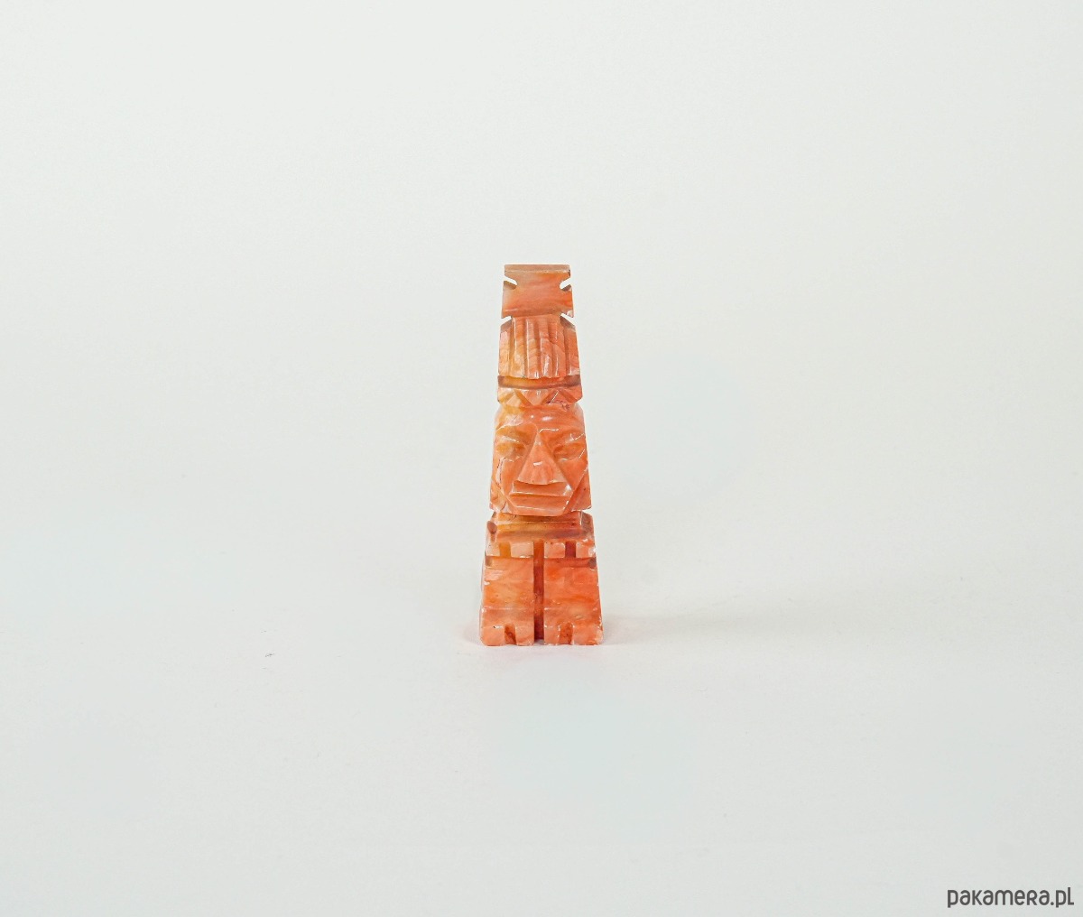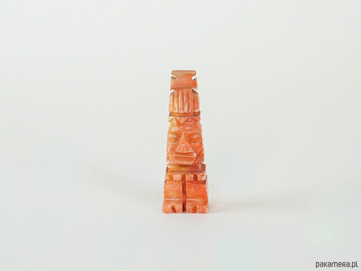 Rzeźba dekoracyjna wykonana z barwionego na odcienie pomarańczy i czerwieni kamienia (prawdopodobnie onyksu lub alabastru), przedstawiająca stylizowaną twarz w formie geometrycznej, przypominającą motywy sztuki prekolumbijskiej. Pochodzi najpewniej z lat 70.–80. XX wieku i jest przykładem popularnych w tym czasie pamiątek i dekoracji inspirowanych kulturami Ameryki Środkowej. Nasycona barwa i wyrazista forma czynią z niej efektowny akcent w aranżacji wnętrza.