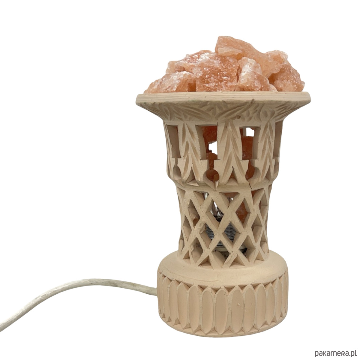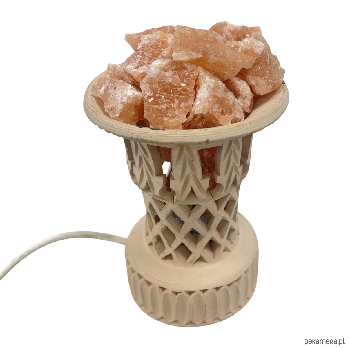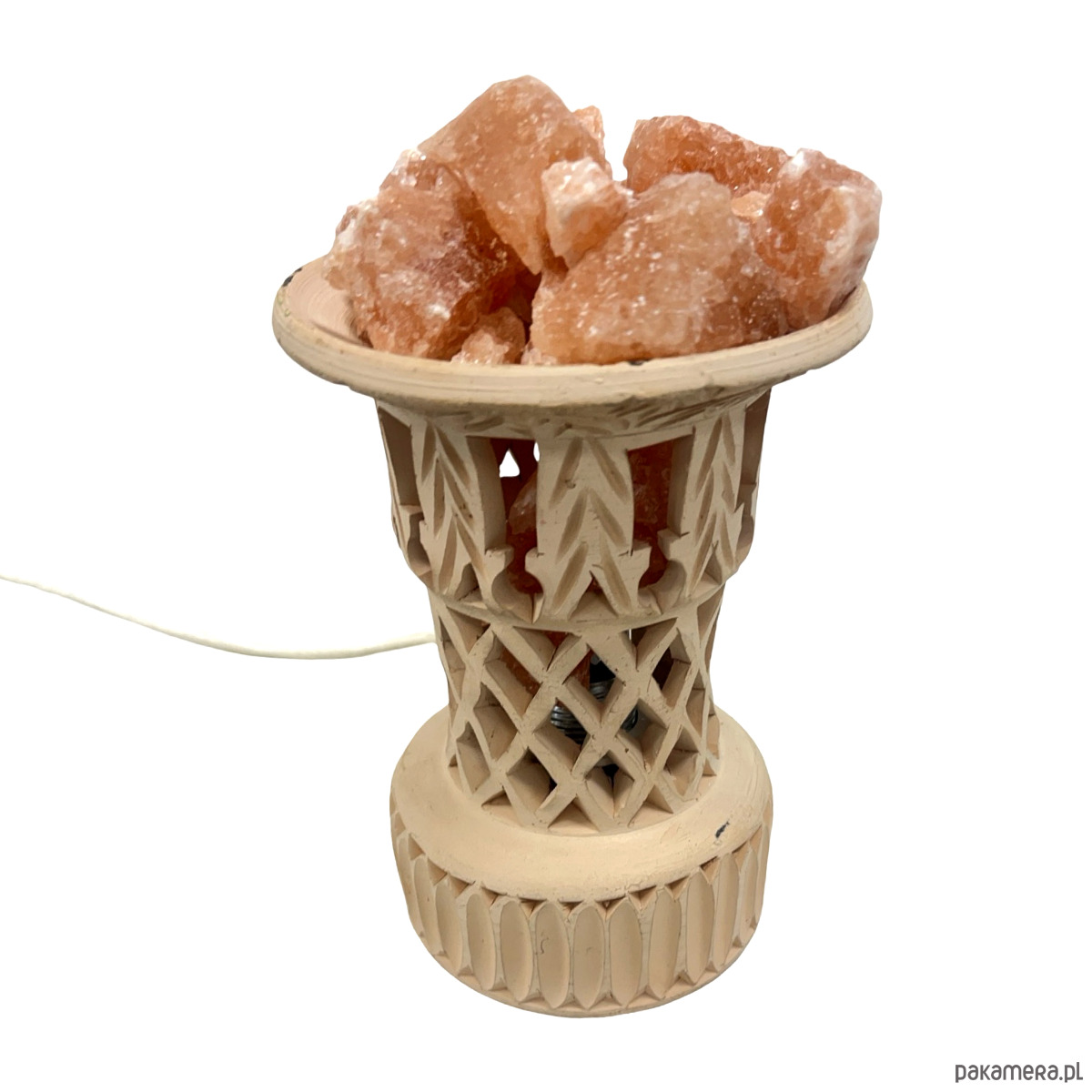 Dekoracyjna lampa solna wykonana z naturalnej, ręcznie rzeźbionej podstawy kamiennej, zwieńczona bryłkami różowej soli kamiennej. Ażurowa forma podstawy nadaje całości lekkości i sprawia, że światło subtelnie przenika przez strukturę kamienia, tworząc ciepły, nastrojowy efekt.