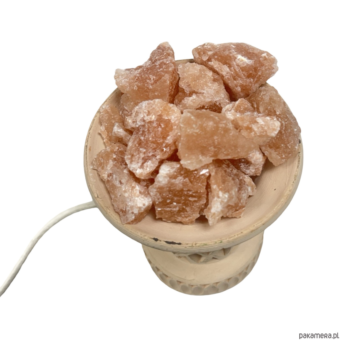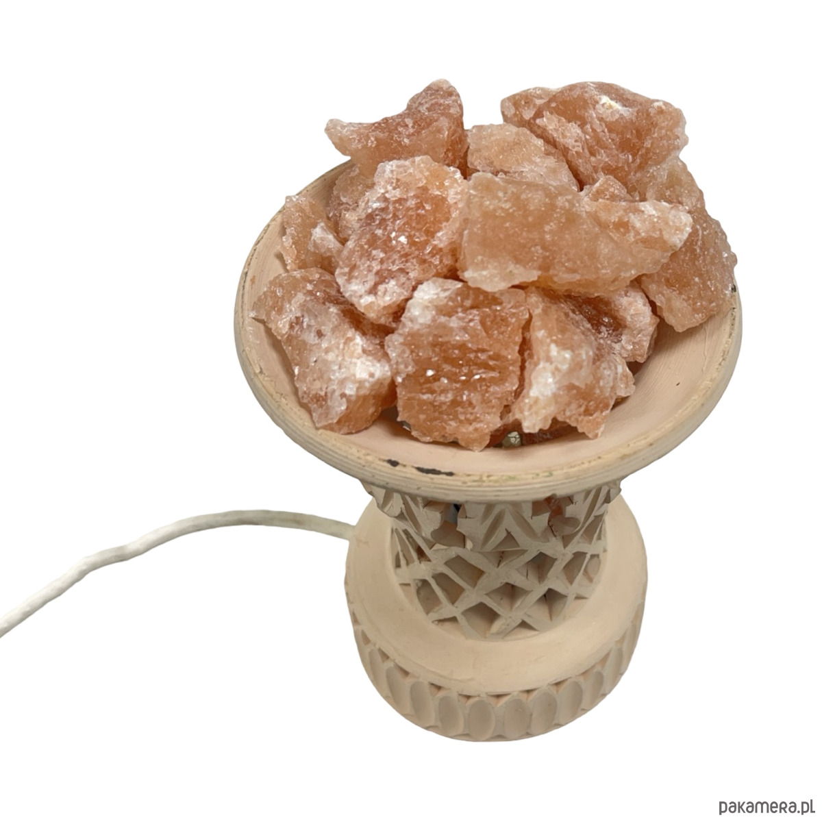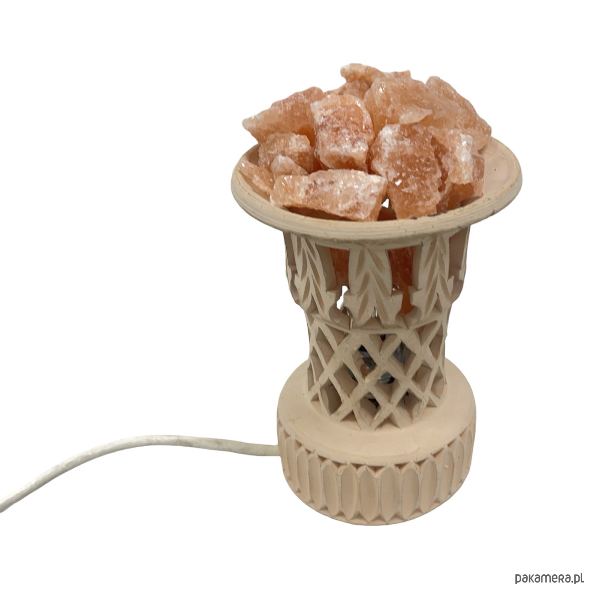 Dekoracyjna lampa solna wykonana z naturalnej, ręcznie rzeźbionej podstawy kamiennej, zwieńczona bryłkami różowej soli kamiennej. Ażurowa forma podstawy nadaje całości lekkości i sprawia, że światło subtelnie przenika przez strukturę kamienia, tworząc ciepły, nastrojowy efekt.